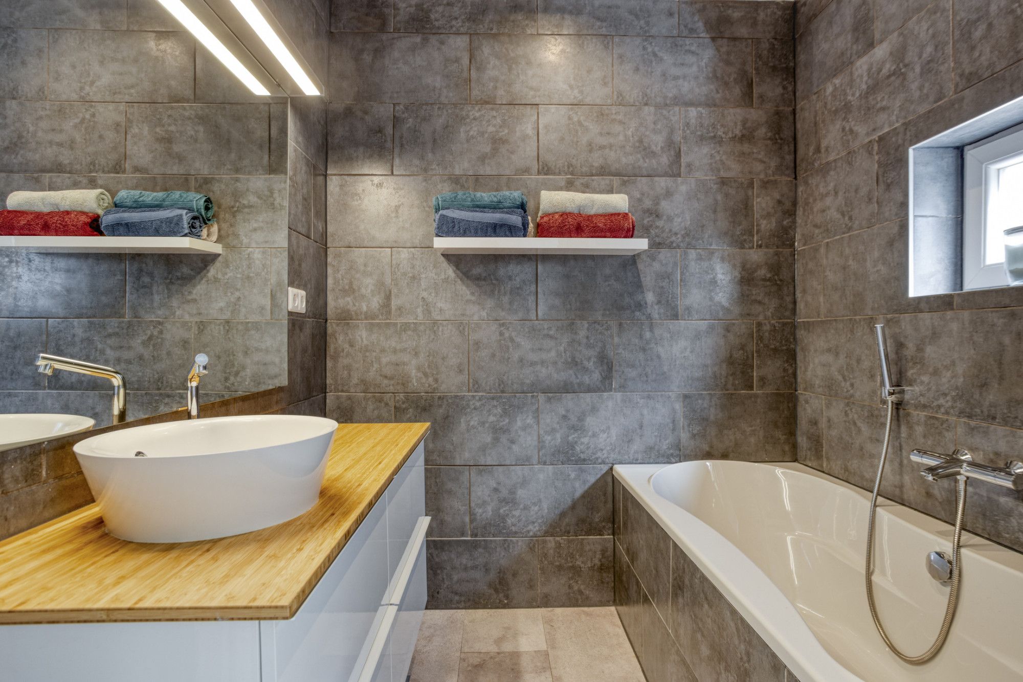 Uniek aan deze woning zijn de twee badkamers op de begane grond. De eerste badkamer is voorzien van een toilet, fonteintje, douche en aansluitingen voor de wasmachine. De tweede badkamer beschikt over een ligbad en een wastafel – ideaal voor gezinnen of logees.