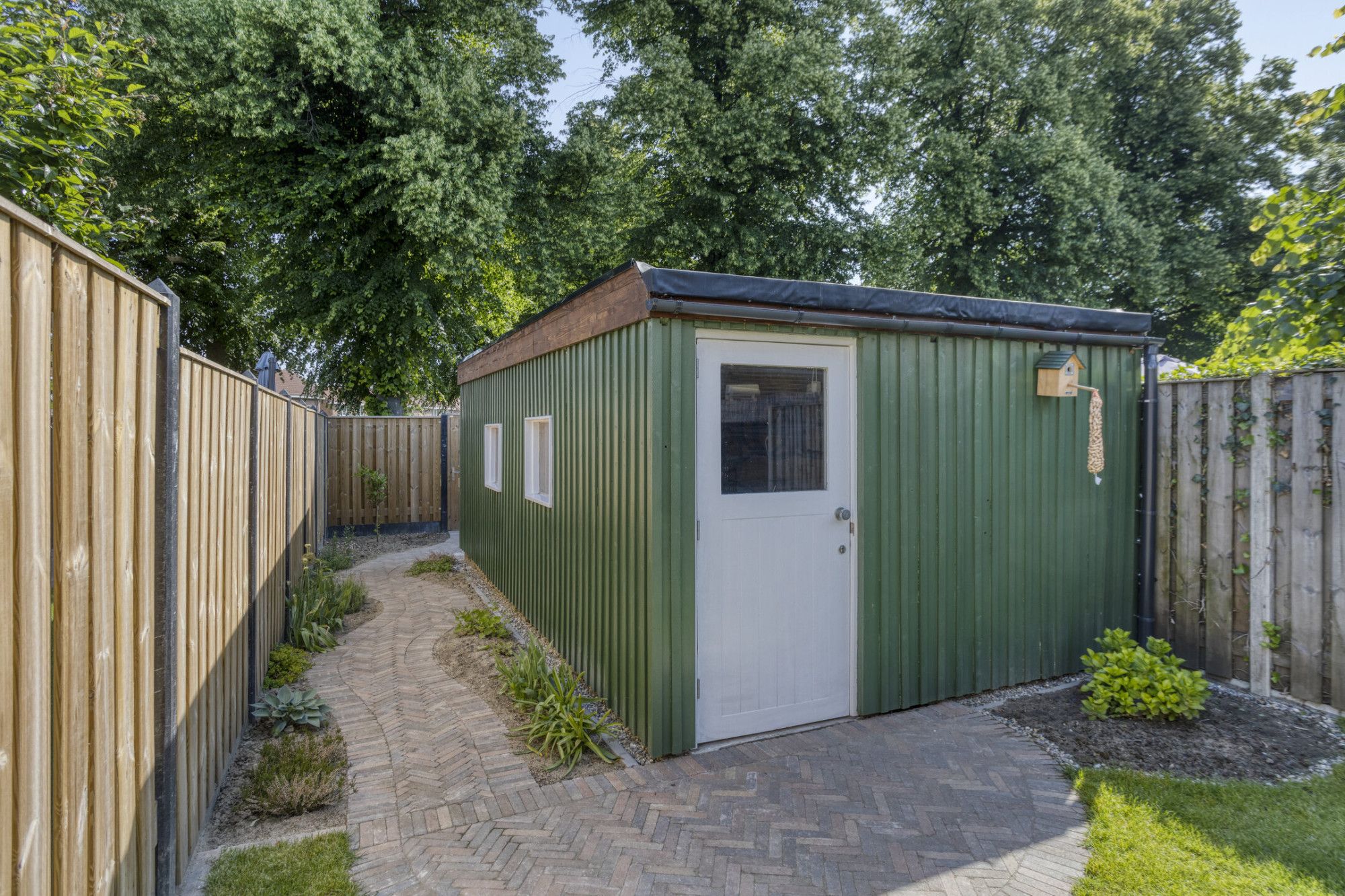 De onderhoudsvriendelijke tuin is netjes aangelegd en biedt toegang tot een royale berging die eenvoudig toegankelijk te maken is voor gebruik als garage.