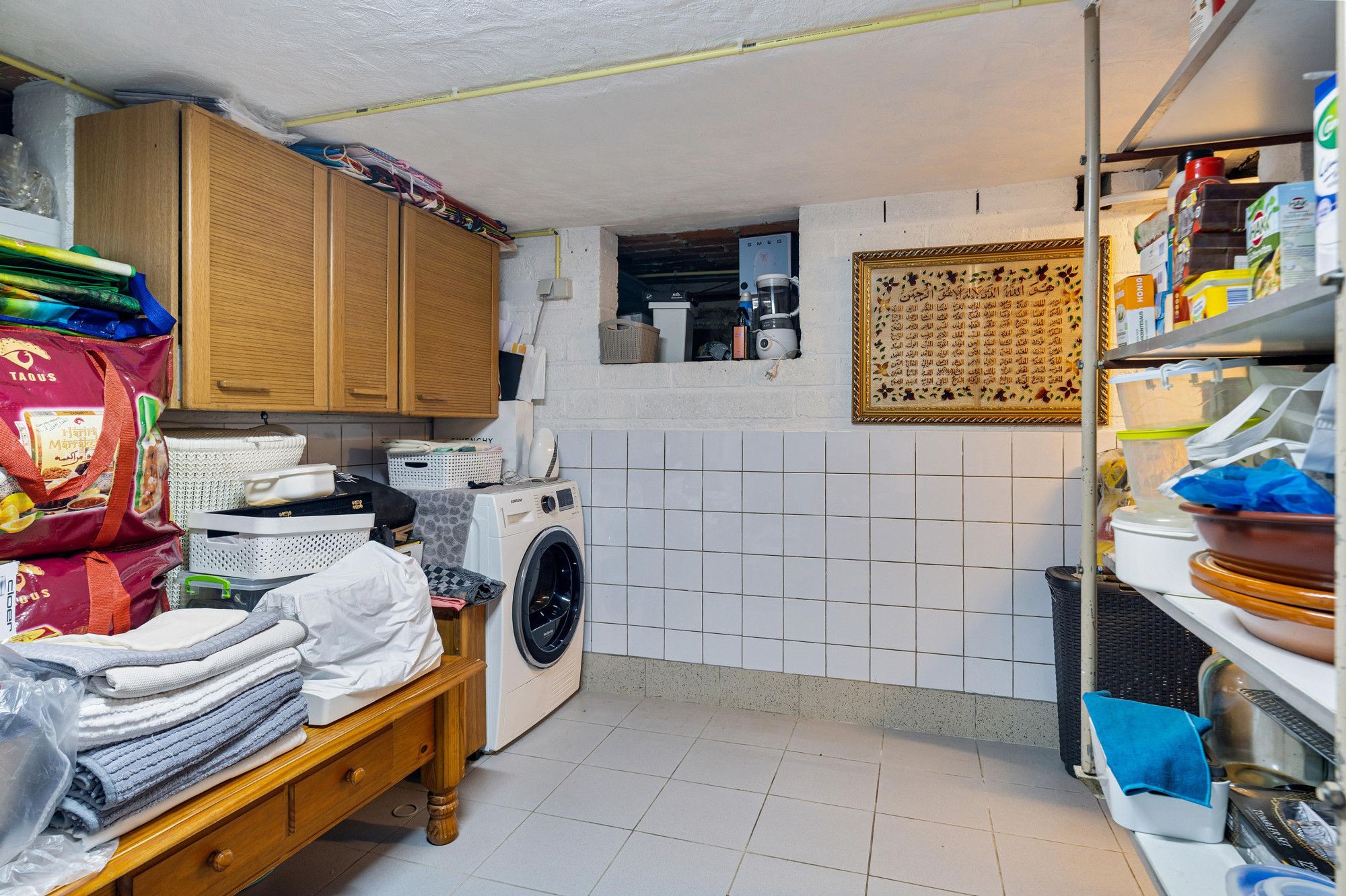 Provisieruimte met betegelde vloer, opstelplaats voor wasmachine en droger.