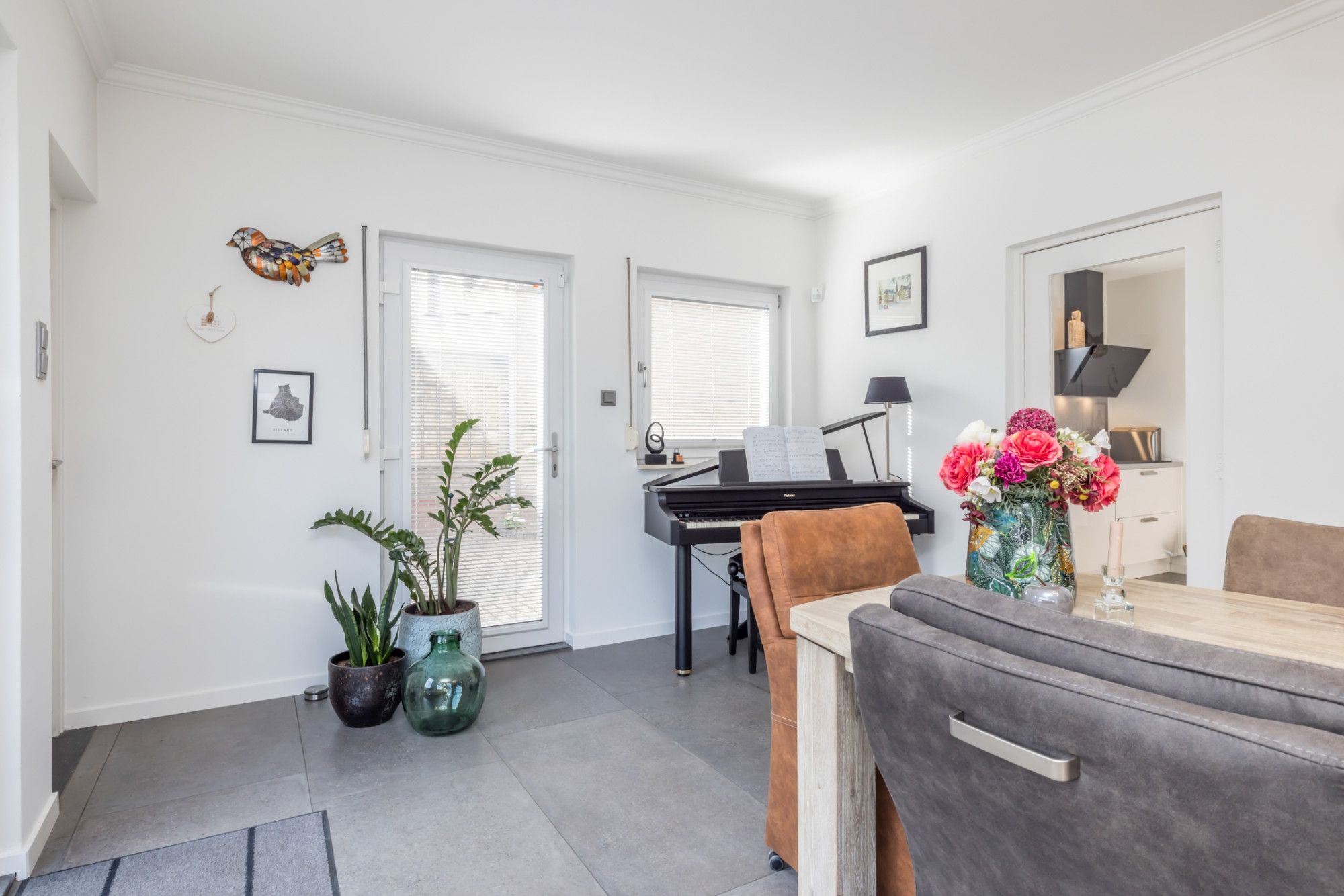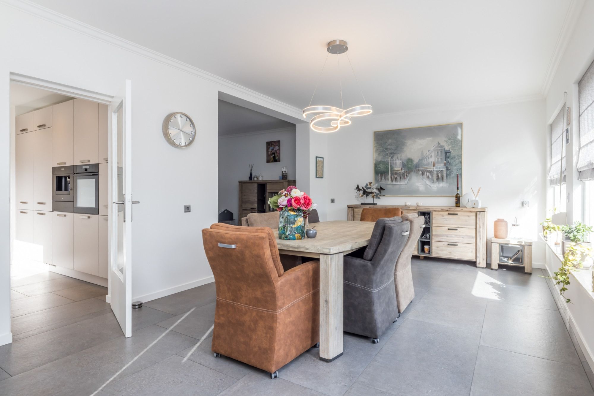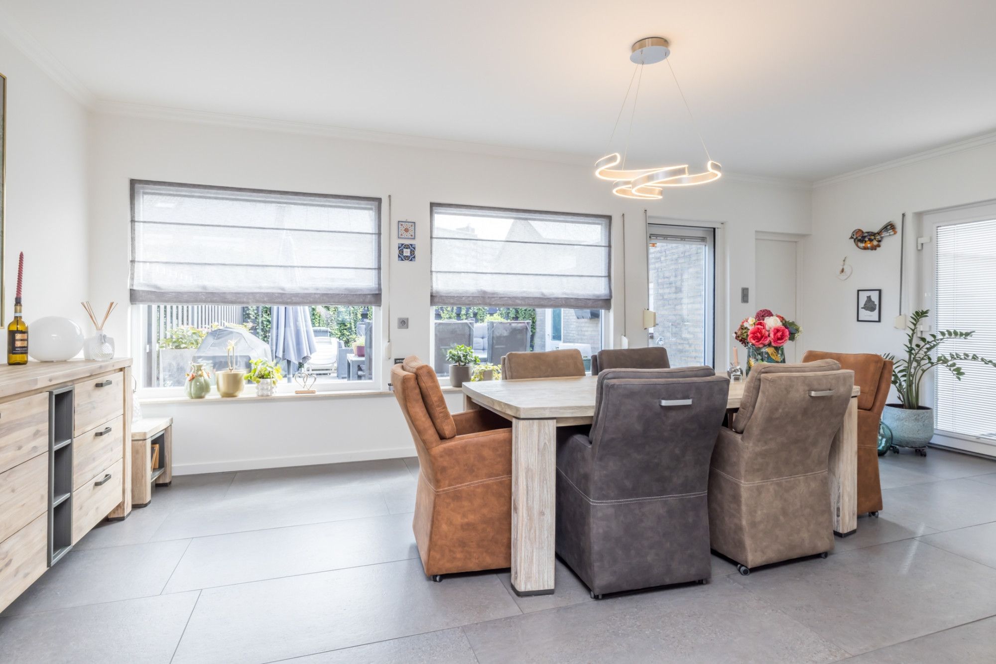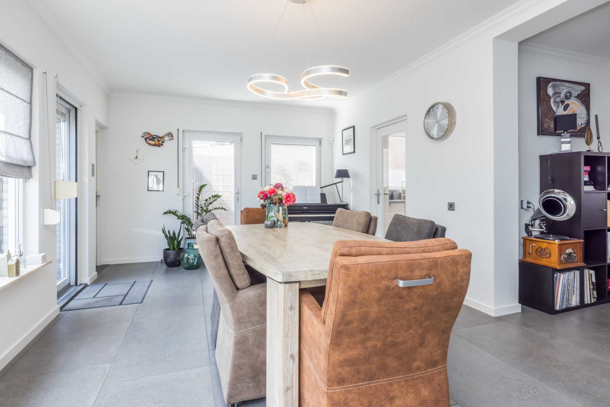 De ruime eetkamer in de aanbouw biedt toegang tot de garage, de achtertuin en de oprit. De dubbele garage is voorzien van een elektrische bedienbare sectionaalpoort en opstelling wasmachine. De achtertuin is omsloten en voorzien van een terras en natuurlijke aanplant.