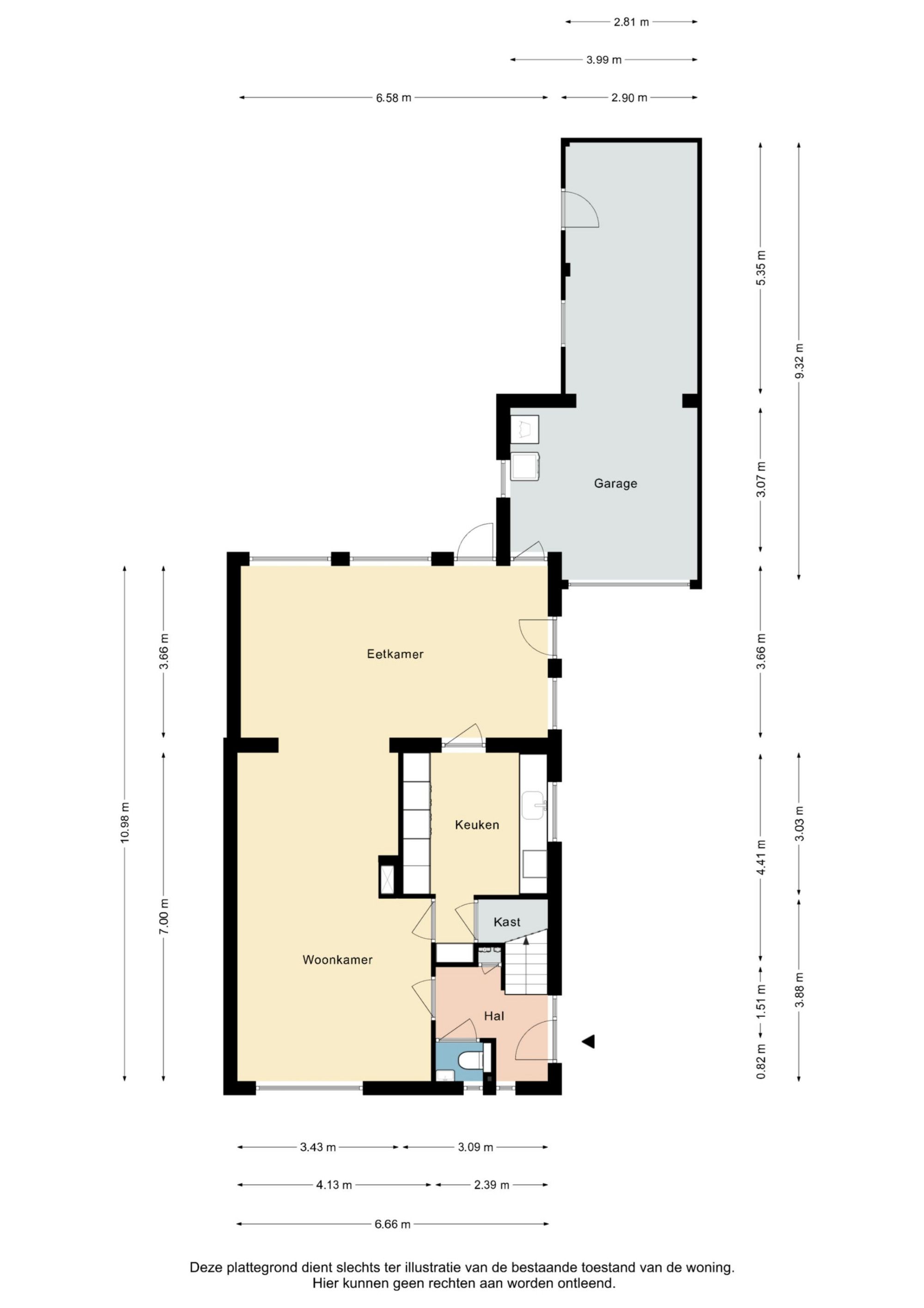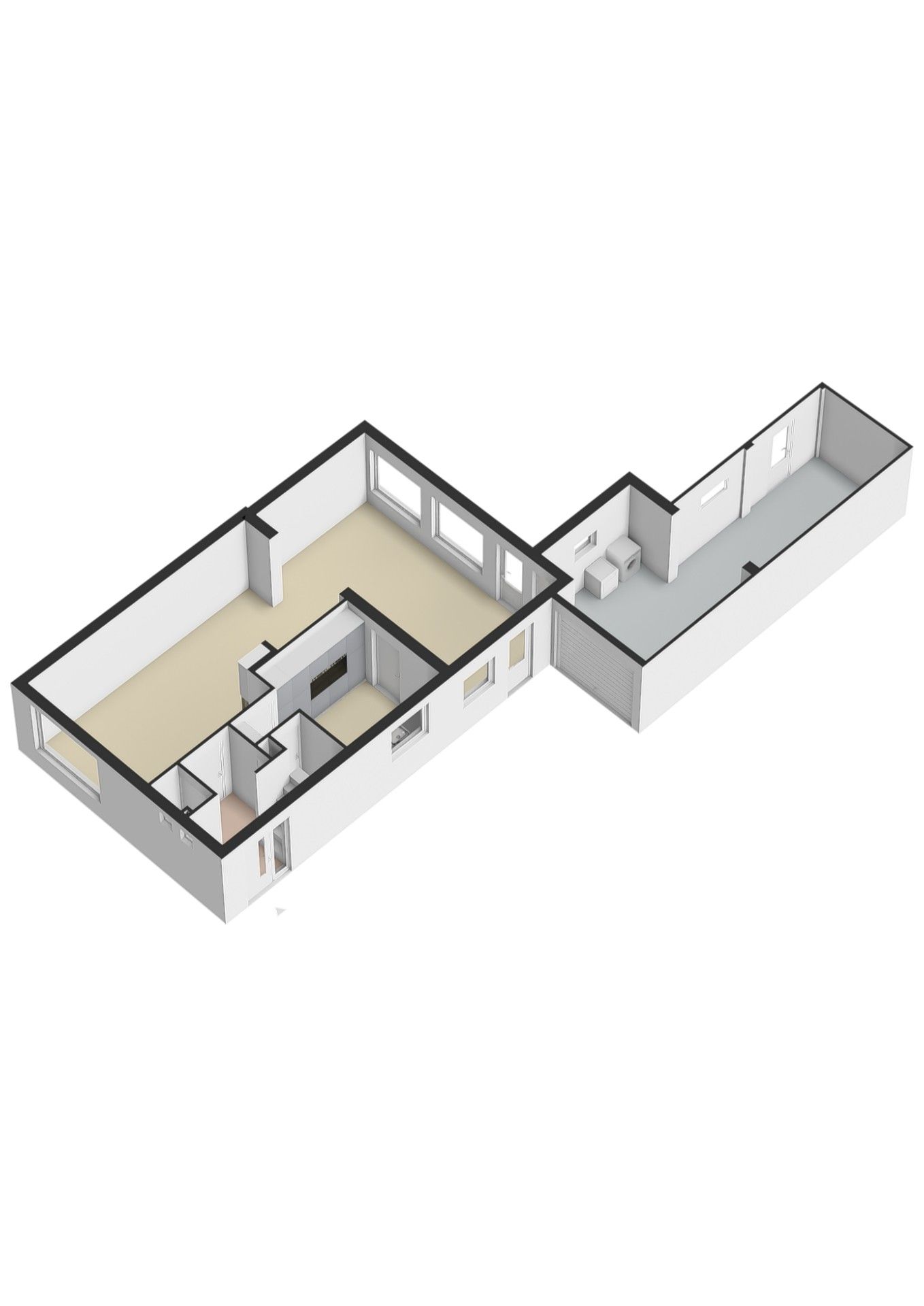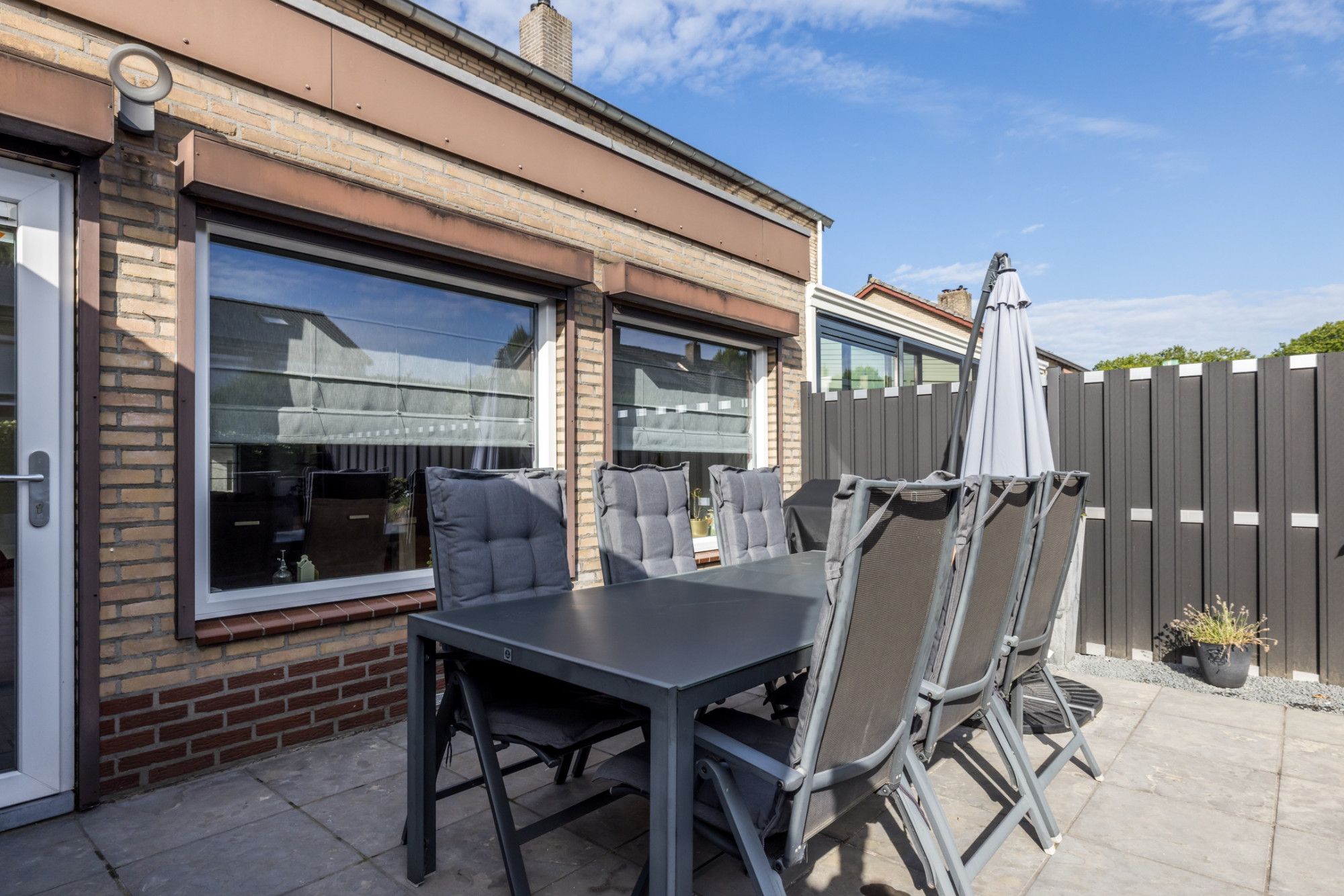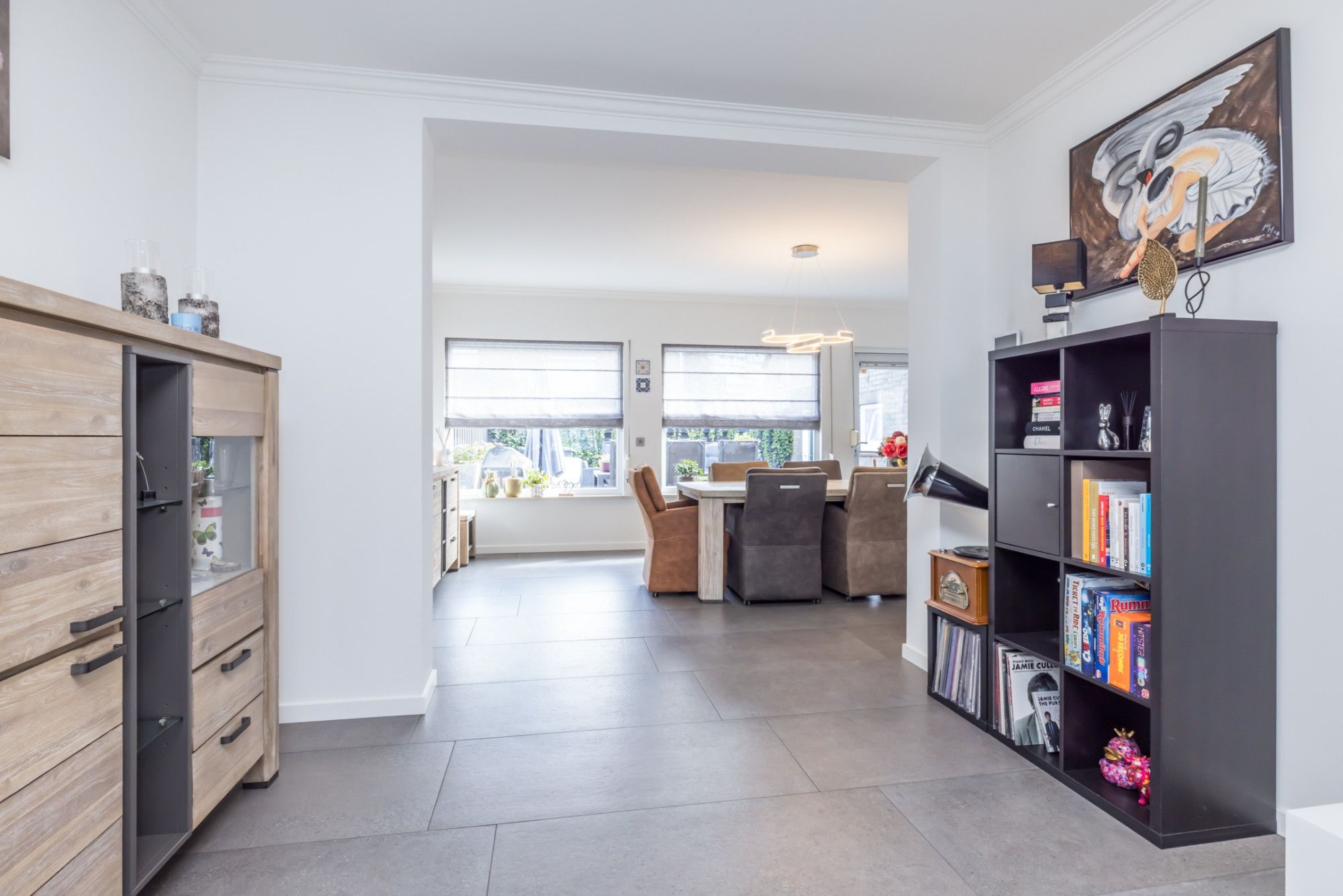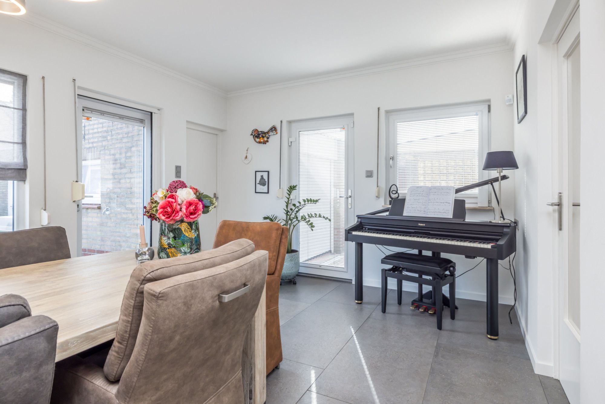 De ruime eetkamer in de aanbouw biedt toegang tot de garage, de achtertuin en de oprit. De dubbele garage is voorzien van een elektrische bedienbare sectionaalpoort en opstelling wasmachine. De achtertuin is omsloten en voorzien van een terras en natuurlijke aanplant.
