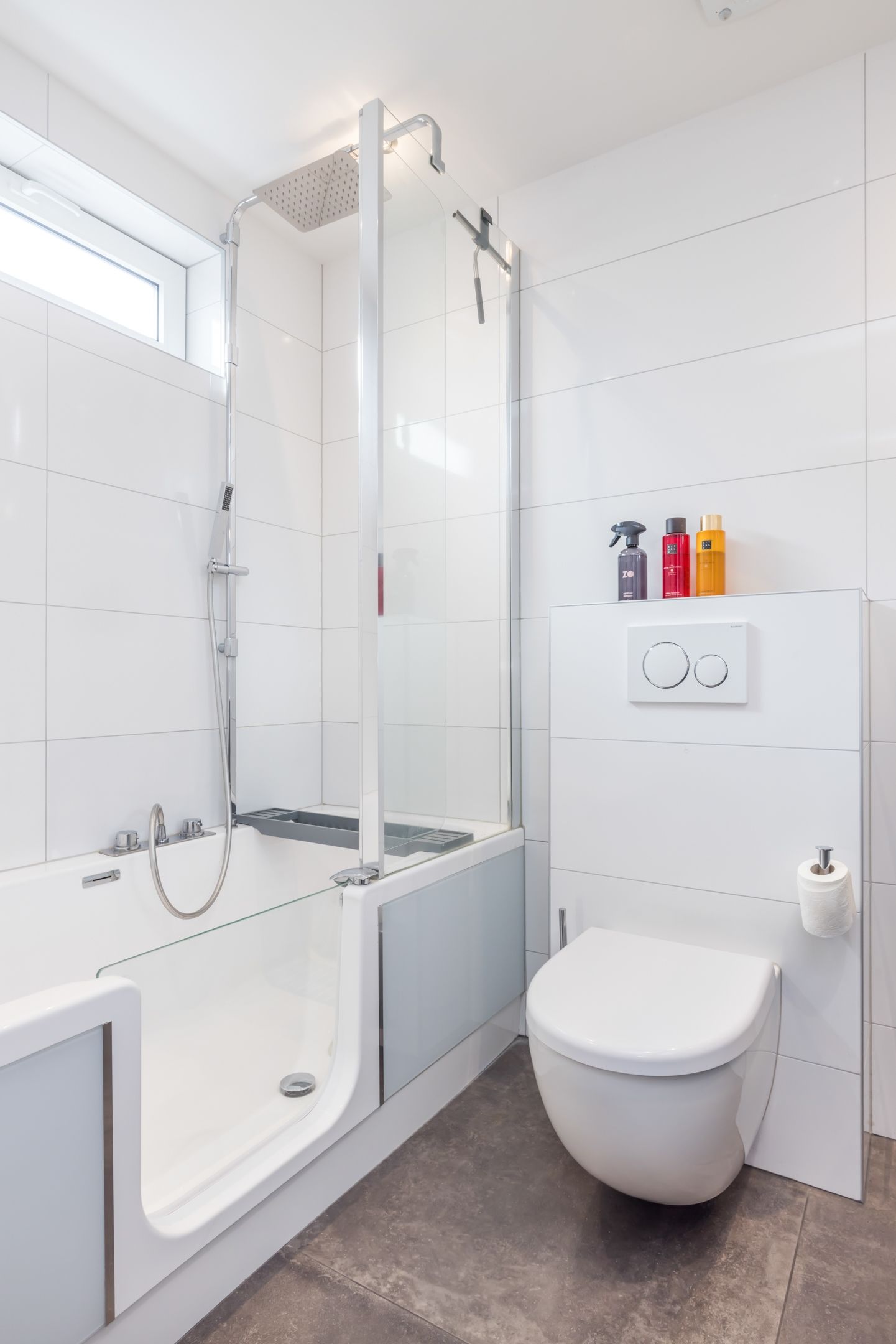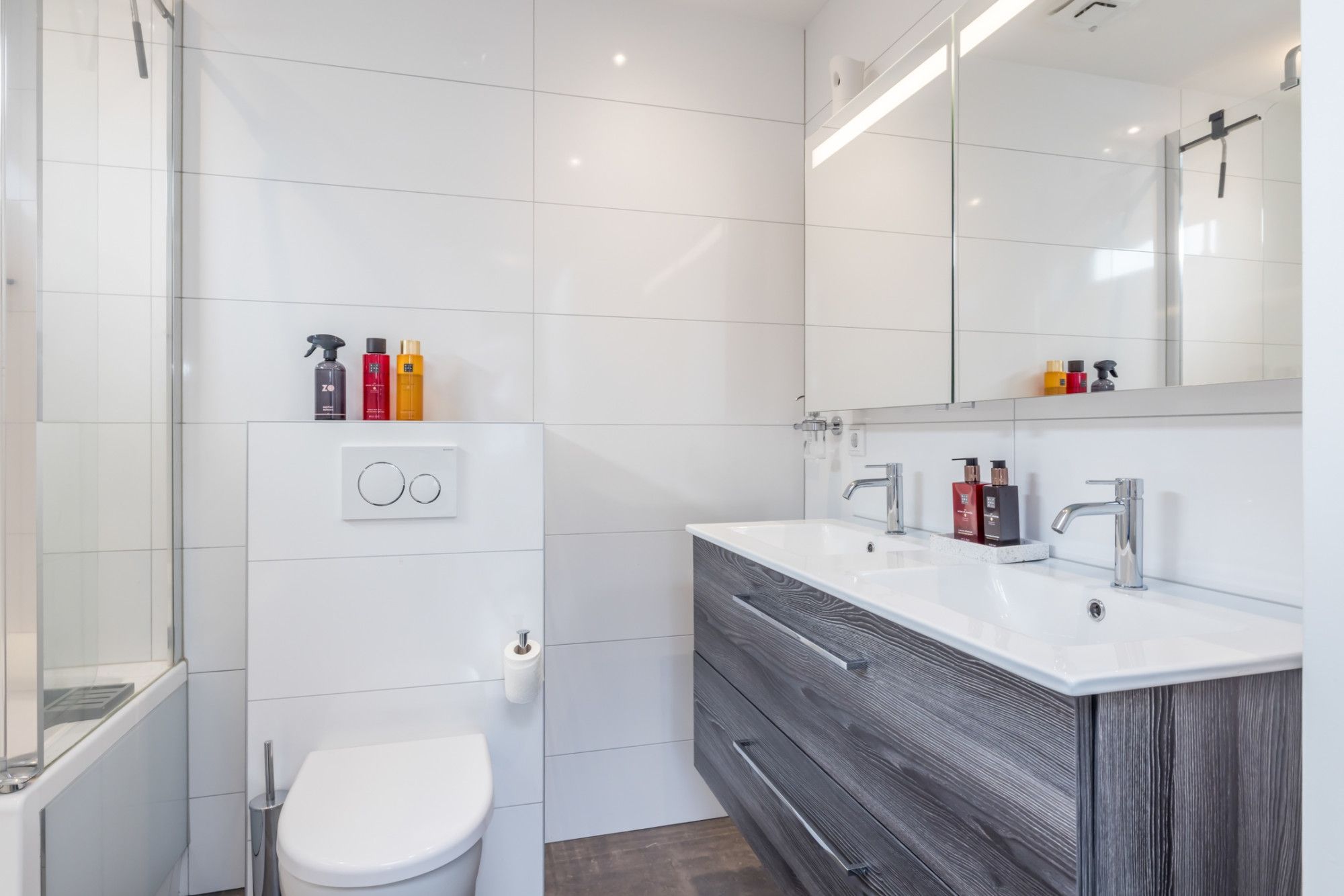 Overloop met toegang tot drie slaapkamers en moderne badkamer met instapbad, dubbele wastafel met meubel en toilet.