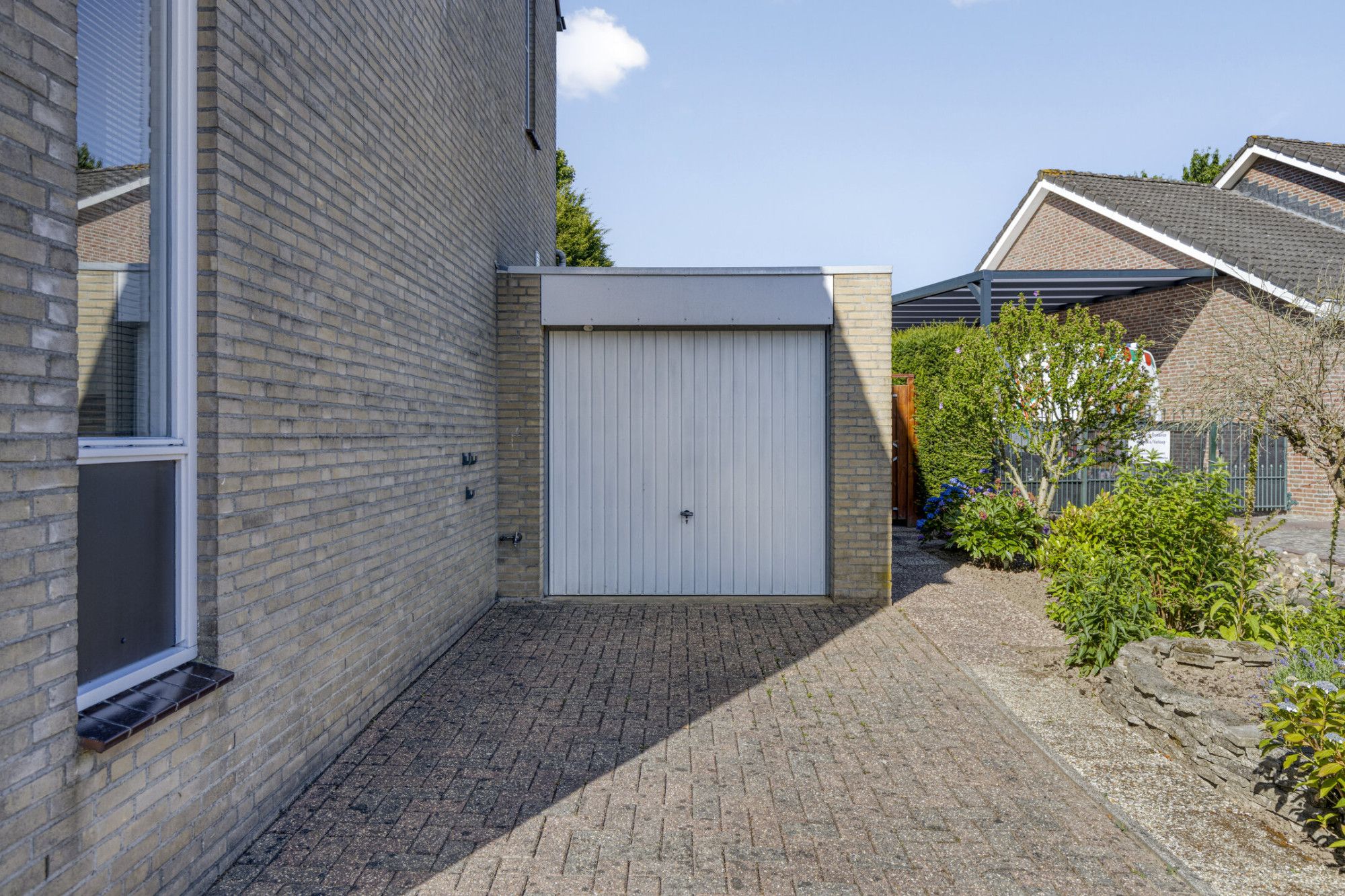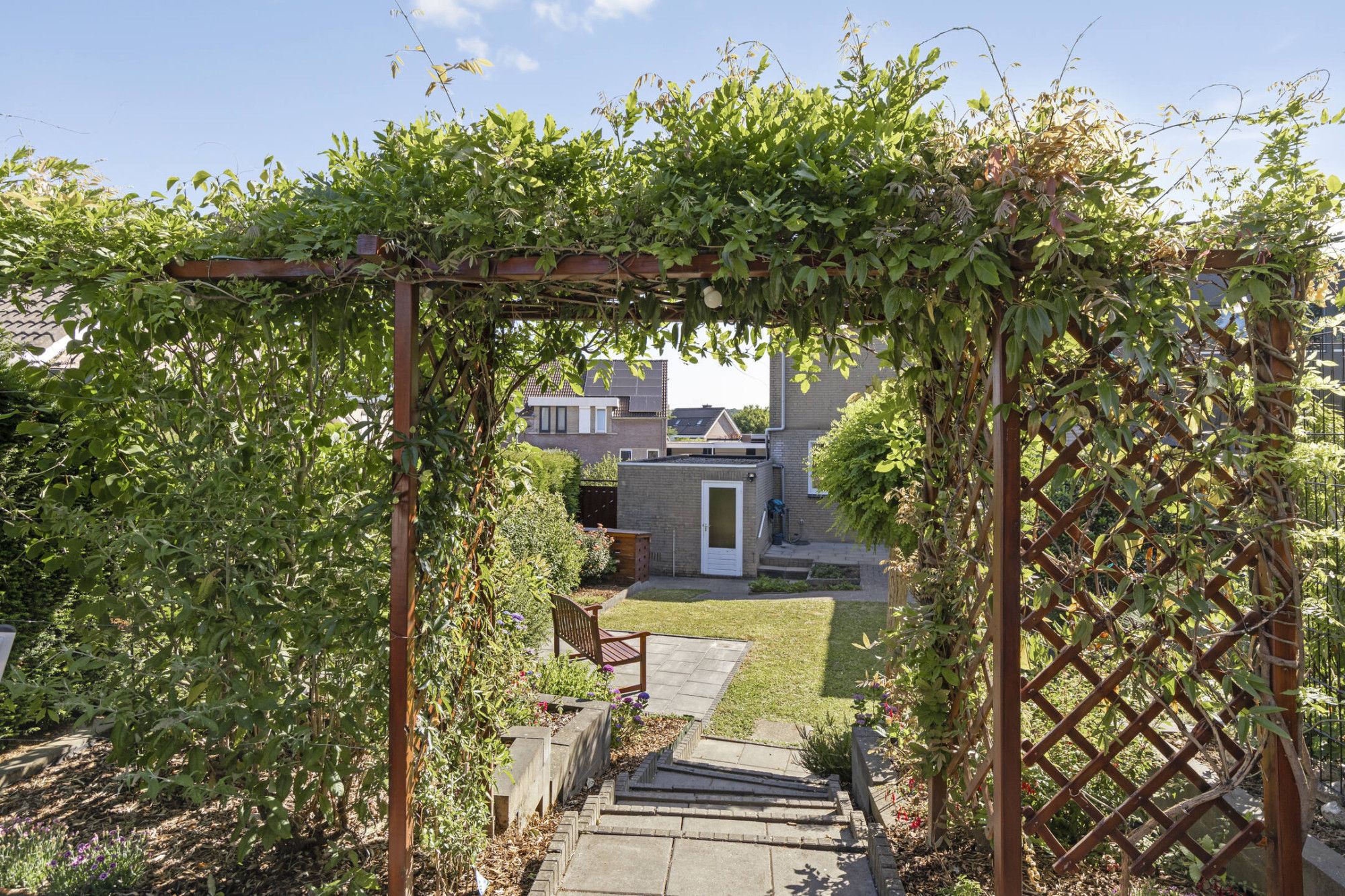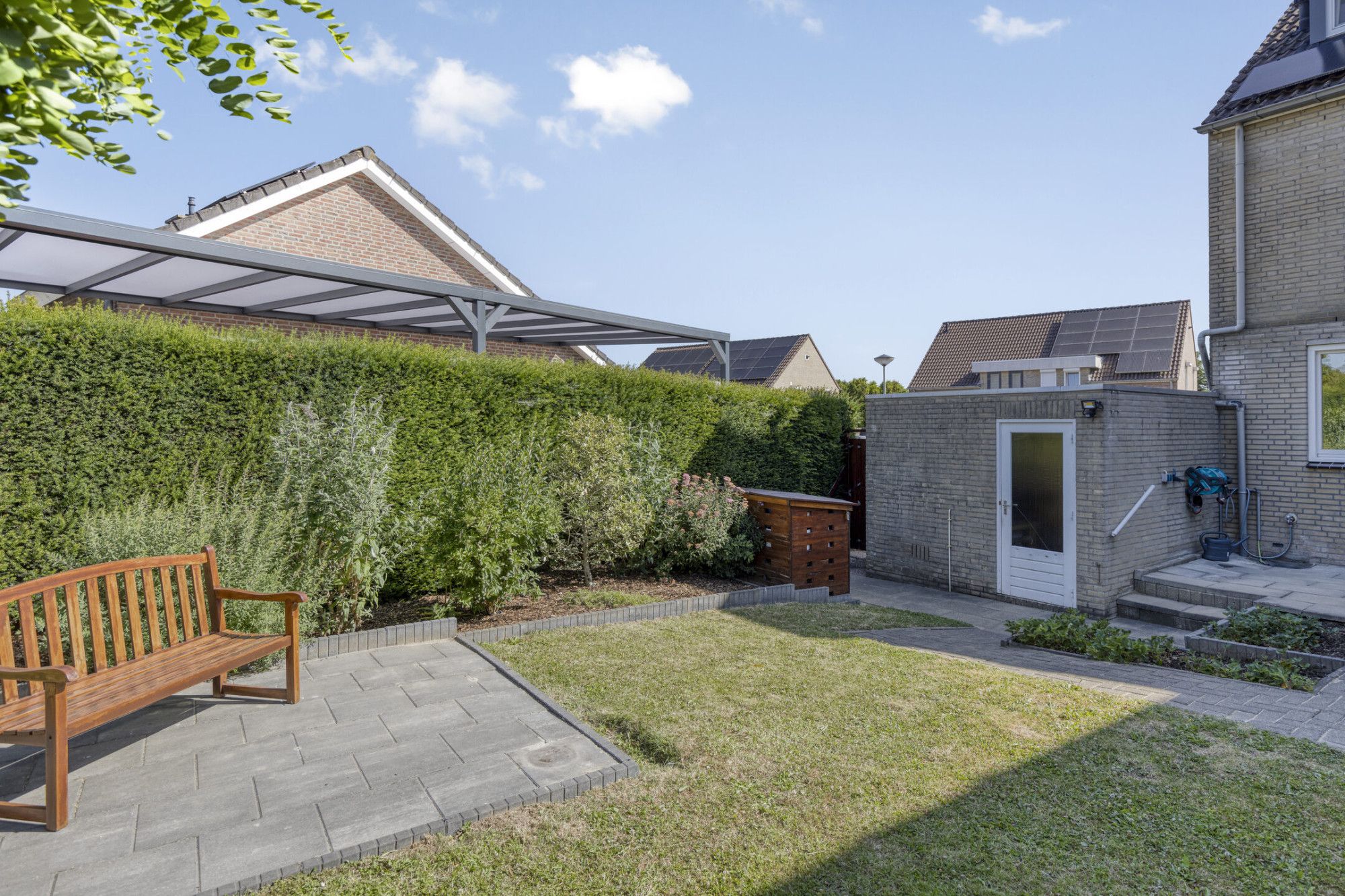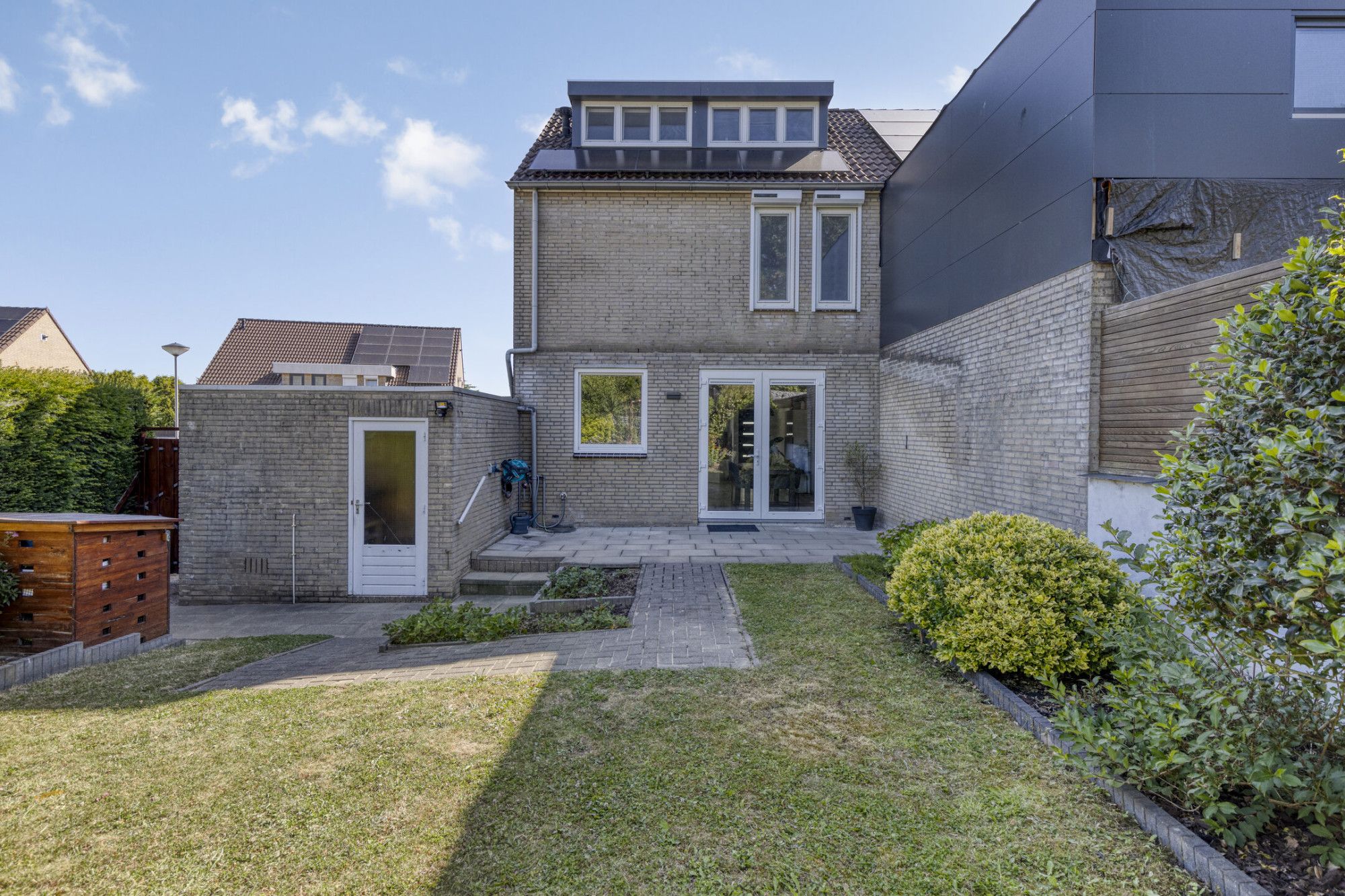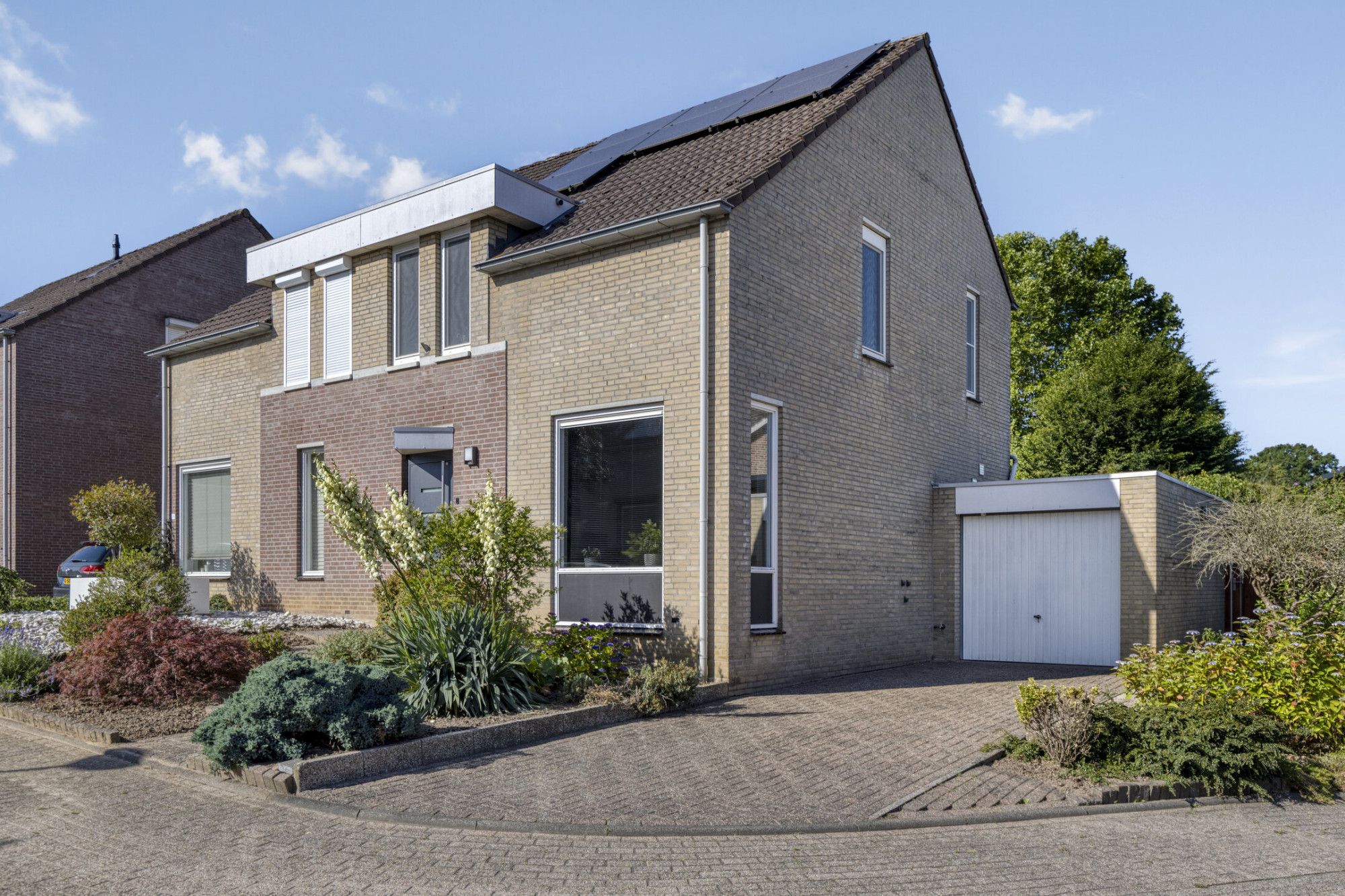 Instapklare twee-onder-een-kapwoning met garage, tuinhuis en zonnepanelen.