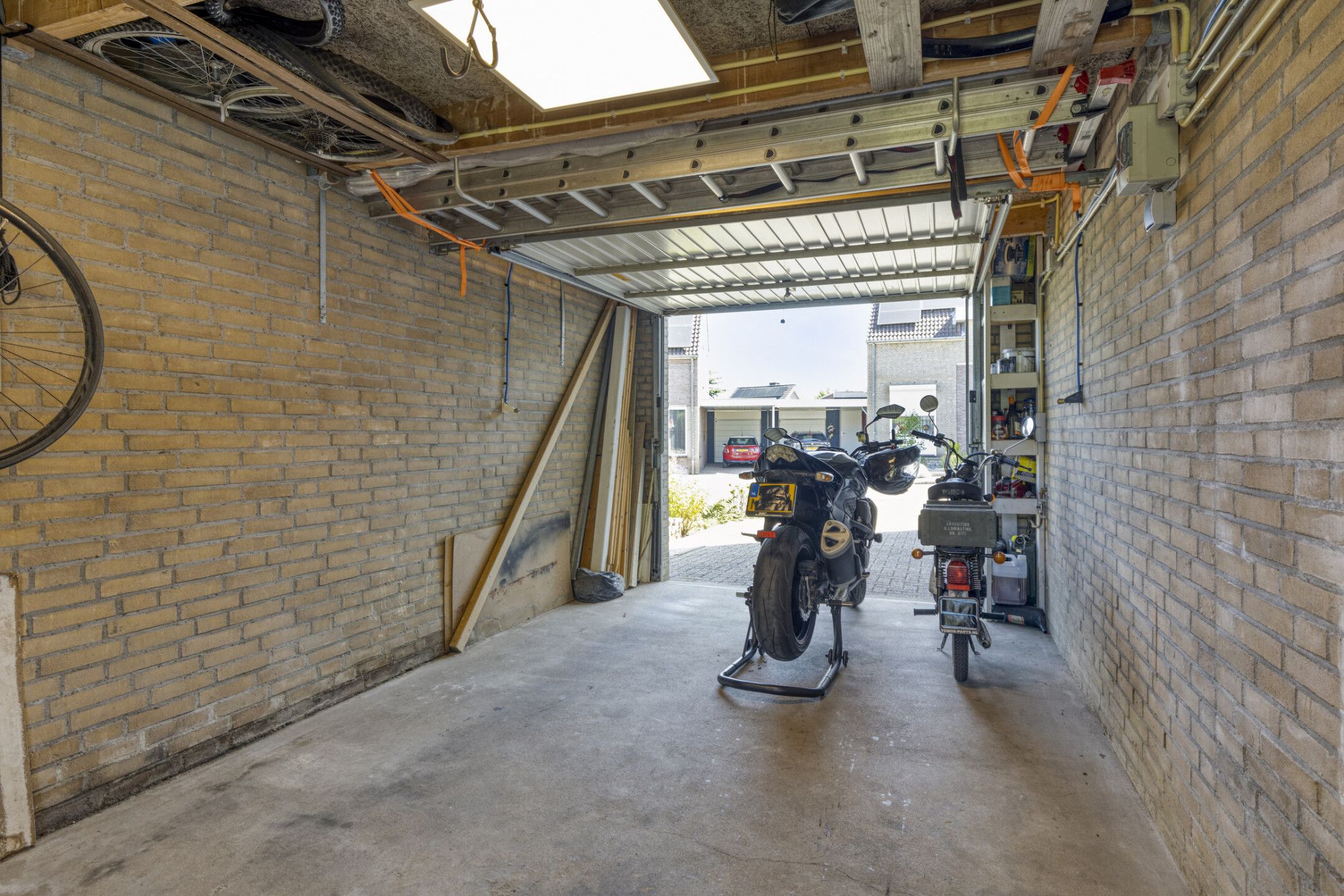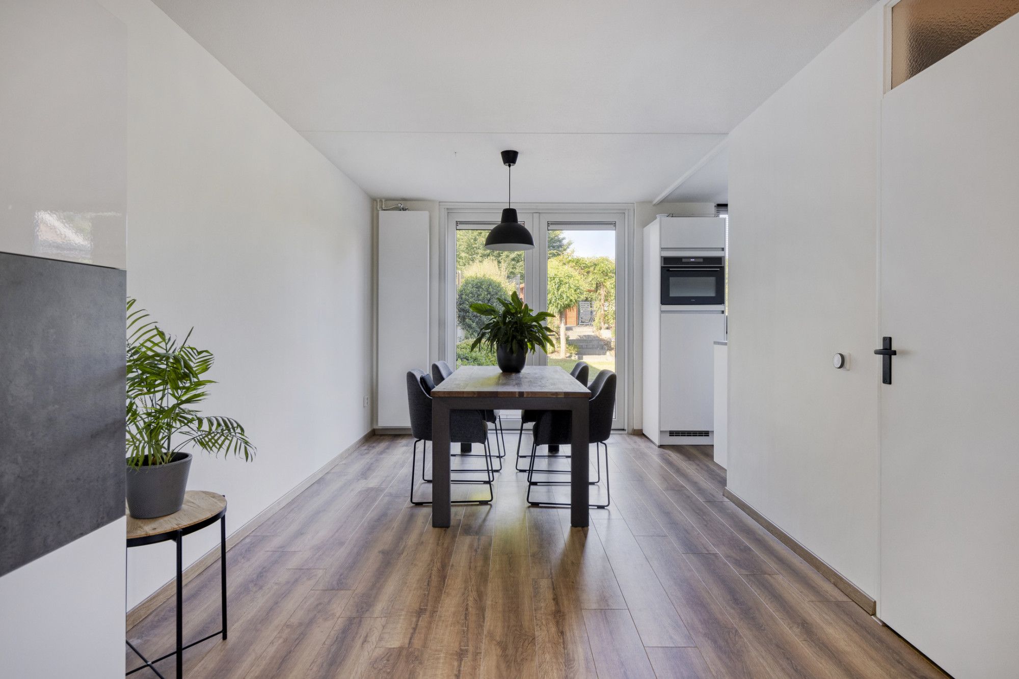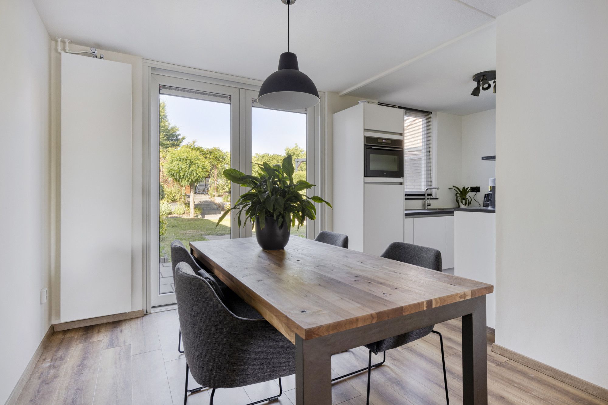Je betreedt de woning via de hal met meterkast. De lichte woonkamer met open keuken is voorzien van openslaande tuindeuren naar het terras. De keuken is uitgerust met moderne inbouwapparatuur, waaronder een combi-magnetron, koelkast met vriesvak, vaatwasser, afzuigkap en een inductiekookplaat. Praktische bergruimte bevindt zich onder de trap. Aangebouwde garage, voorzien van een kantelpoort. In de tuin staat een houten tuinhuis.