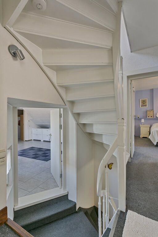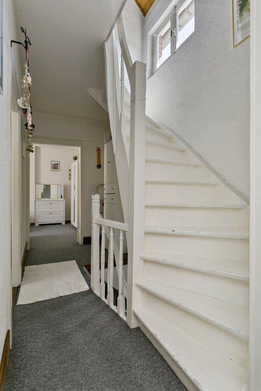 Overloop met toegang tot twee ruime slaapkamers, de badkamer, een doorgang naar het appartement en een vaste trap naar de tweede verdieping.