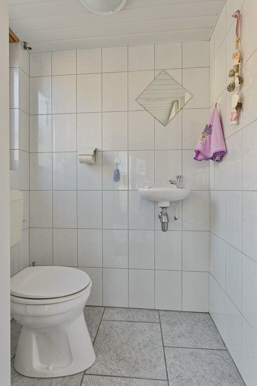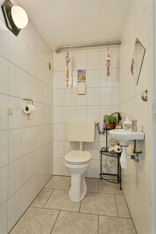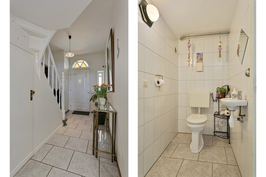 Hal met toiletruimte, trapopgang en badkamer voorzien van ligbad, wastafelmeubel en witgoedaansluitingen.