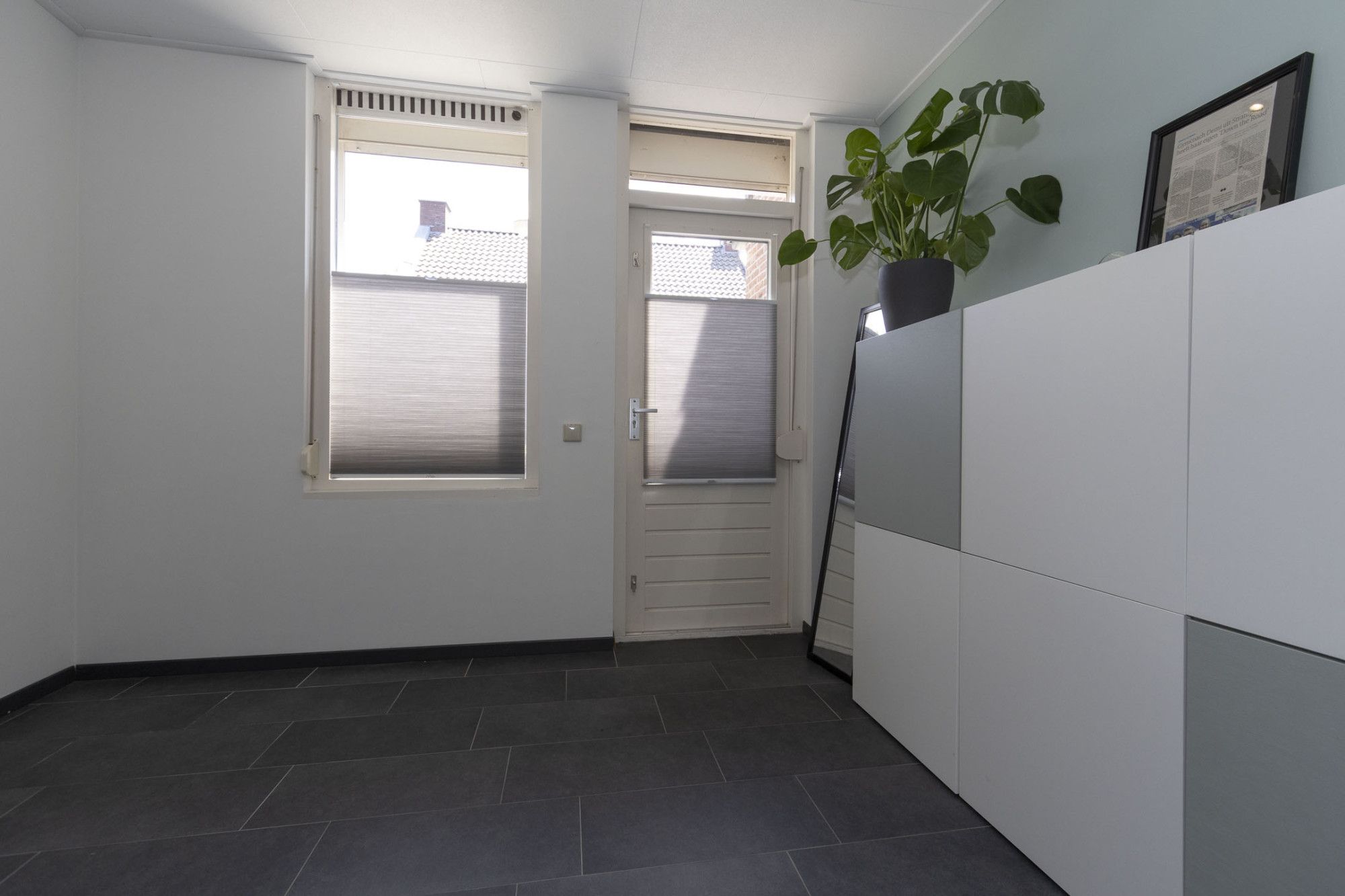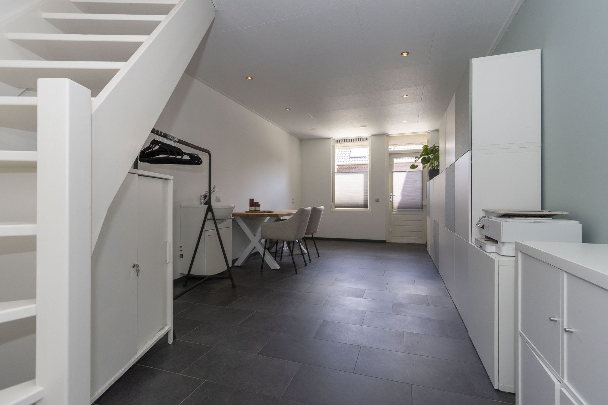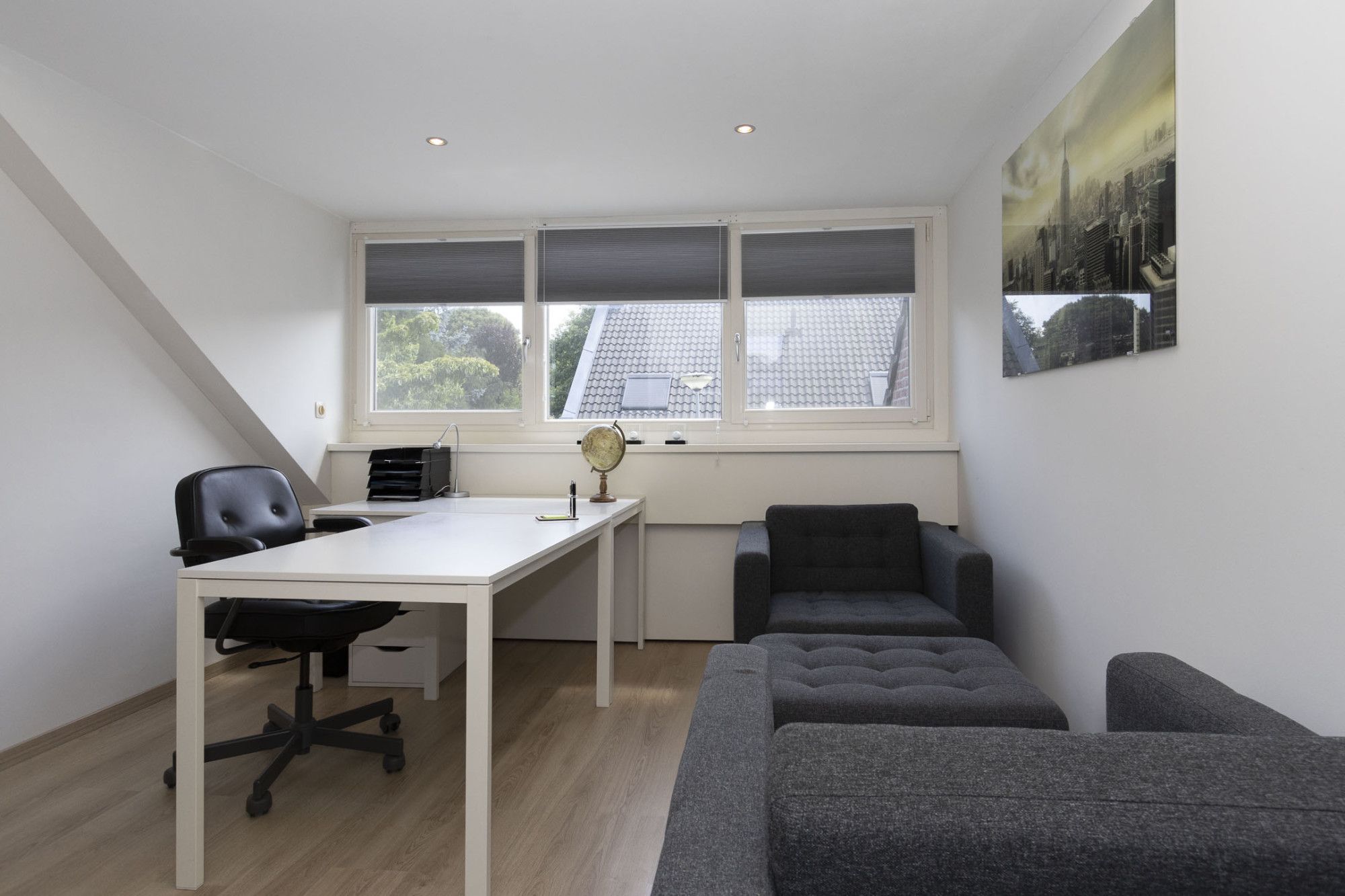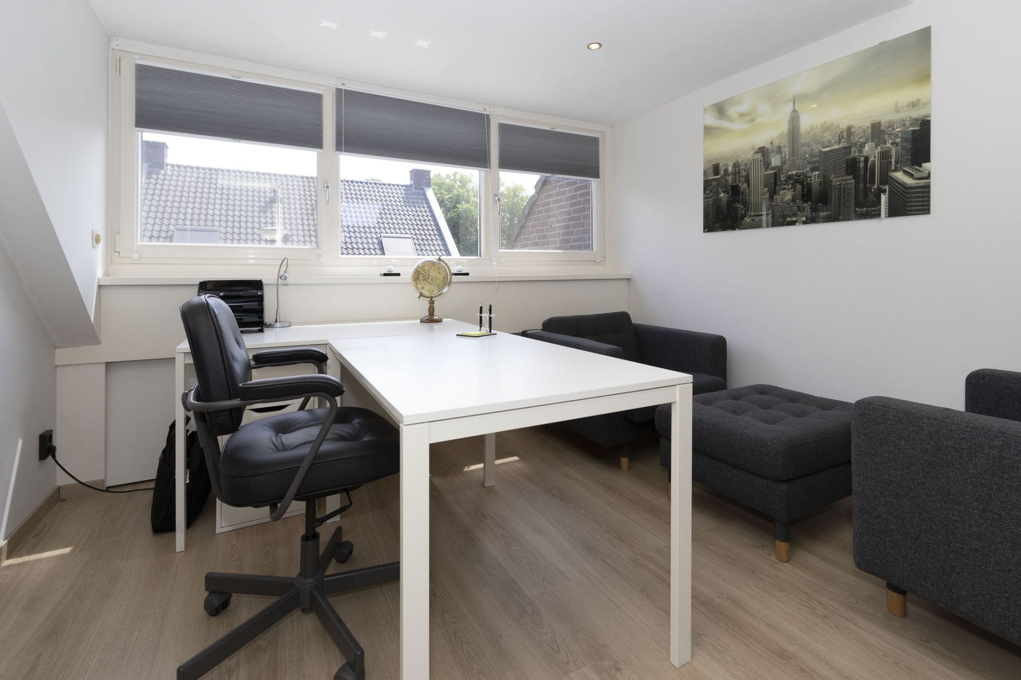 Vanuit de keuken loop je via een hal naar het toilet en de praktijk-kantoorruimte. Deze is maar liefst ca. 20m² en heeft een wasbak met wastafel. Aan de voorzijde vind je de aparte entree van deze praktijk-kantoorruimte. De trappartij hier brengt je naar de 1e verdieping van de woning, die eveneens te bereiken is via de trap vanuit de woonkamer.