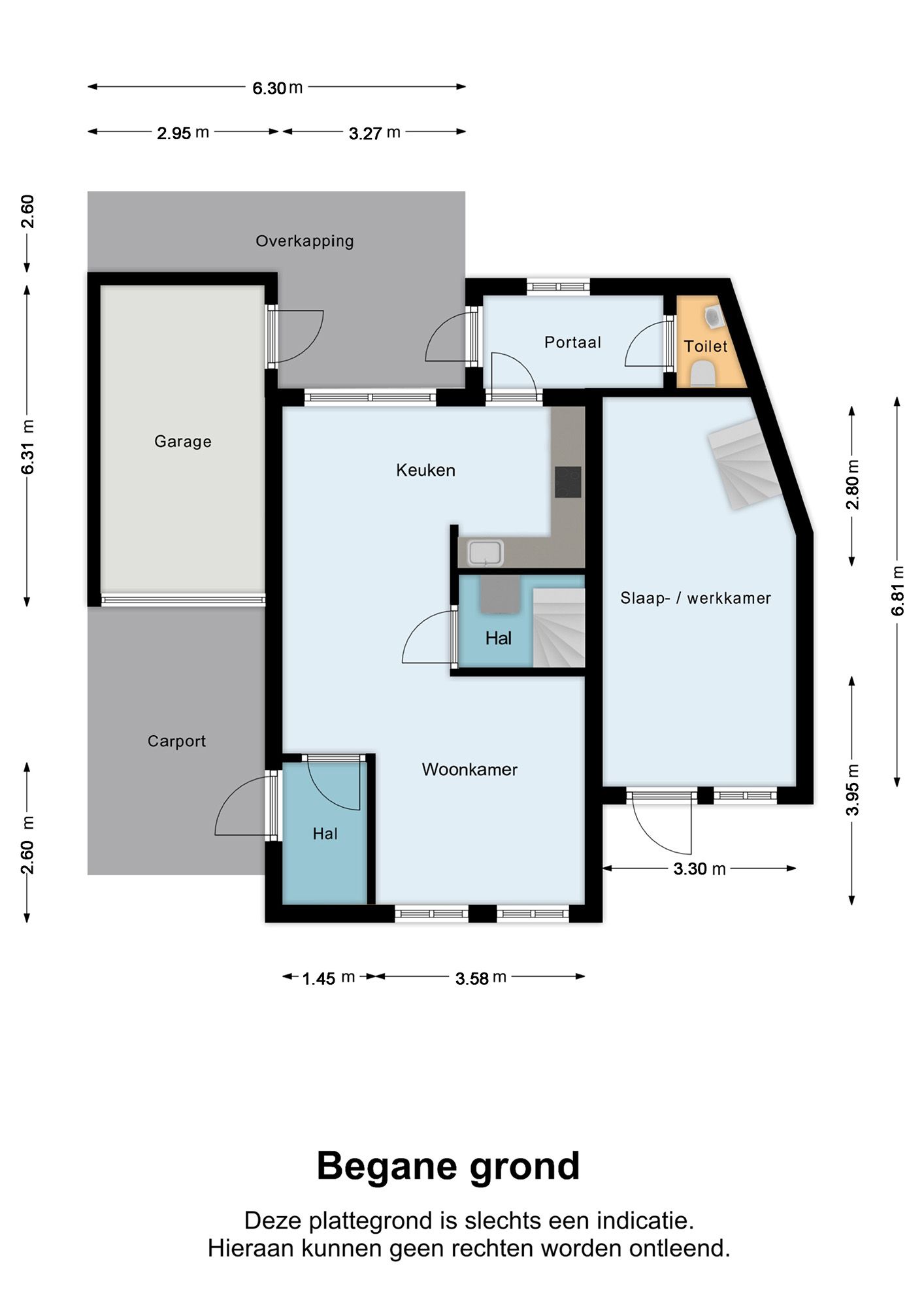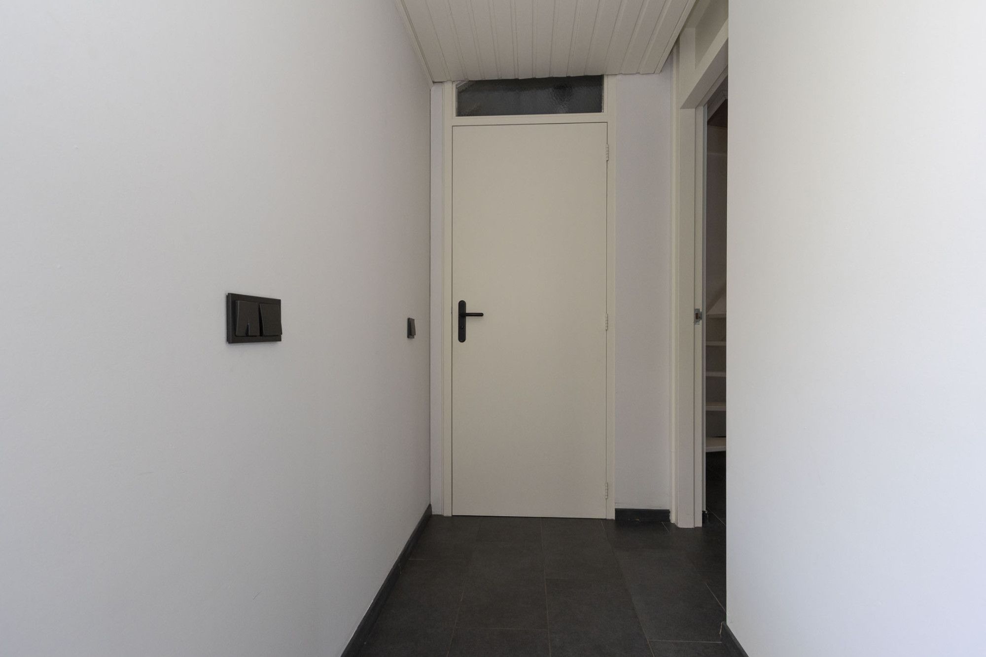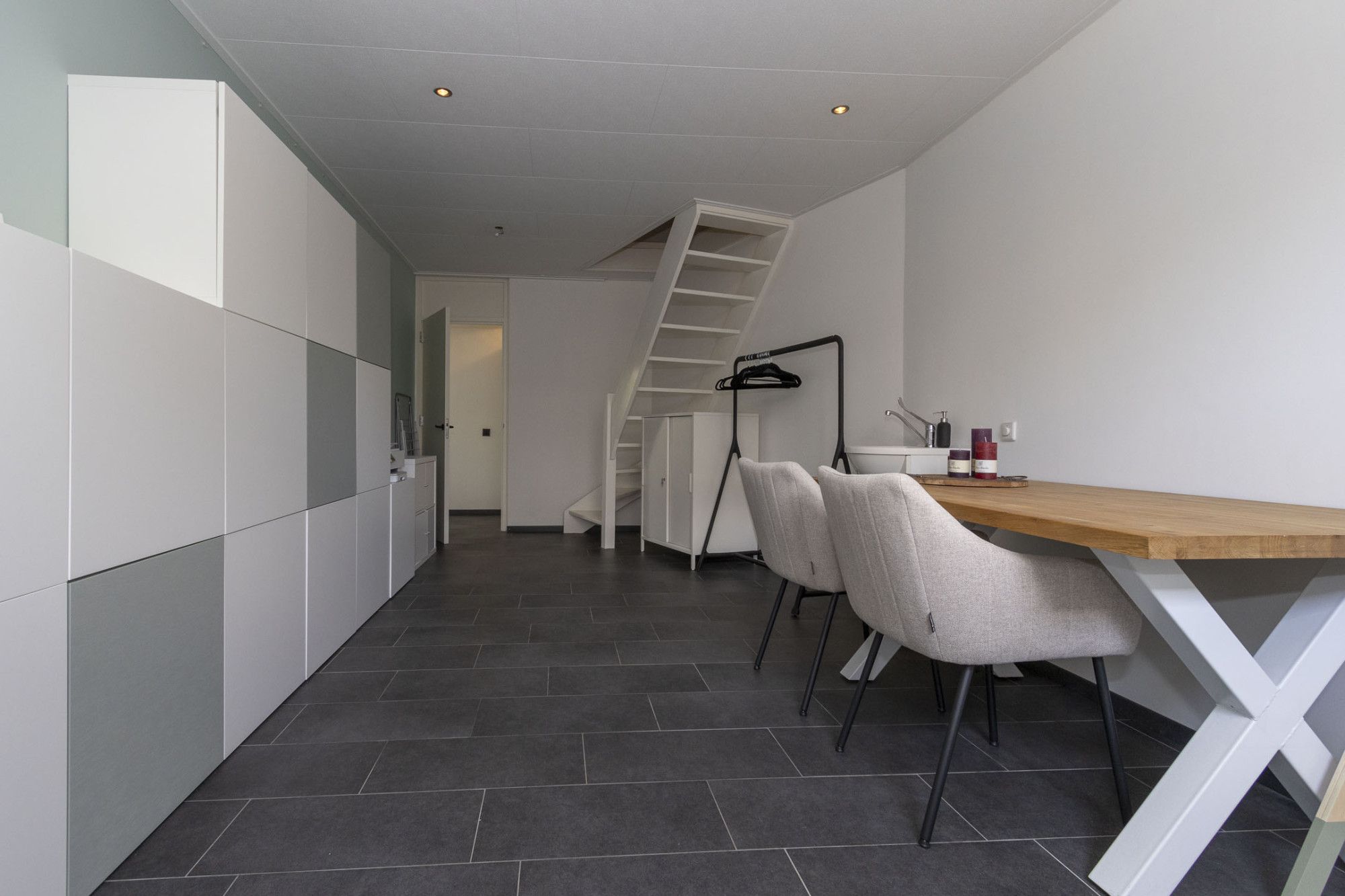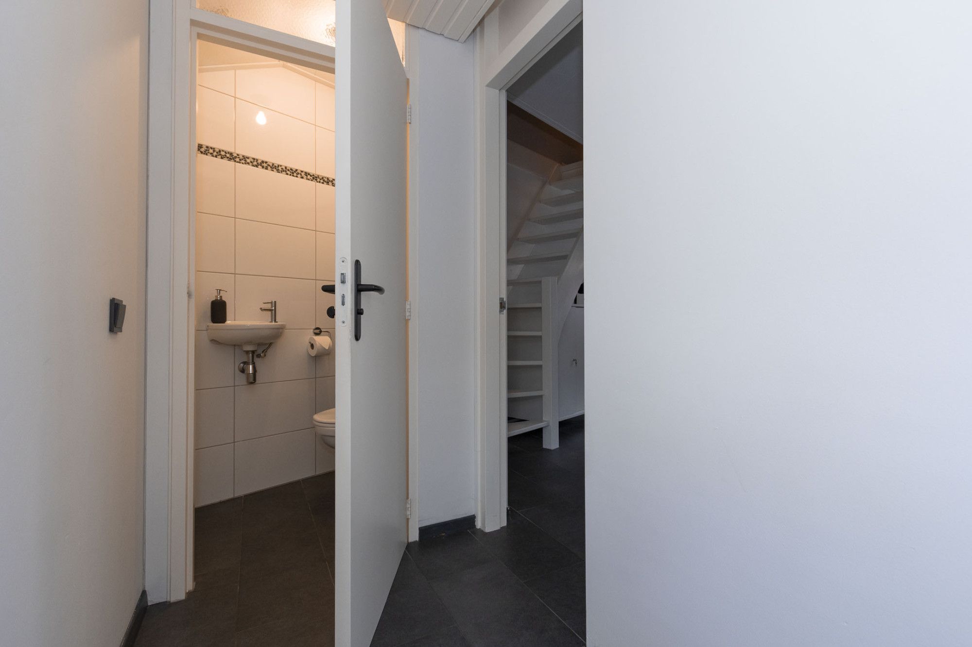 Vanuit de keuken loop je via een hal naar het toilet en de praktijk-kantoorruimte. Deze is maar liefst ca. 20m² en heeft een wasbak met wastafel. Aan de voorzijde vind je de aparte entree van deze praktijk-kantoorruimte. De trappartij hier brengt je naar de 1e verdieping van de woning, die eveneens te bereiken is via de trap vanuit de woonkamer.