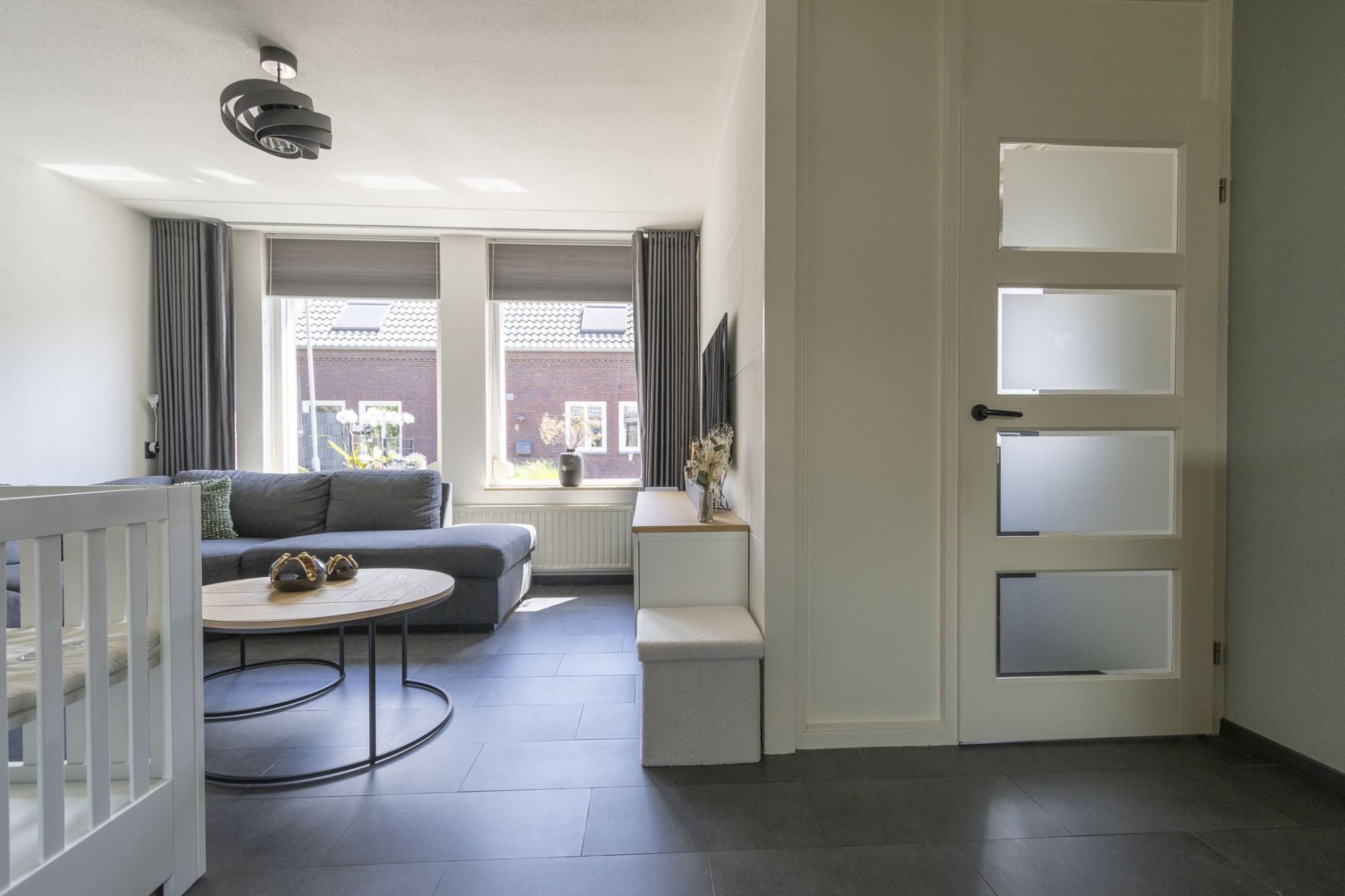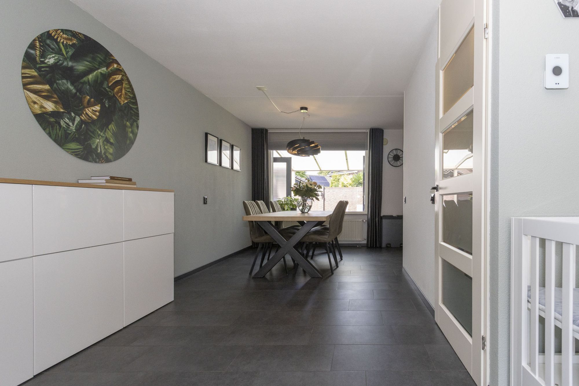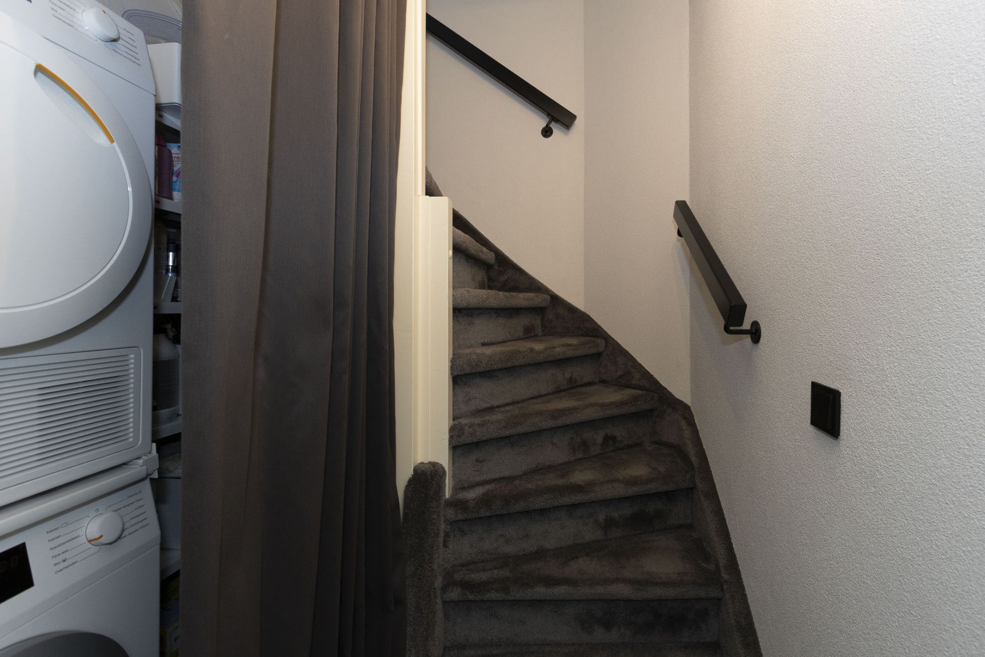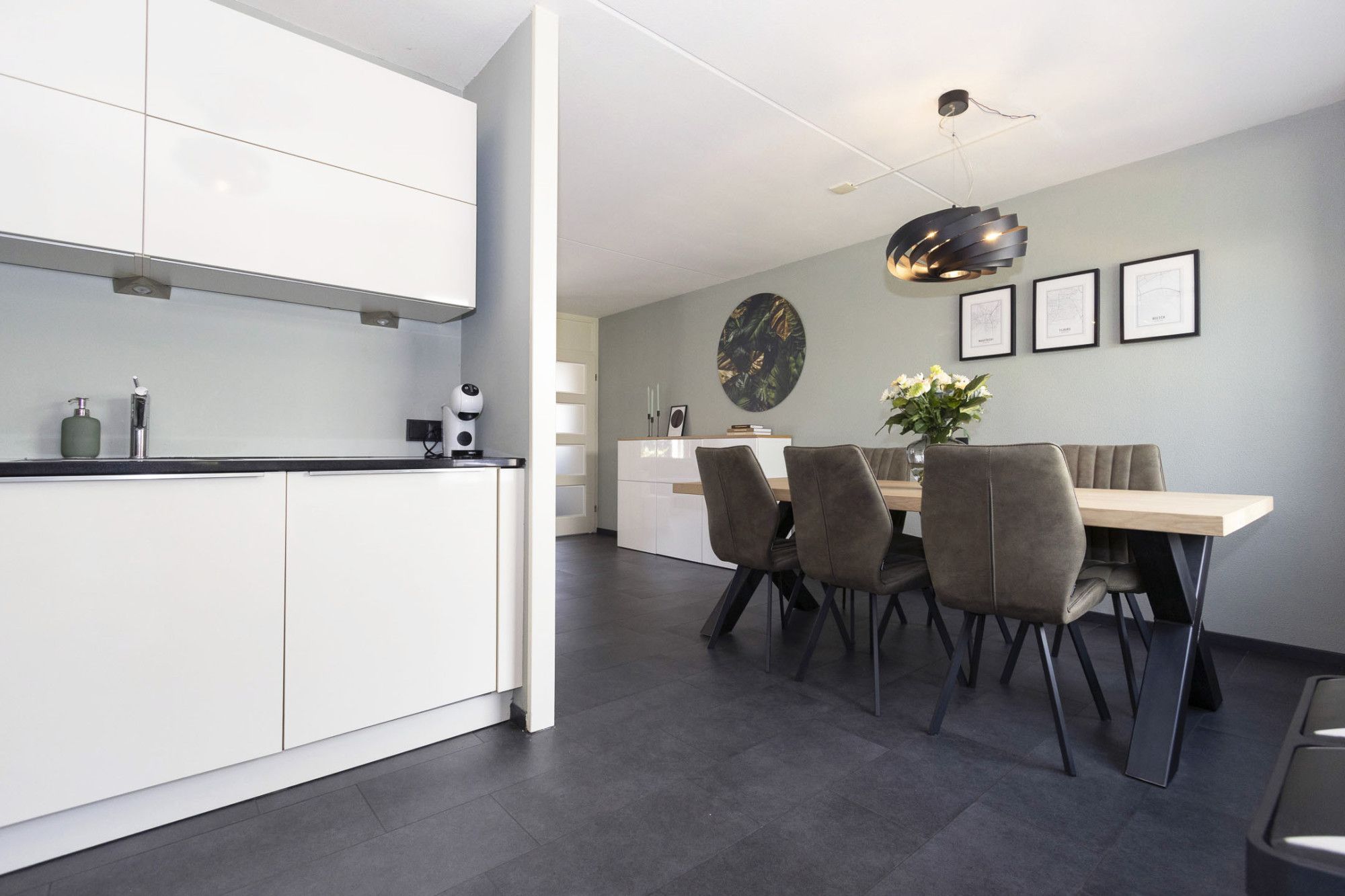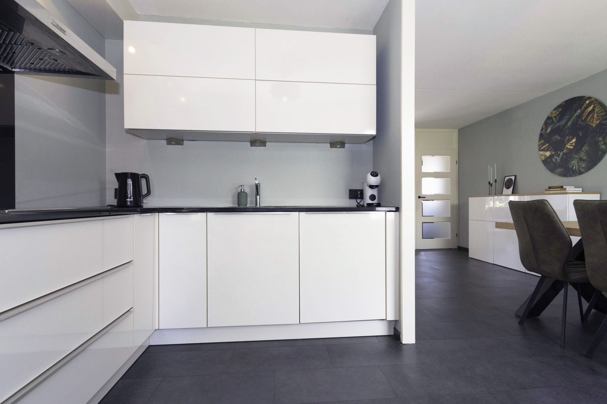 Entree via de oprit met carport en wall box voor elektrisch laden. Via de welkomsthal kom je in de royale woonkamer en de keuken. De gehele begane grond is voorzien van vloerverwarming en een mooie antraciet tegelvoer. Vanuit de eethoek kijk je naar de moderne keukenopstand in hoogglans wit. Je kookt hier met alle gemakken; een inductiekookplaat, afzuigkap, combi-oven en ingebouwde koelkast.