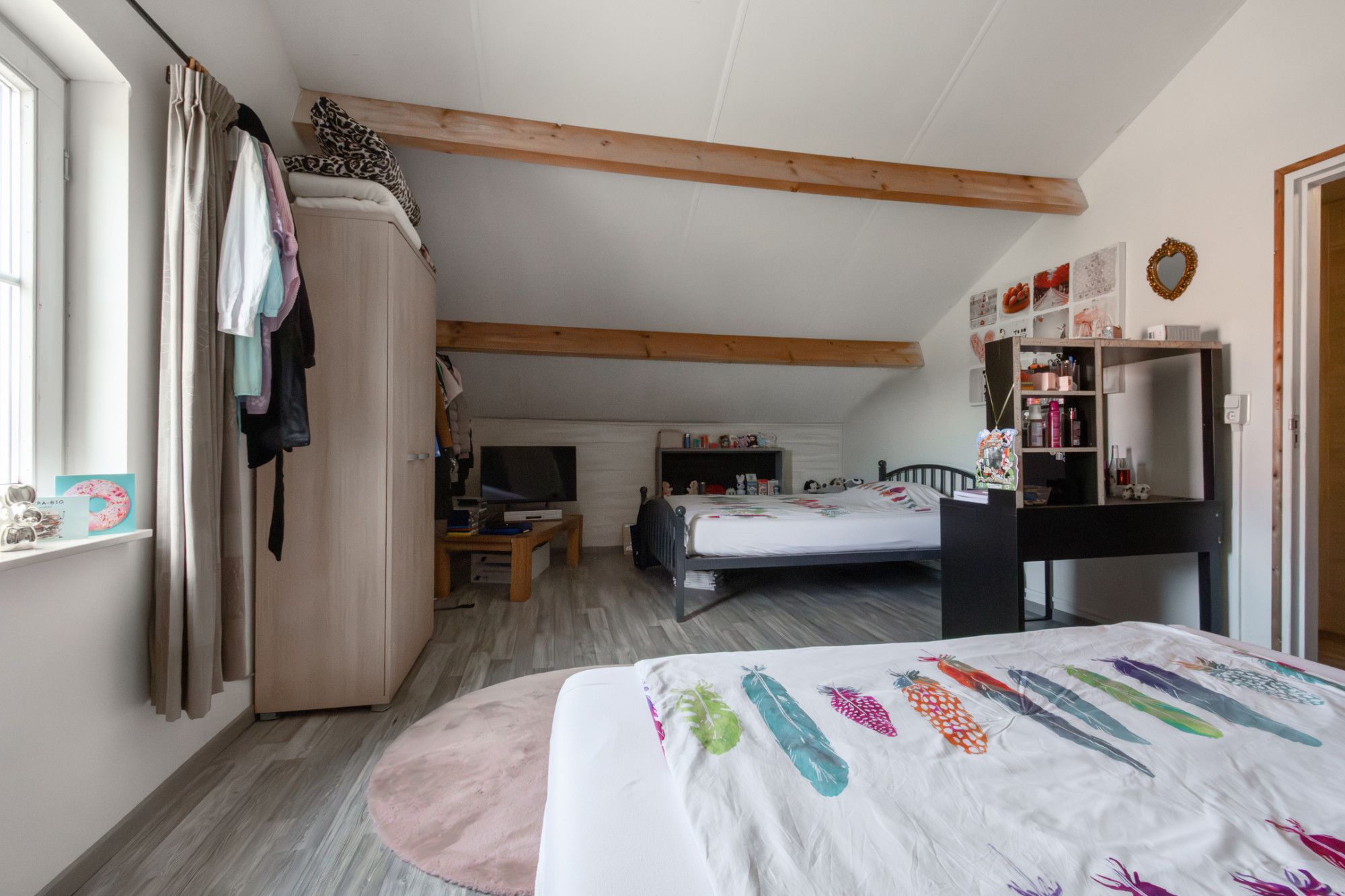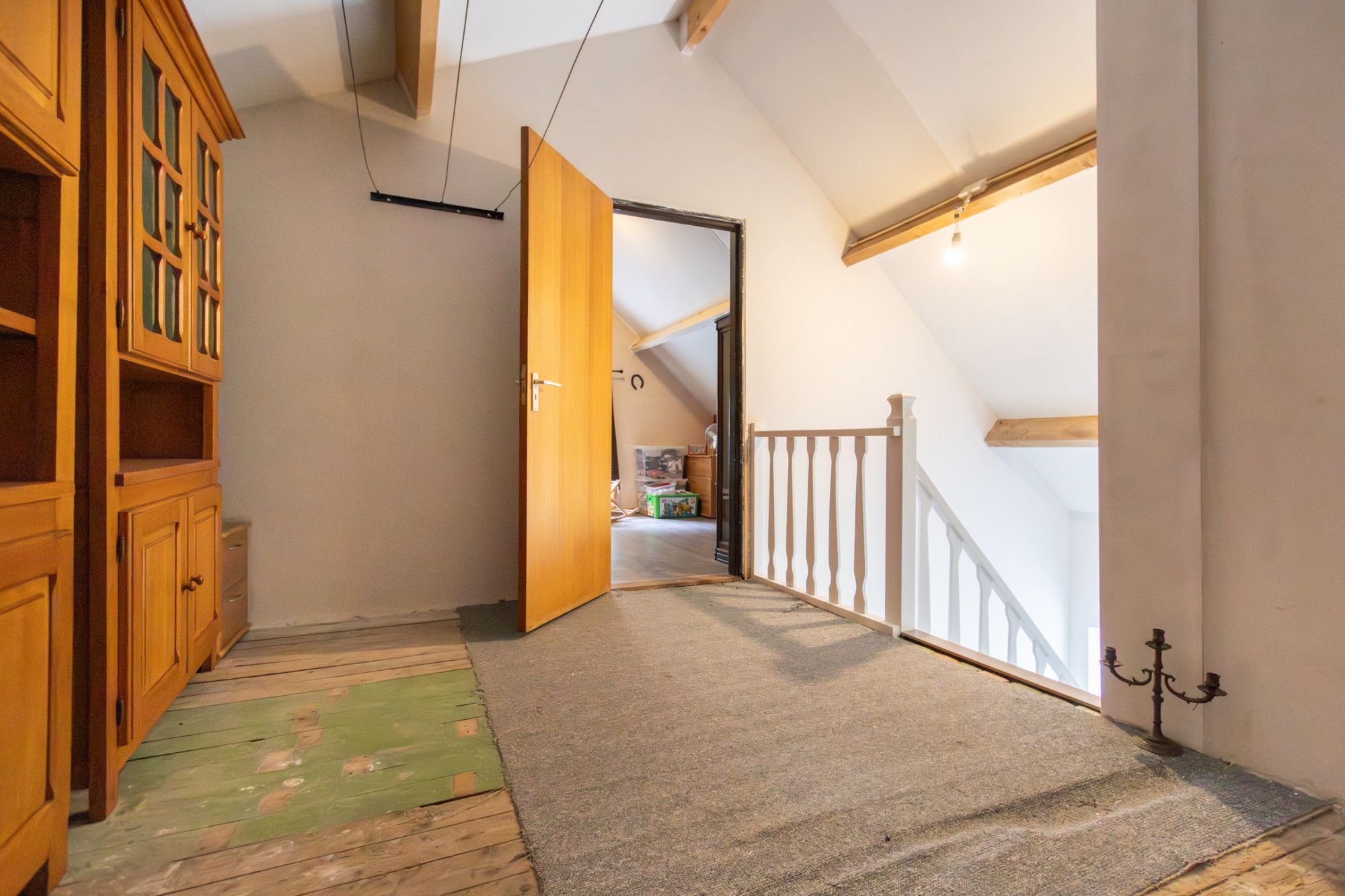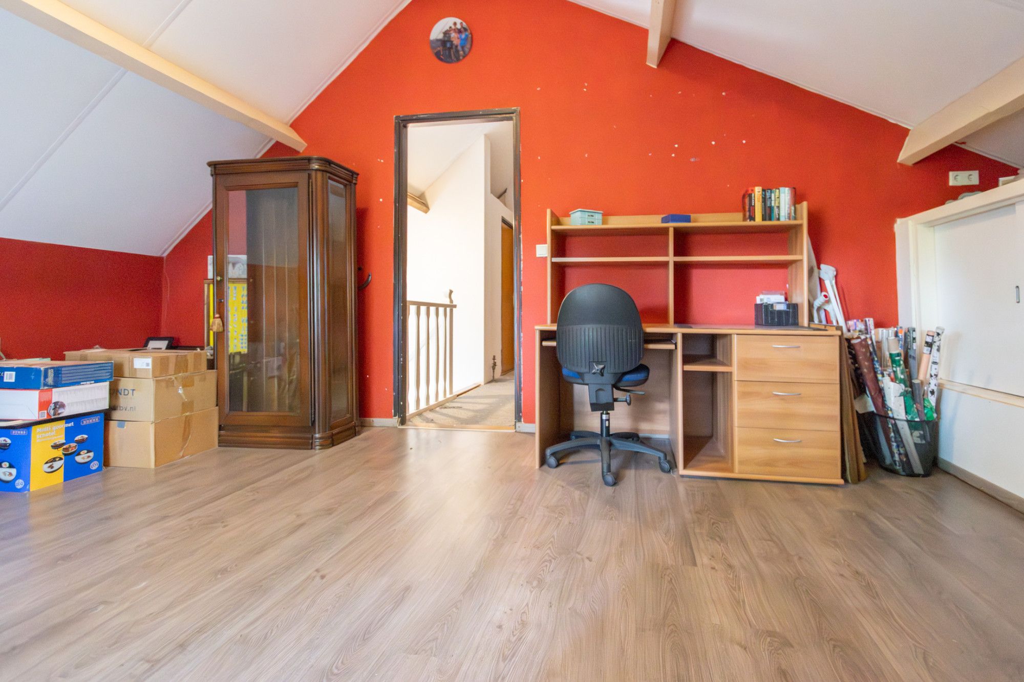 Op de eerste verdieping biedt de overloop toegang tot een grote slaapkamer en een zolder. In de slaapkamer ligt een laminaatvloer.