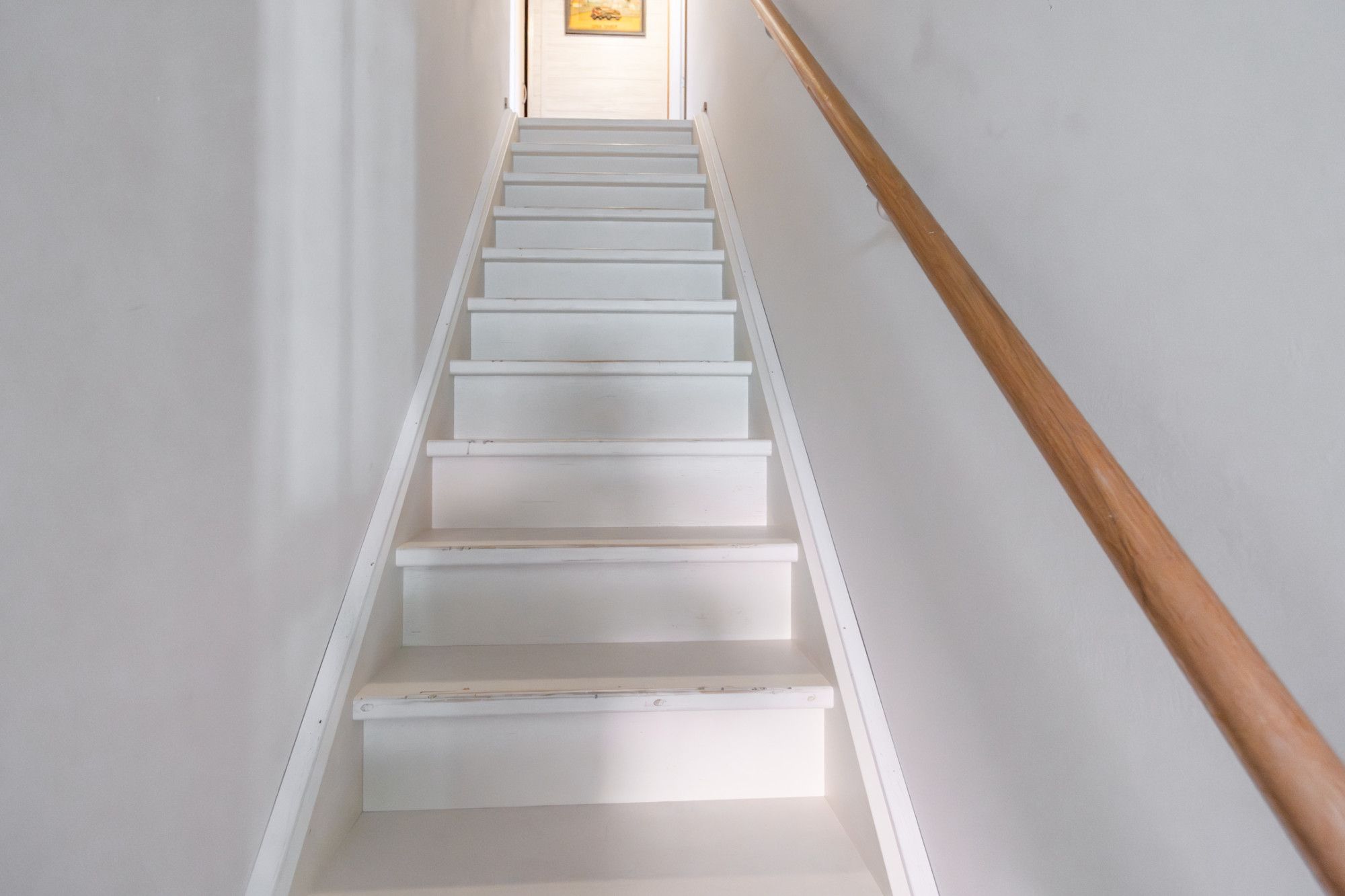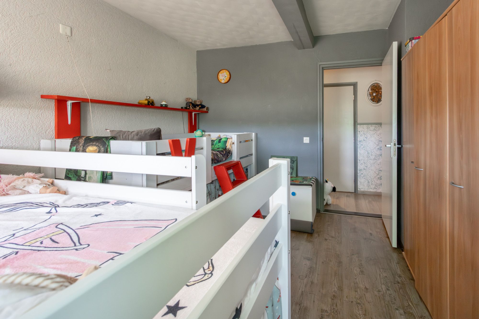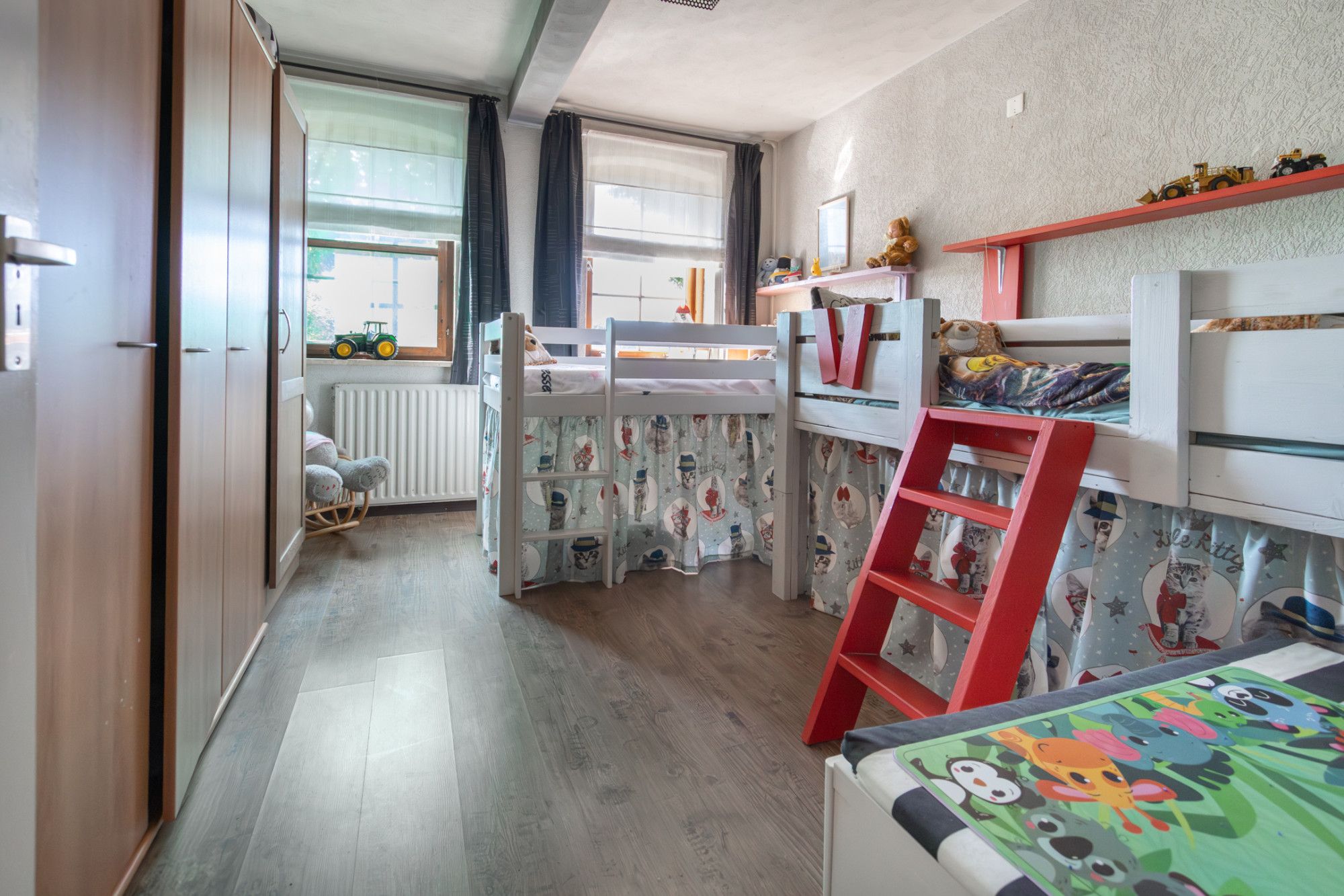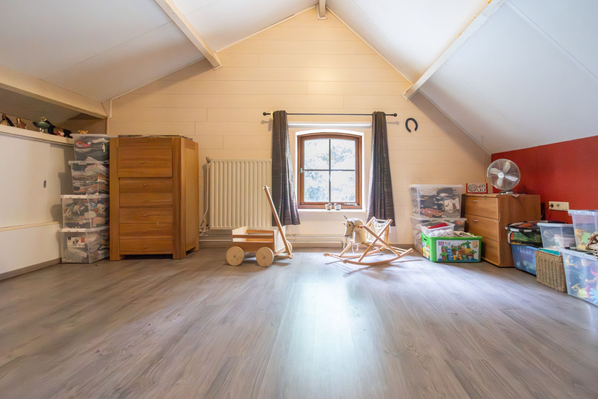 Op de eerste verdieping biedt de overloop toegang tot een grote slaapkamer en een zolder. In de slaapkamer ligt een laminaatvloer.