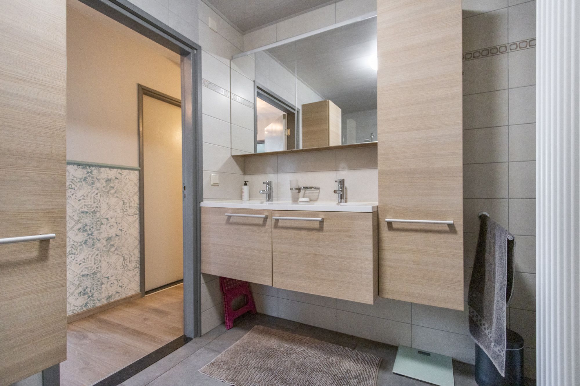De badkamer heeft een dubbel wastafelmeubel, inloopdouche en wandradiator.