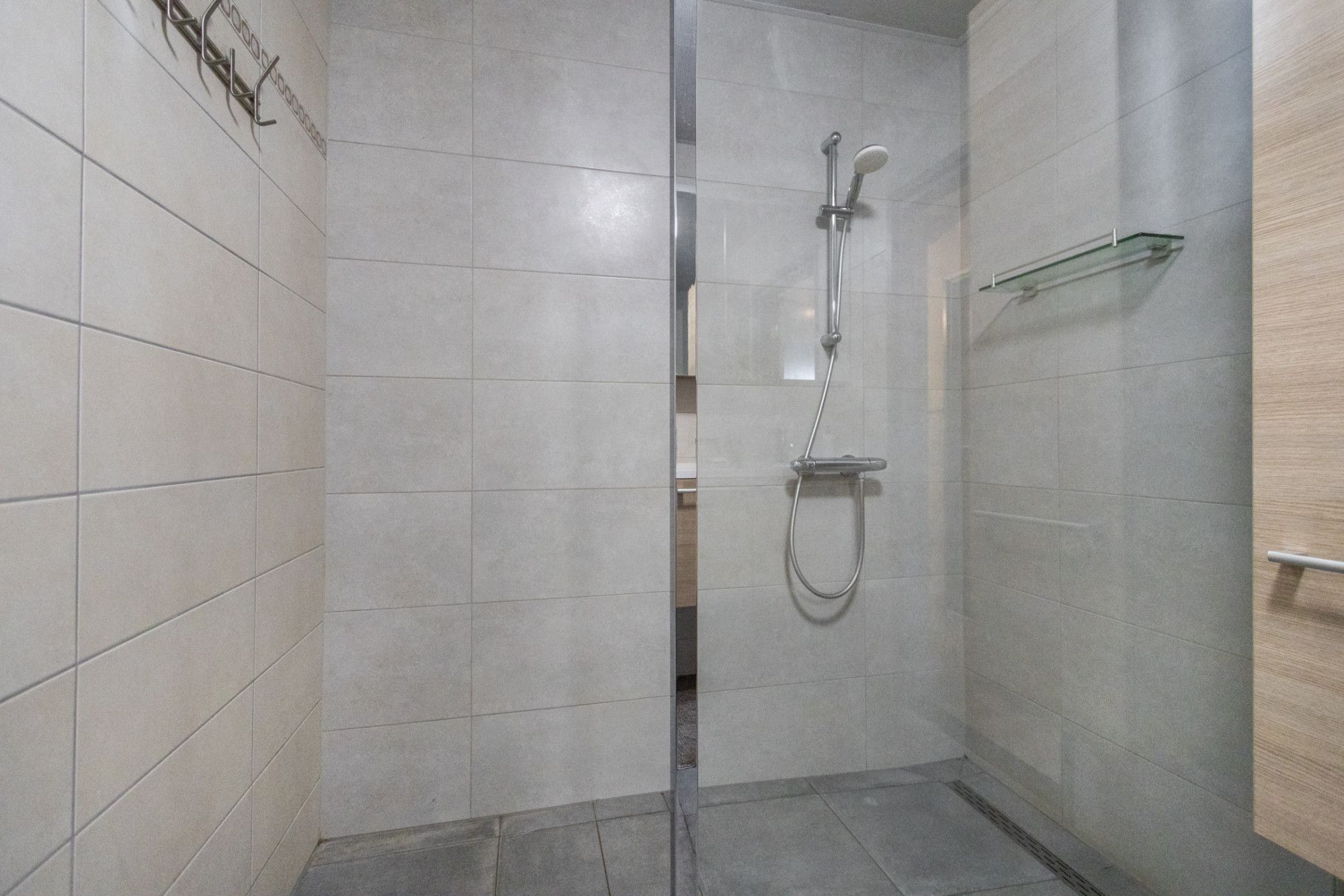 De badkamer is uitgerust met een inloopdouche en een dubbel wastafelmeubel. De ruimte wordt verwarmd met vloerverwarming en een extra wandradiator.