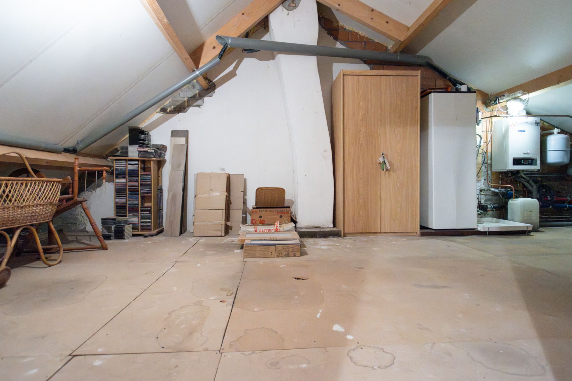 Op de zolder is veel bergruimte en zit de aansluiting van de cv-ketel (Nefit 2015). Ook zit er een boiler die i.c.m. de cv-ketel werkt en de zonnecollectoren. In een aparte bergruimte bevindt zich de omvormer van de 30 zonnepanelen.