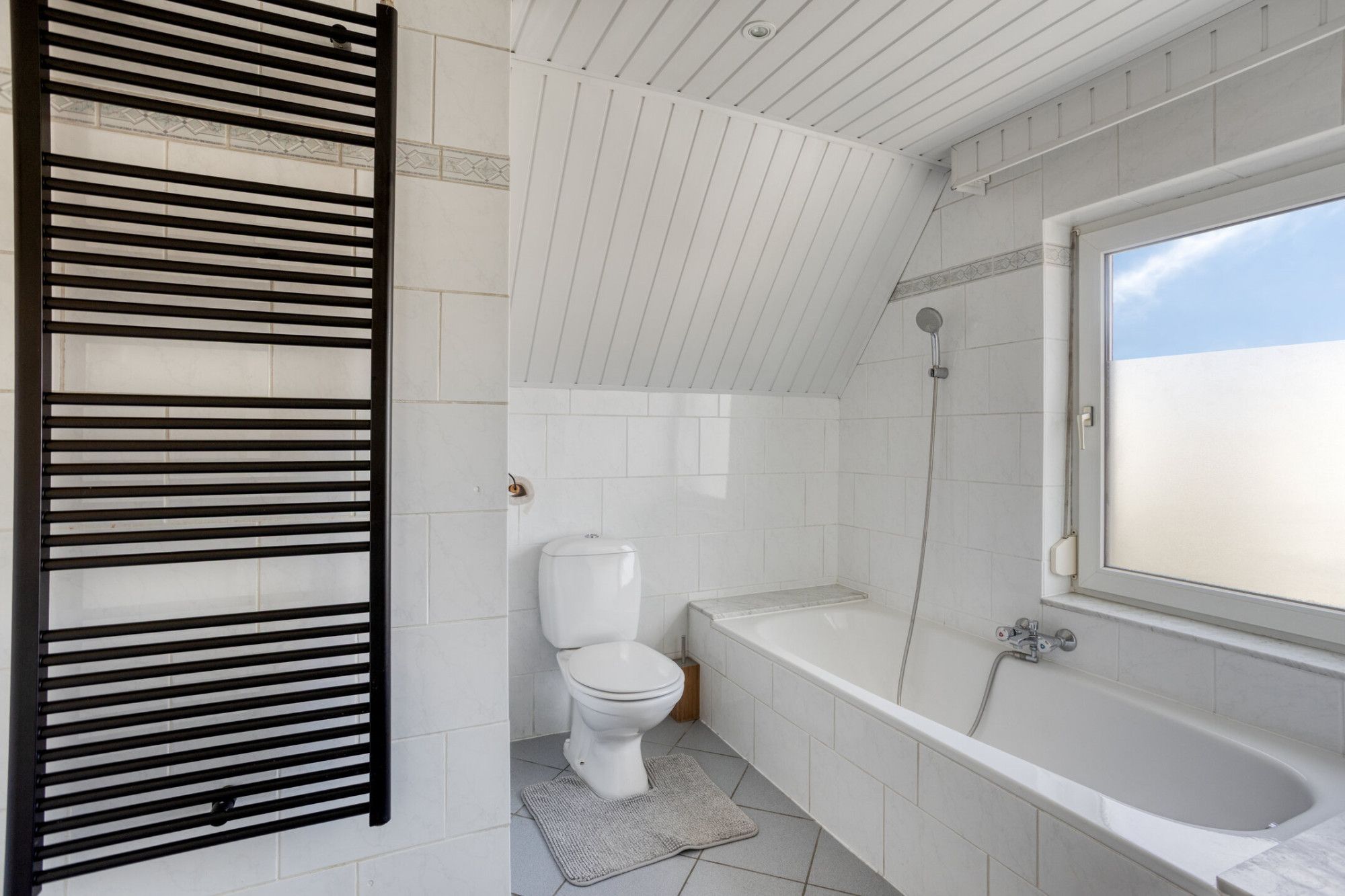 Verdieping: overloop naar 3 slaapkamers; kantoorkamer; badkamer met ligbad, douche, toilet en wastafel.