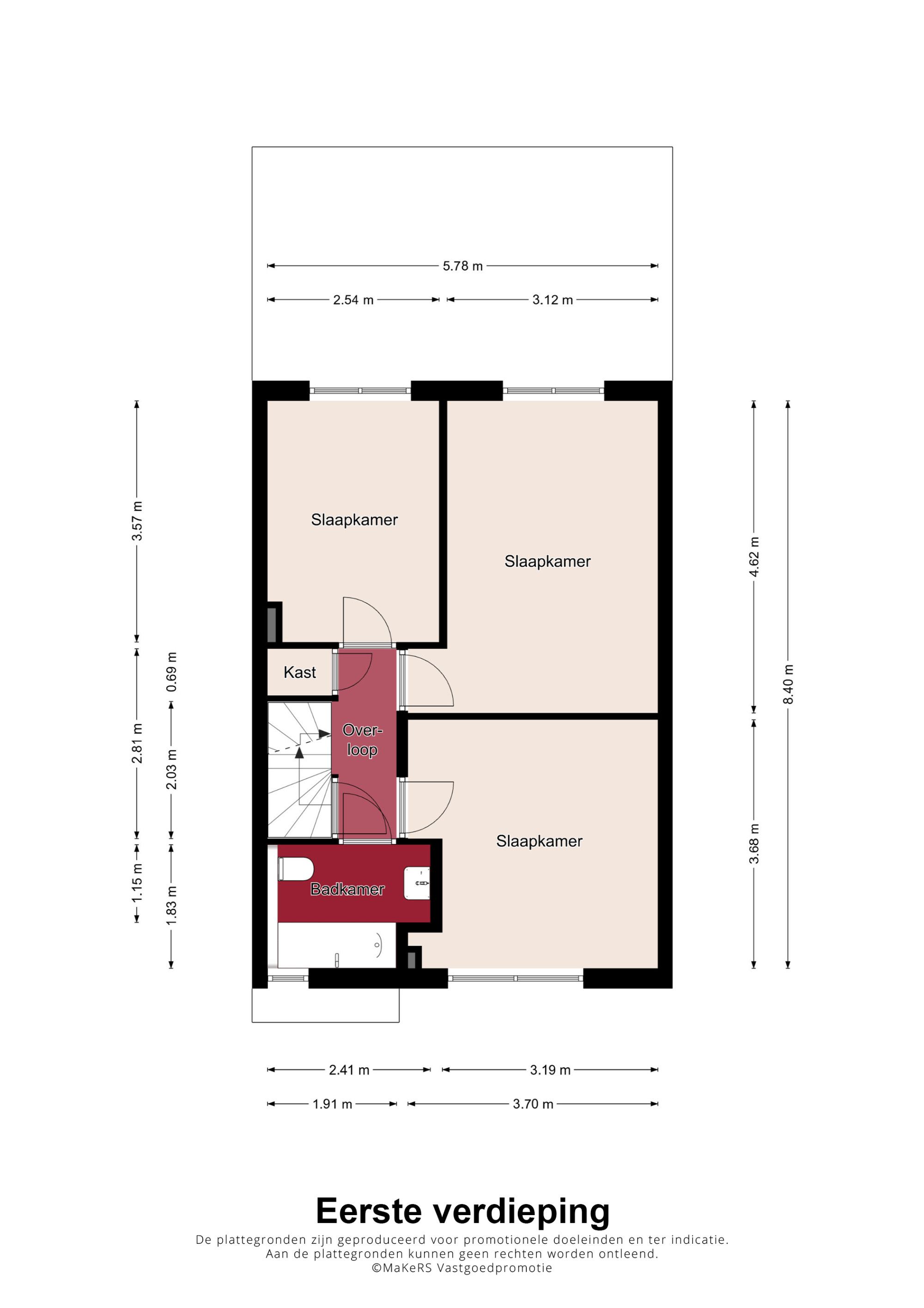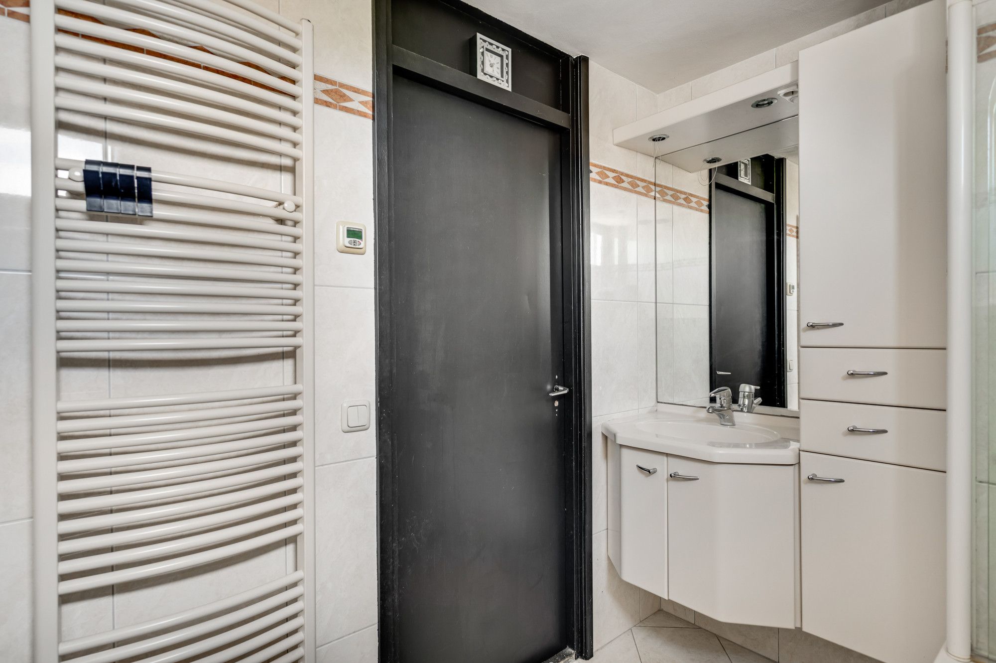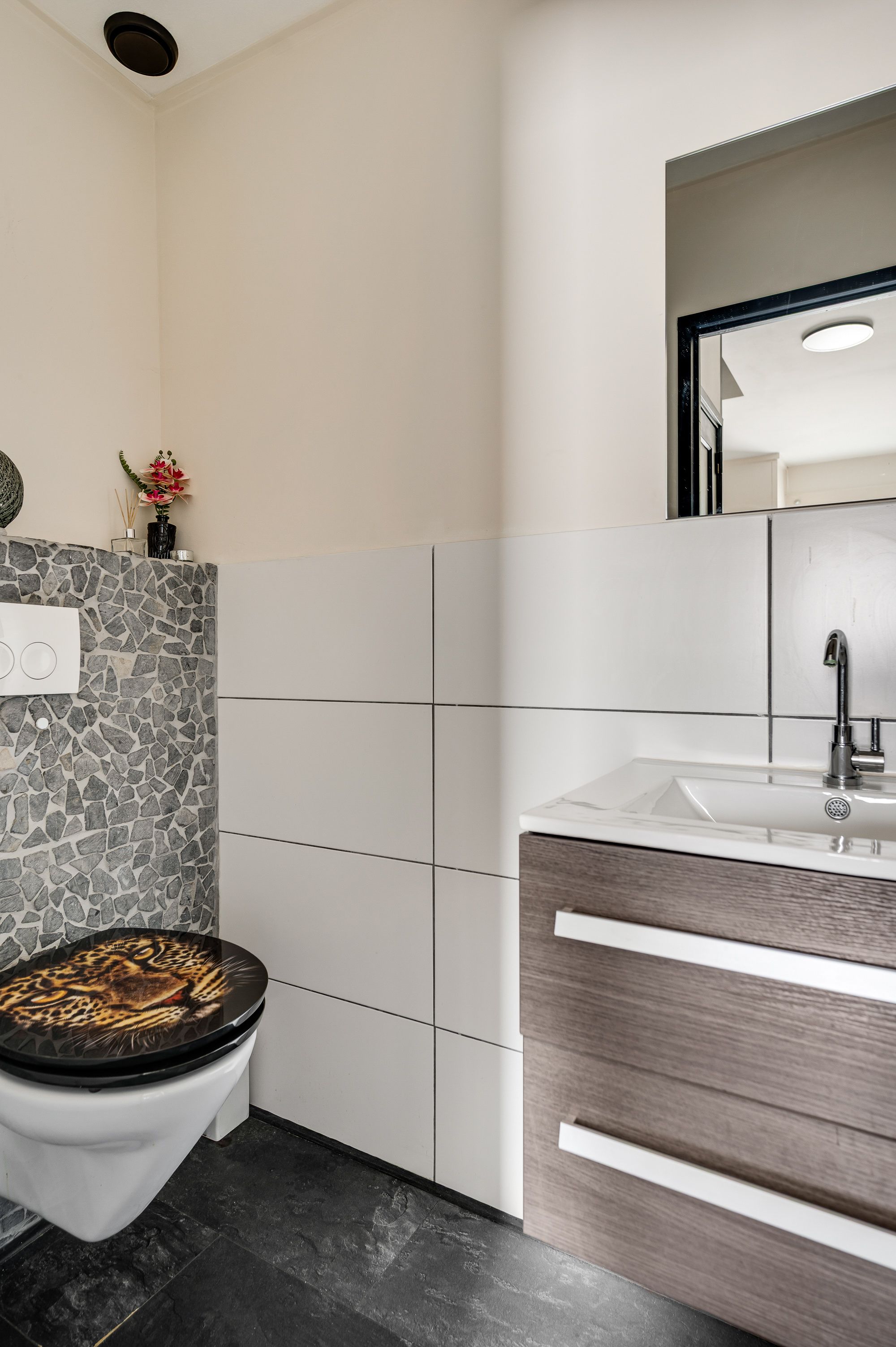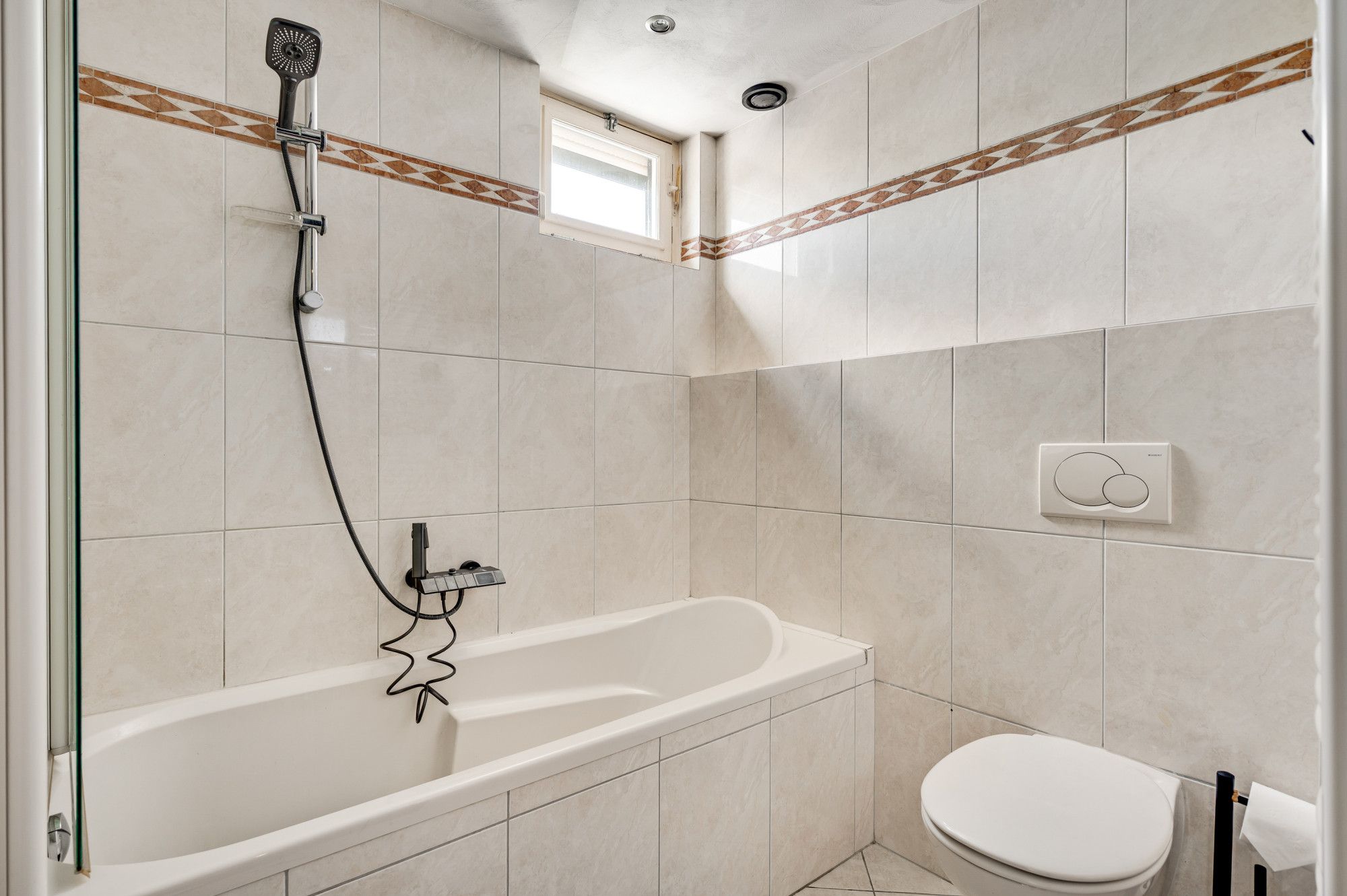 Overloop met vaste kastruimte en toegang tot de eerste 3 slaapkamers en de badkamer. De badkamer is uitgerust met een ligbad, toilet en wastafel met meubel. De eerste verdieping, is met uitzondering van de badkamer, voorzien van een laminaatvloer.