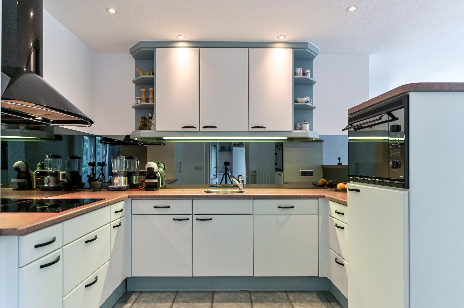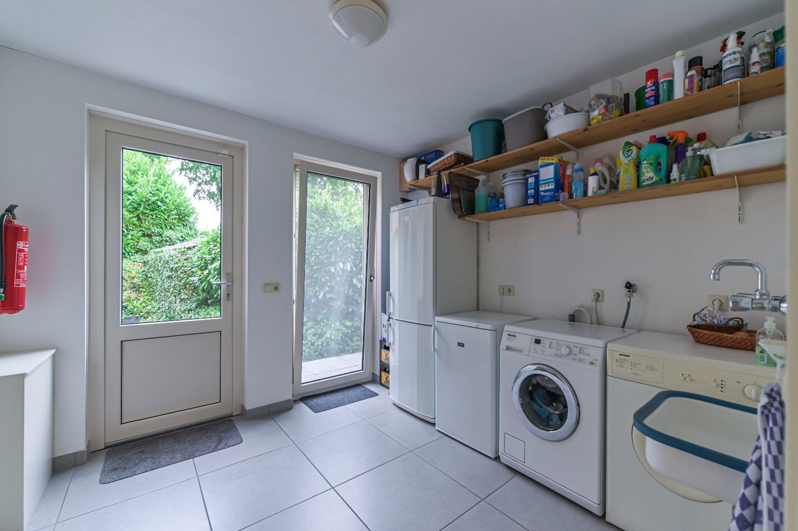Begane grond: Entree met garderobe en meterkast. Hangend toilet met fonteintje. Woonkamer met trapkast, keramische tegels en vloerverwarming en schuifpui welke toegang biedt tot de tuin. Open keuken (1997) is voorzien van een spoelbak en inbouwapparatuur zoals: koelkast, 4-pits inductiekookplaat, afzuigkap, combimagnetron en vaatwasser. De bijkeuken is voorzien van een wasbak en aansluiting voor wasmachine en droger.