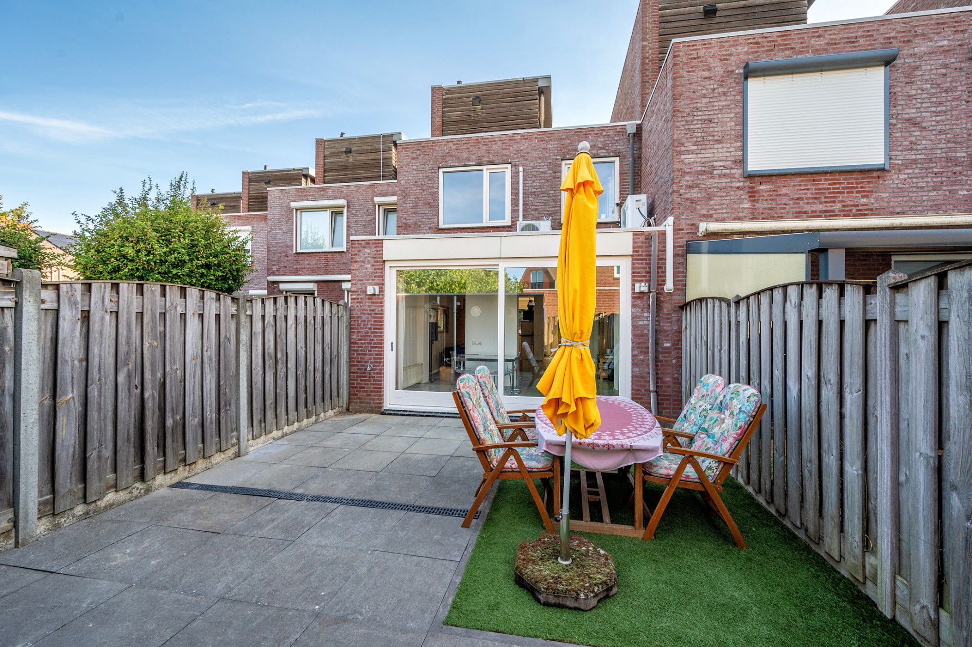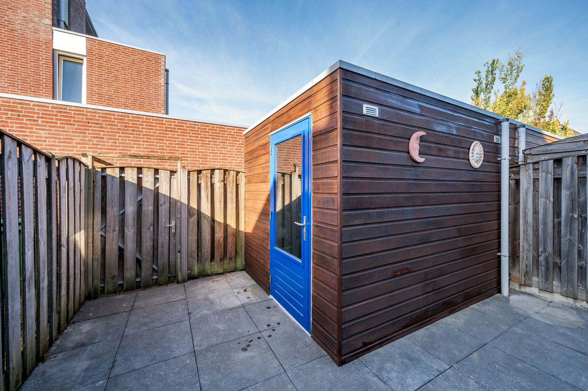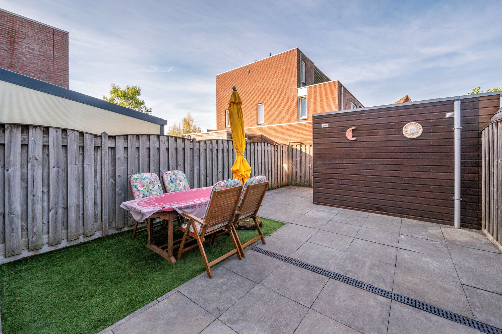 De achtertuin is deels betegeld en deels voorzien van kunstgras. Aan de achterzijde is een berging geplaatst. De tuin is middels een vrije achterom te bereiken.