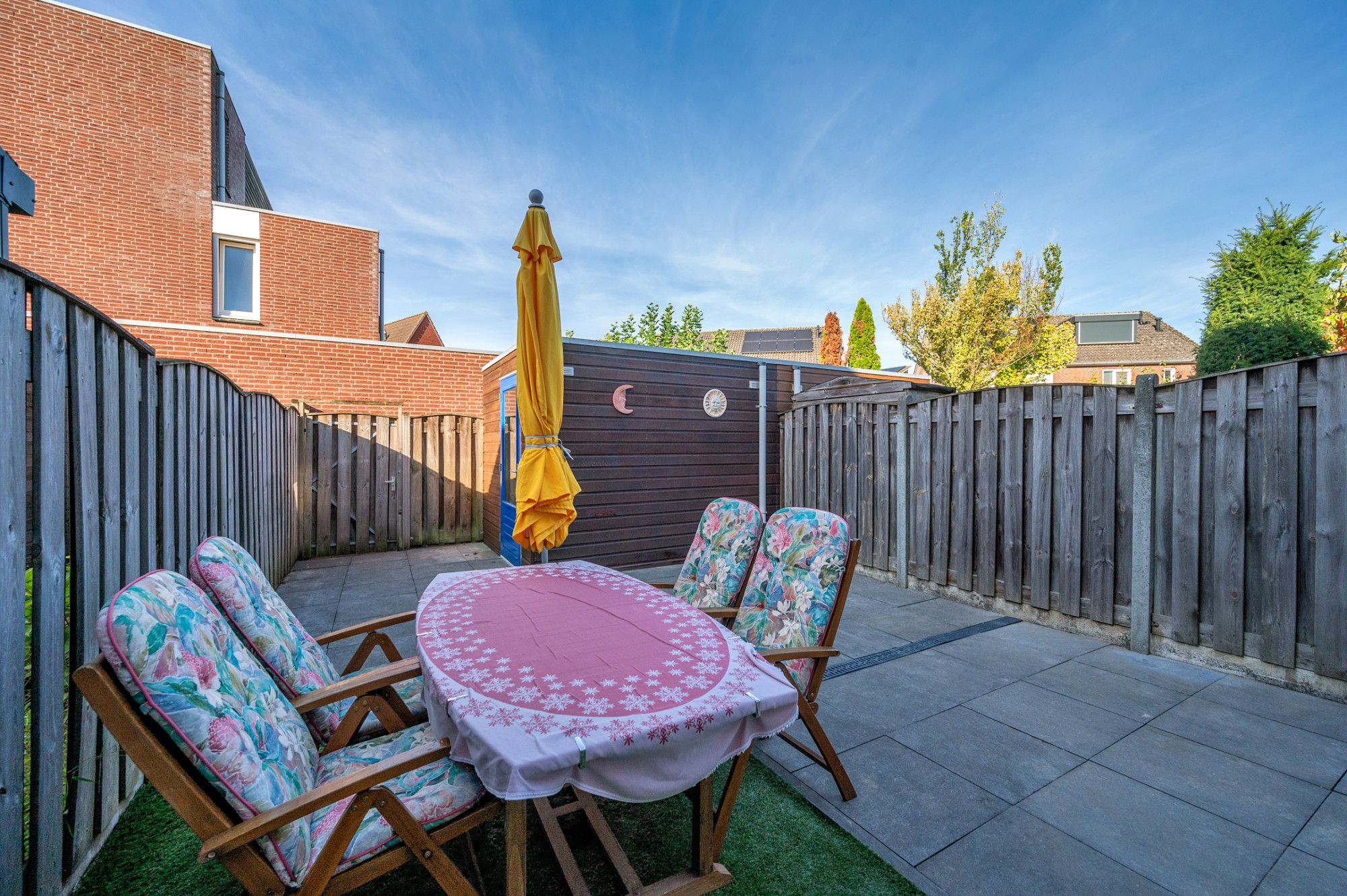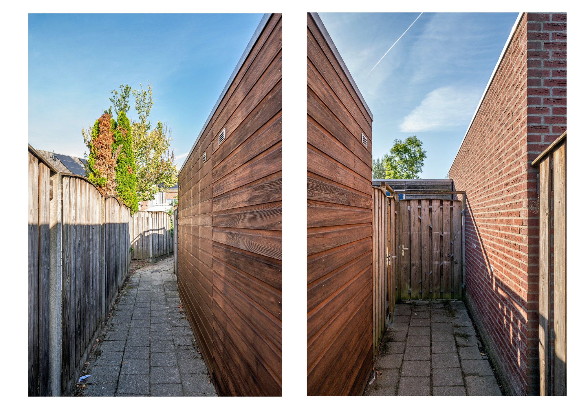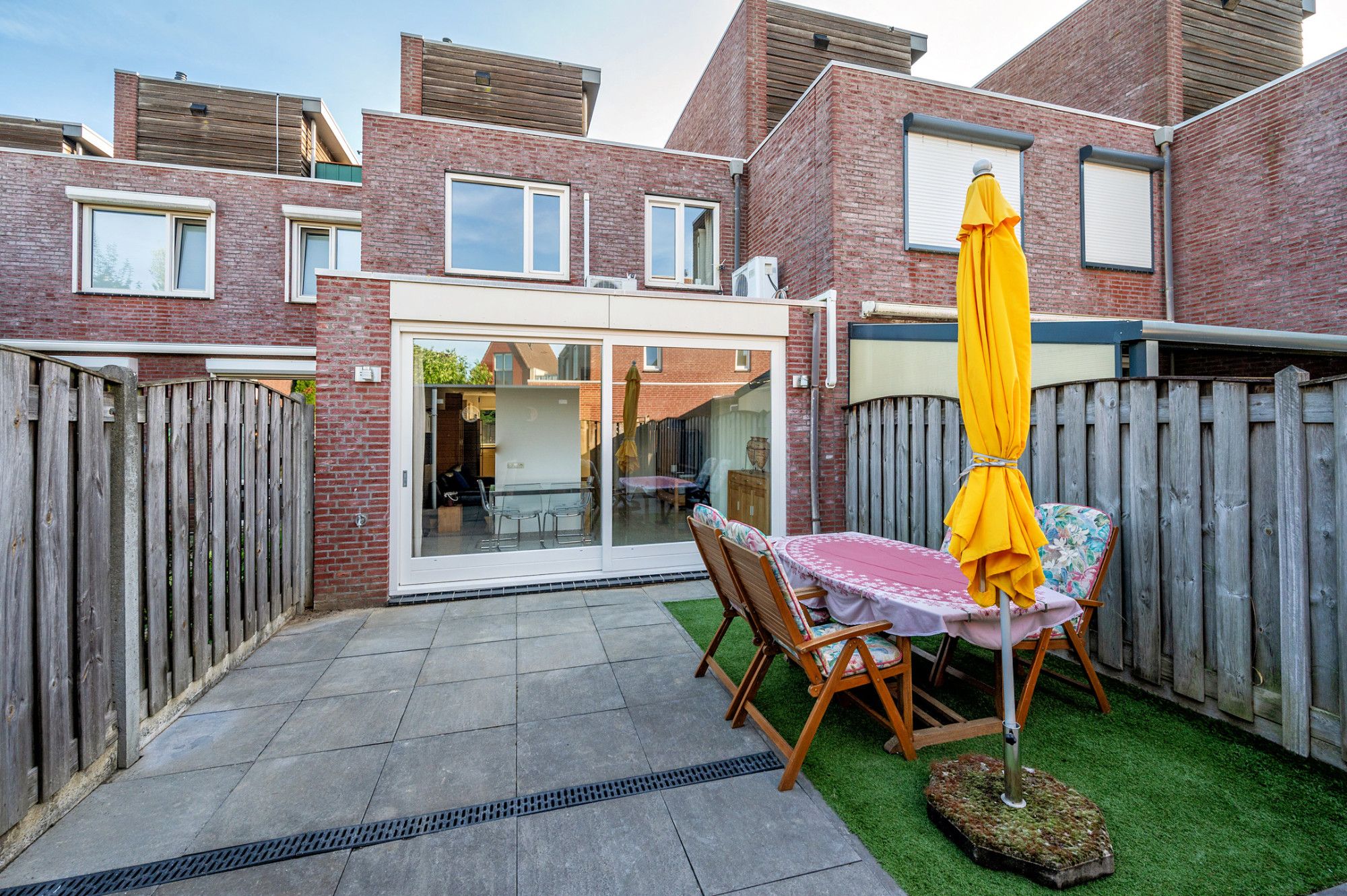 De achtertuin is deels betegeld en deels voorzien van kunstgras. Aan de achterzijde is een berging geplaatst. De tuin is middels een vrije achterom te bereiken.
