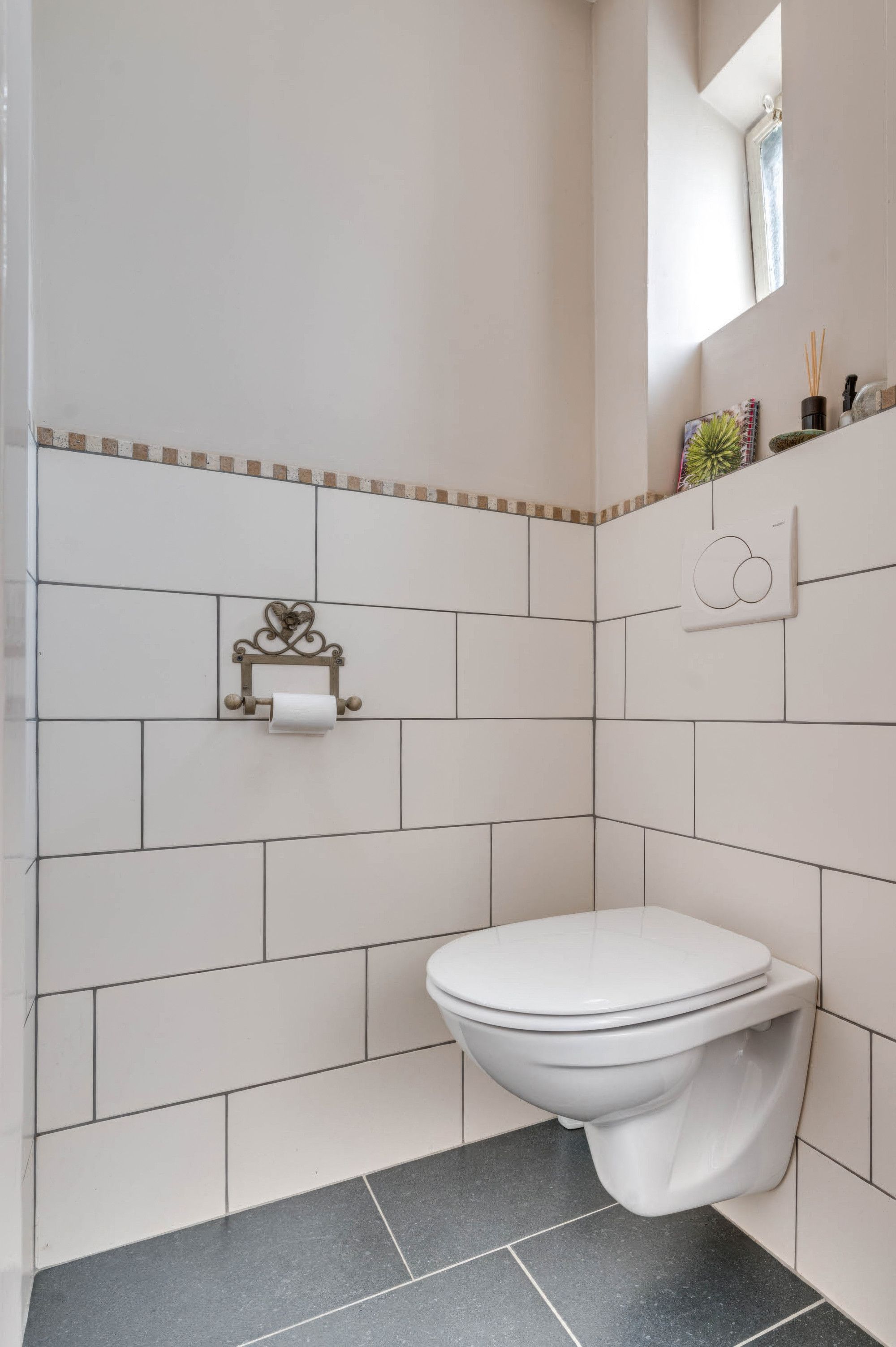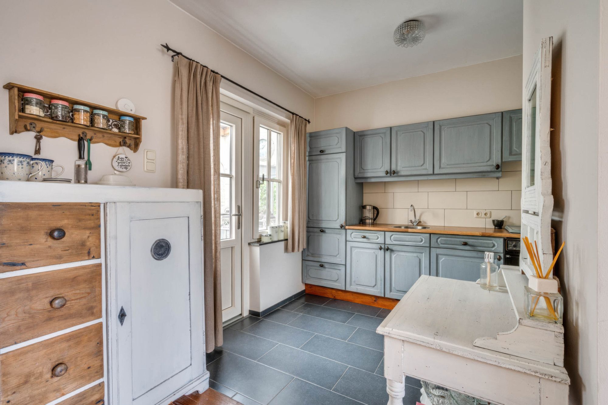 De deels betegelde toiletruimte is voorzien van een zwevend toilet en buitenraam. De keuken is voorzien van een tegelvloer en beschikt over elektrische kookplaat, oven, spoelbak, afzuigkap, koelkast en een loopdeur naar de tuin. De woonkamer is voorzien van een houten vloer en beschikt over een zit en eetgedeelte.