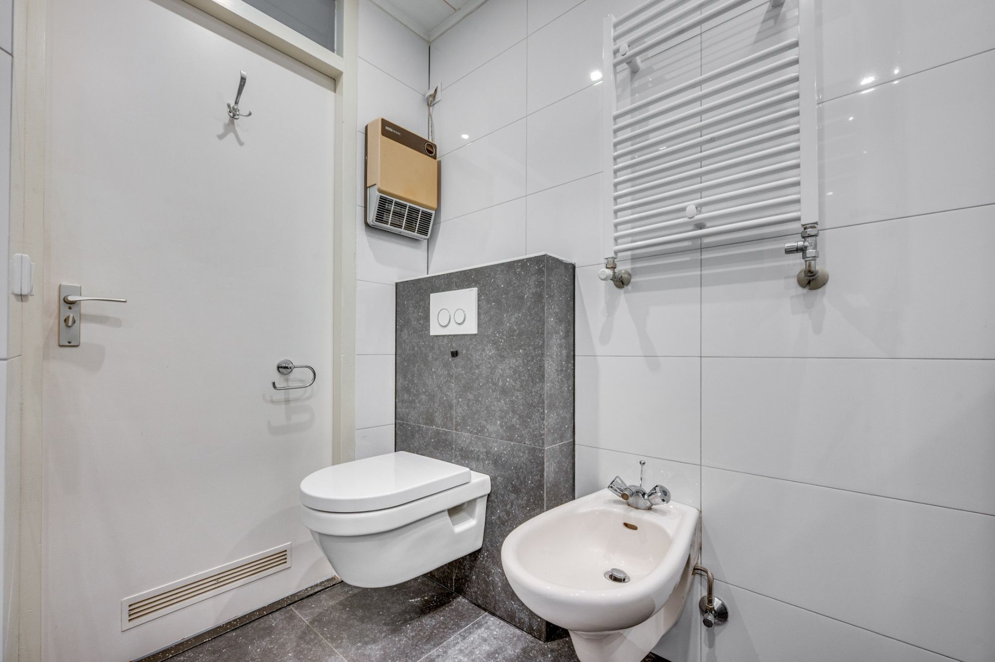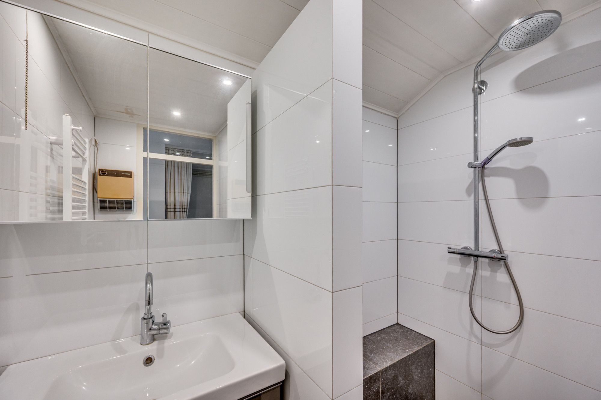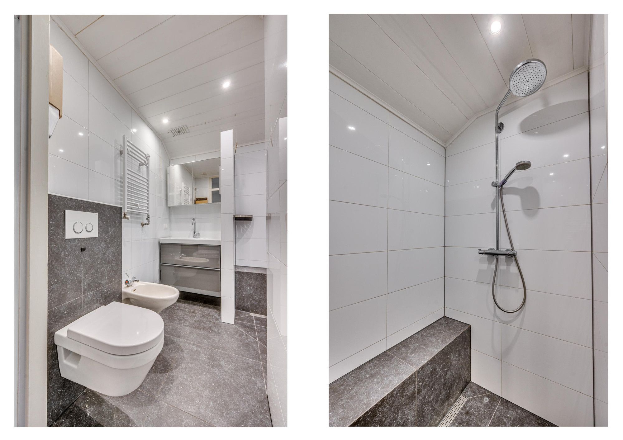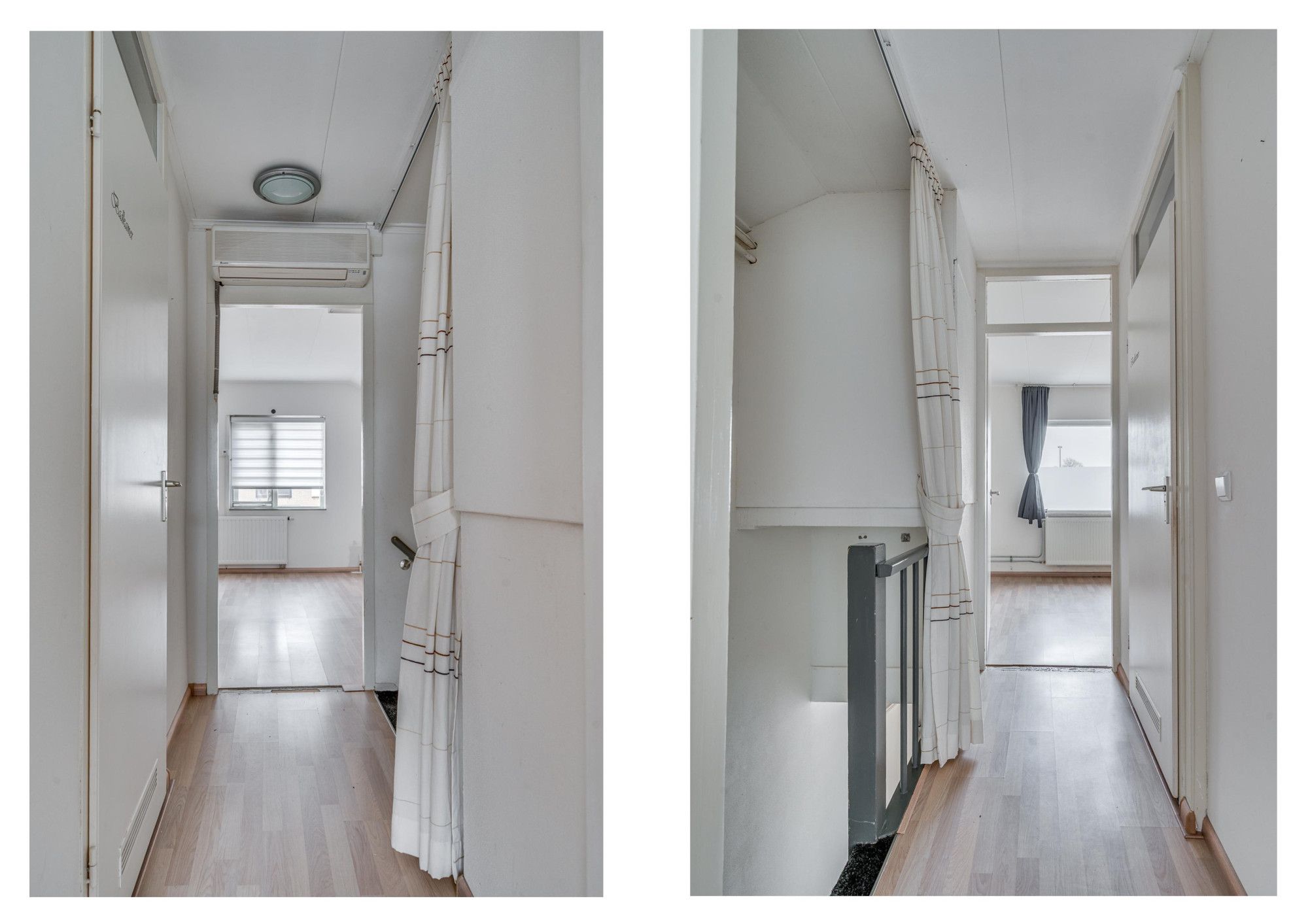 De overloop geeft toegang tot 2 slaapkamers en de badkamer. De overloop en 2 slaapkamers zijn voorzien van een lichte laminaatvloer. De slaapkamers zijn ca. 13,5m² en ca. 18,5m² groot. De masterbedroom aan de achterzijde van de woning beschikt over een grote inbouwkast, muurkast en de vlizotrap naar de bergzolder. De geheel betegelde badkamer is voorzien van een inloopdouche, wastafel met meubel, zwevend toilet, bidet en designradiator.