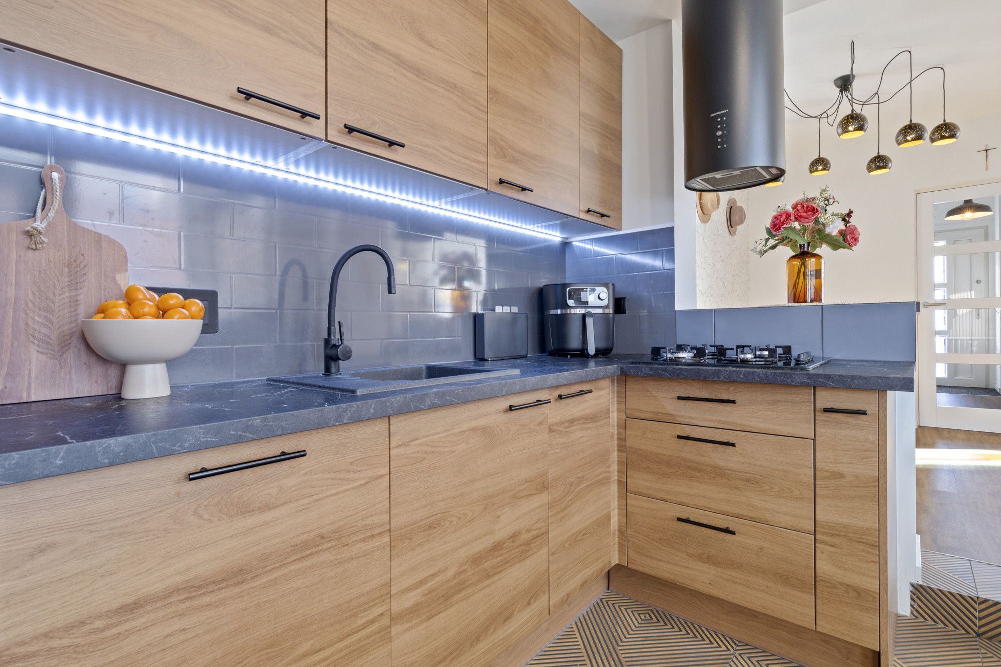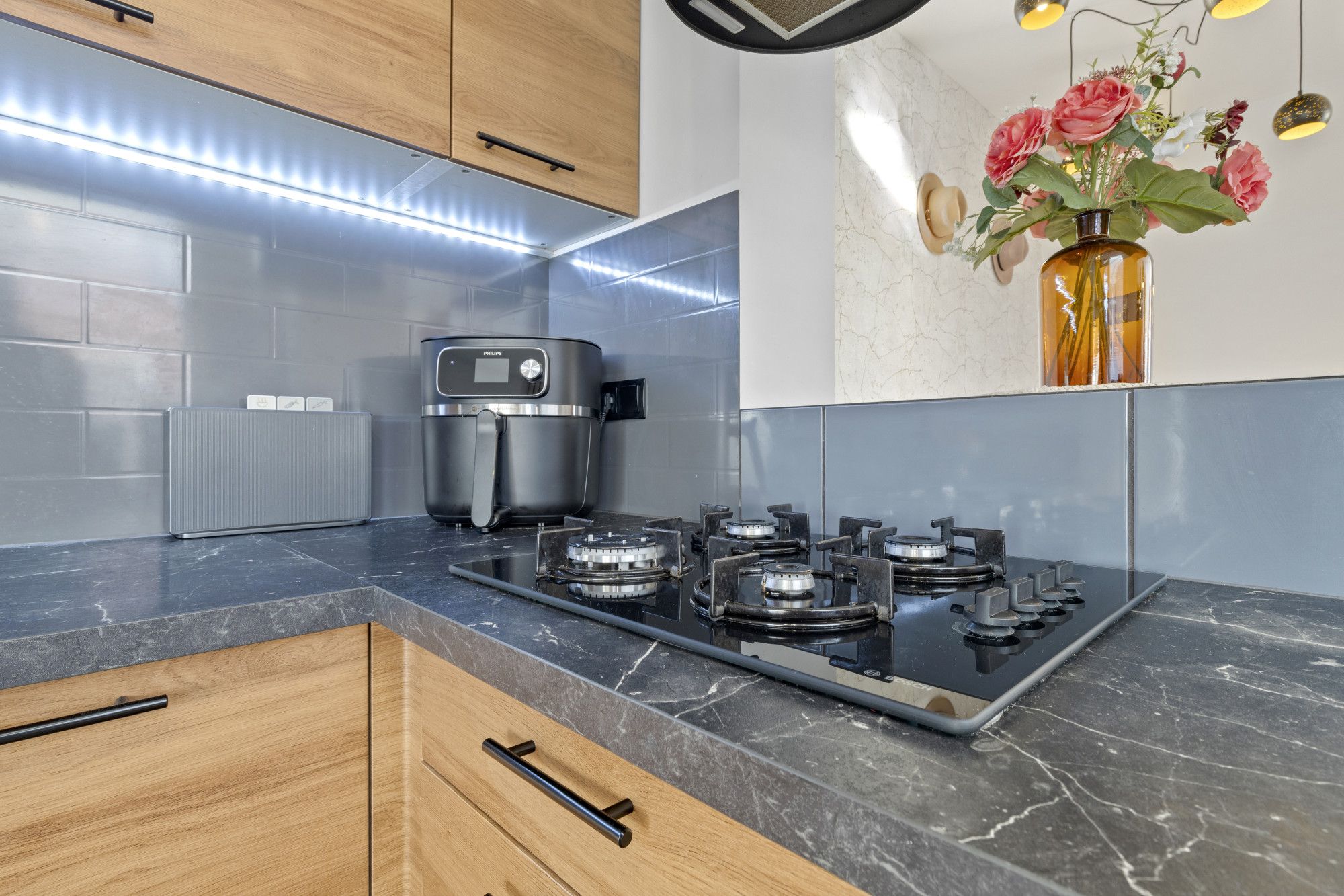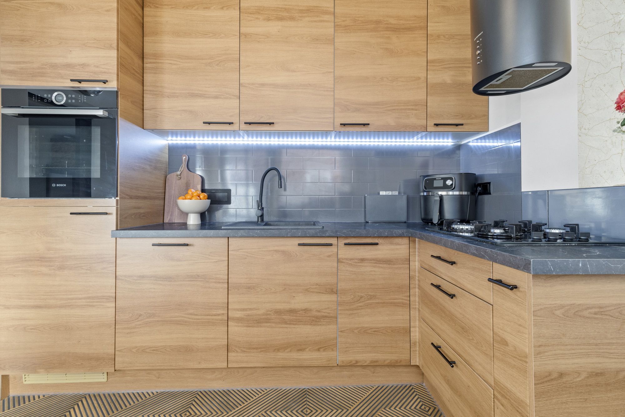 Lager gelegen moderne semi-open keuken met stijlvolle houtlook tegelvloer, uitgevoerd in een praktische L-opstelling en voorzien van inbouwapparatuur zoals een 4-pits gaskookplaat met afzuigkap, vaatwasser, combioven. In de keuken is wel ruimte voor het plaatsen van een koelkast.