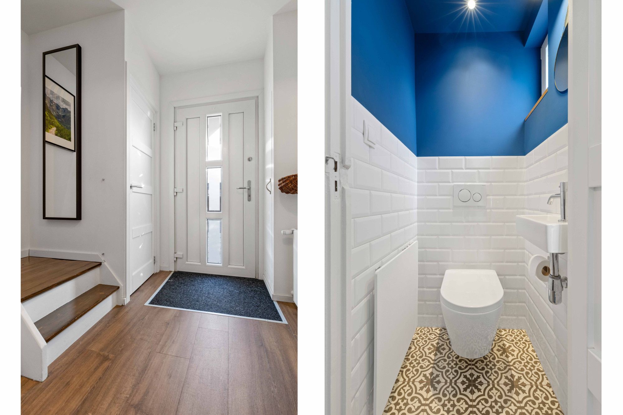 Netjes afgewerkte toiletruimte met hangend toilet en fonteintje.