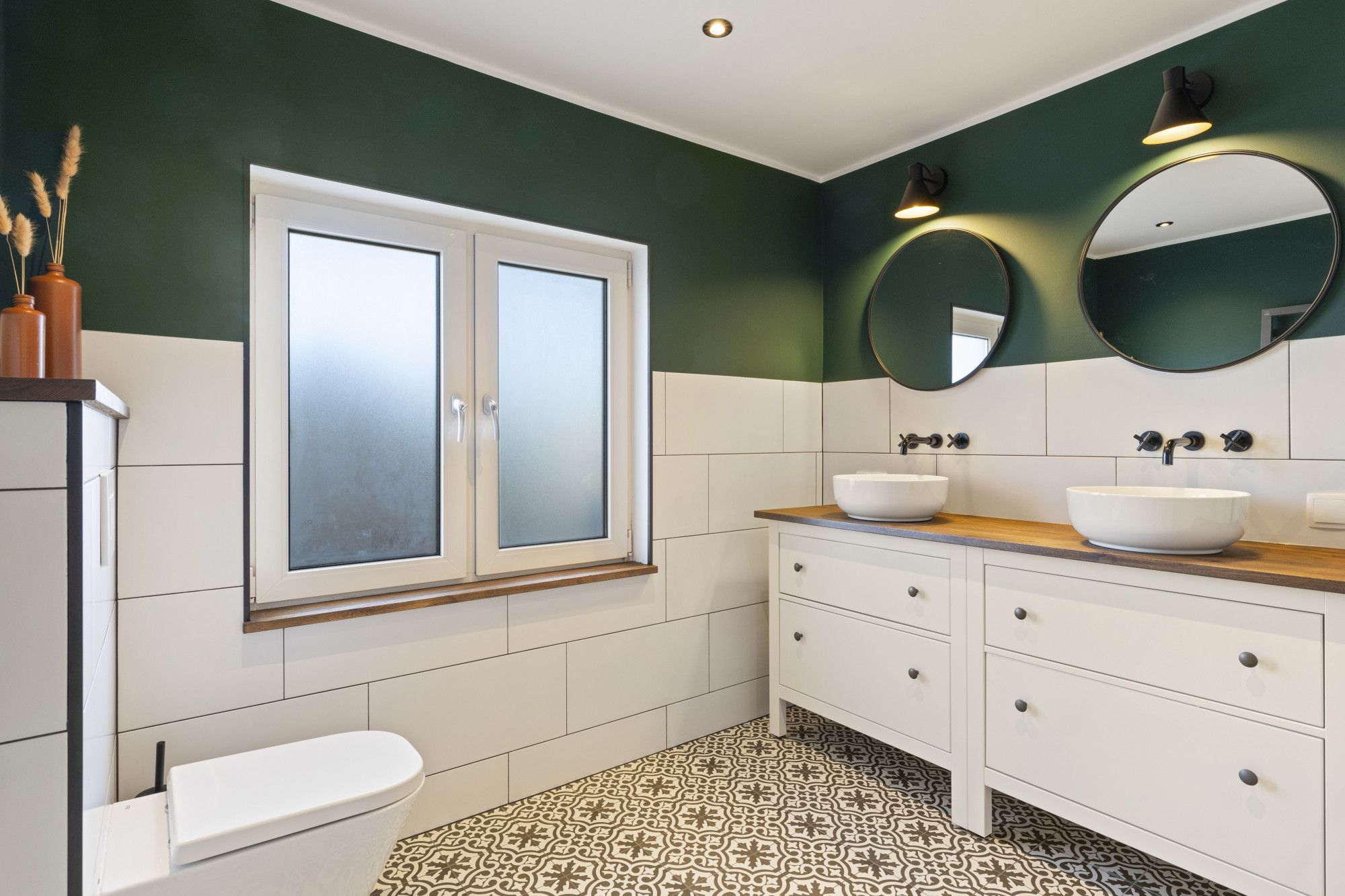 Luxe uitgevoerde badkamer met tweede toilet, royaal badmeubel met dubbele wastafel, grote inloopdouche en elektrische vloerverwarming.