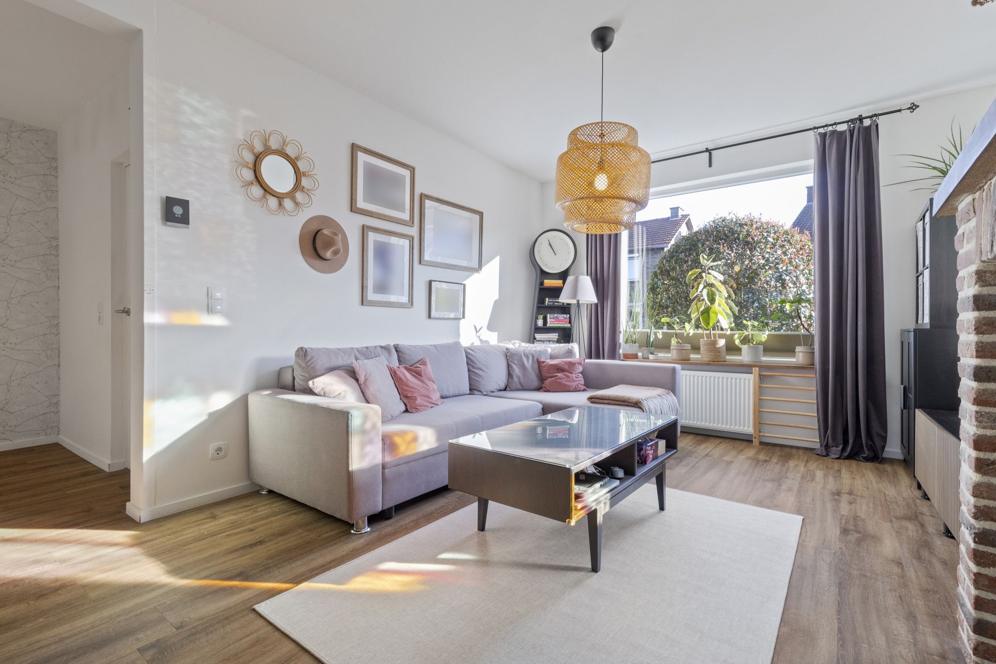 Ruime L-vormige woonkamer met laminaatvloer en sfeervol glas-in-loodraam, wat zorgt voor een warme uitstraling.