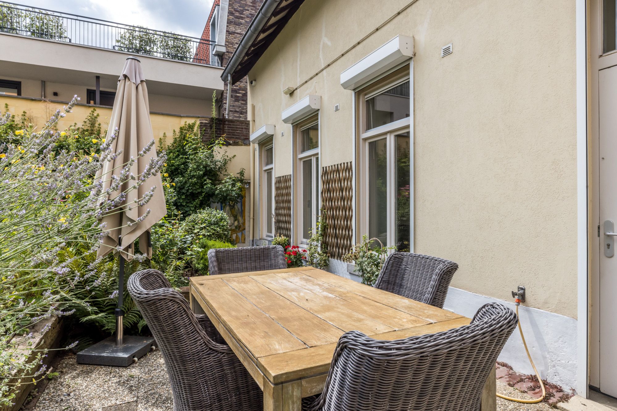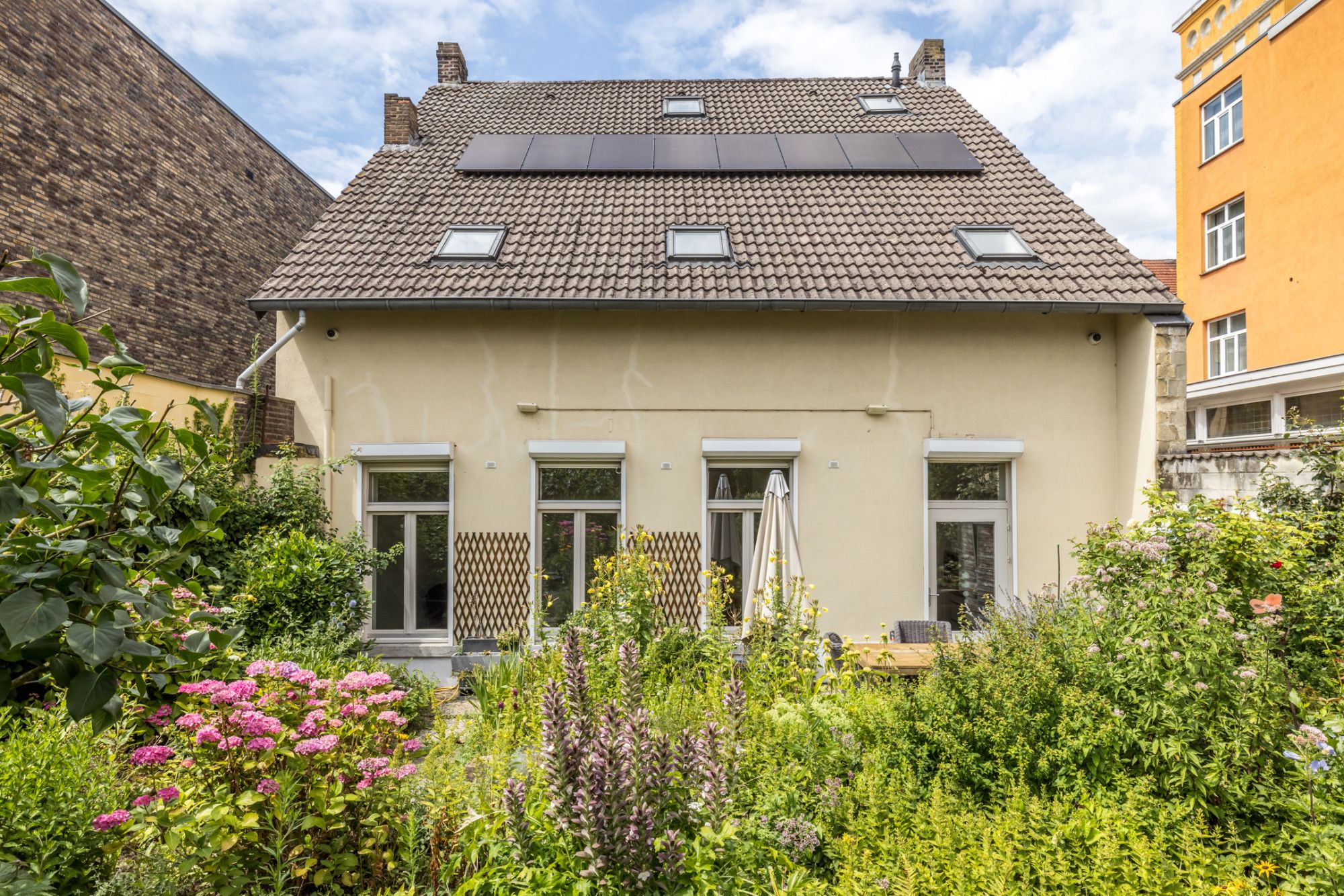 - sfeervolle stadstuin met achteringang (middels recht van overpad/erfdienstbaarheid), deels ommuurd met mergelwanden.