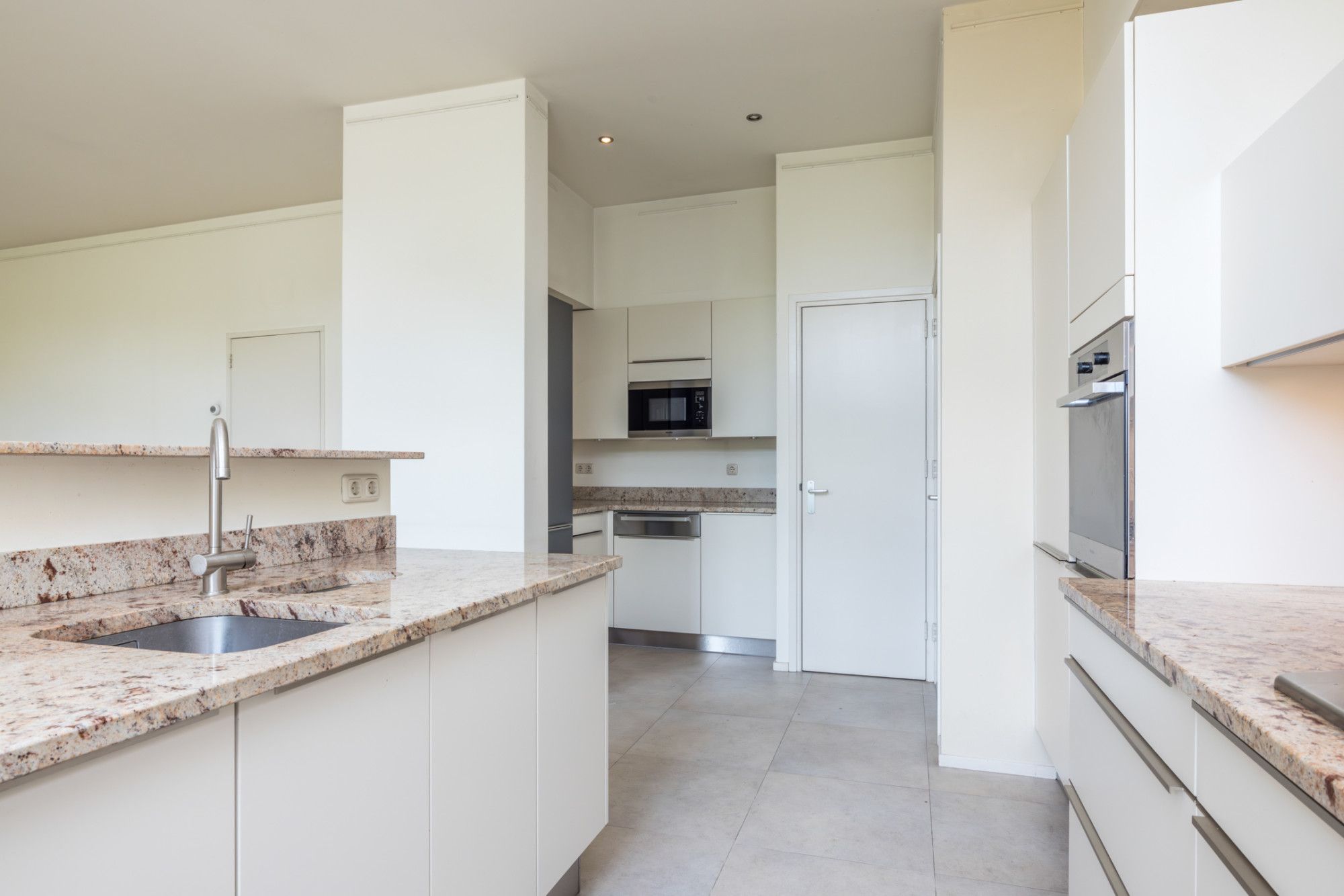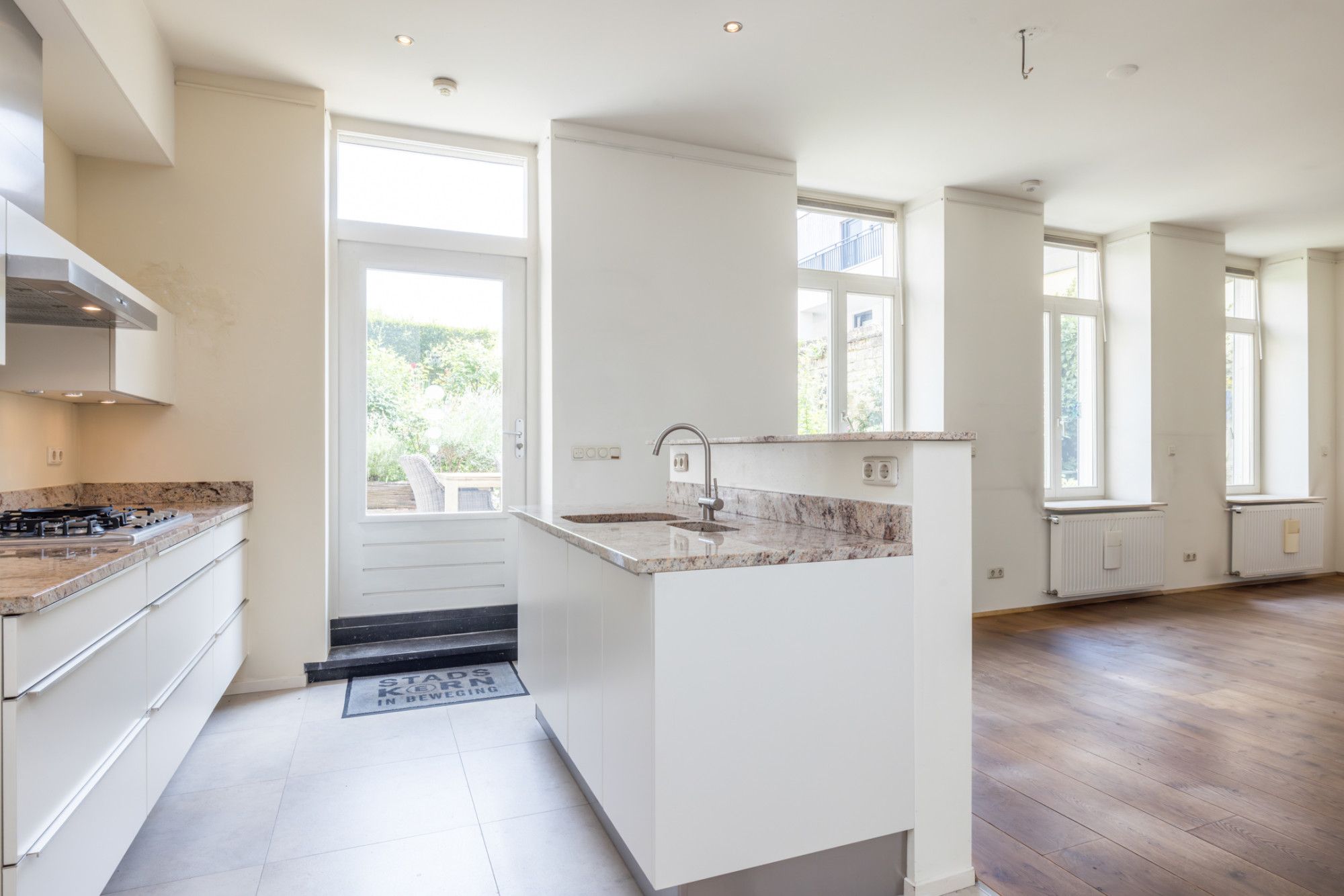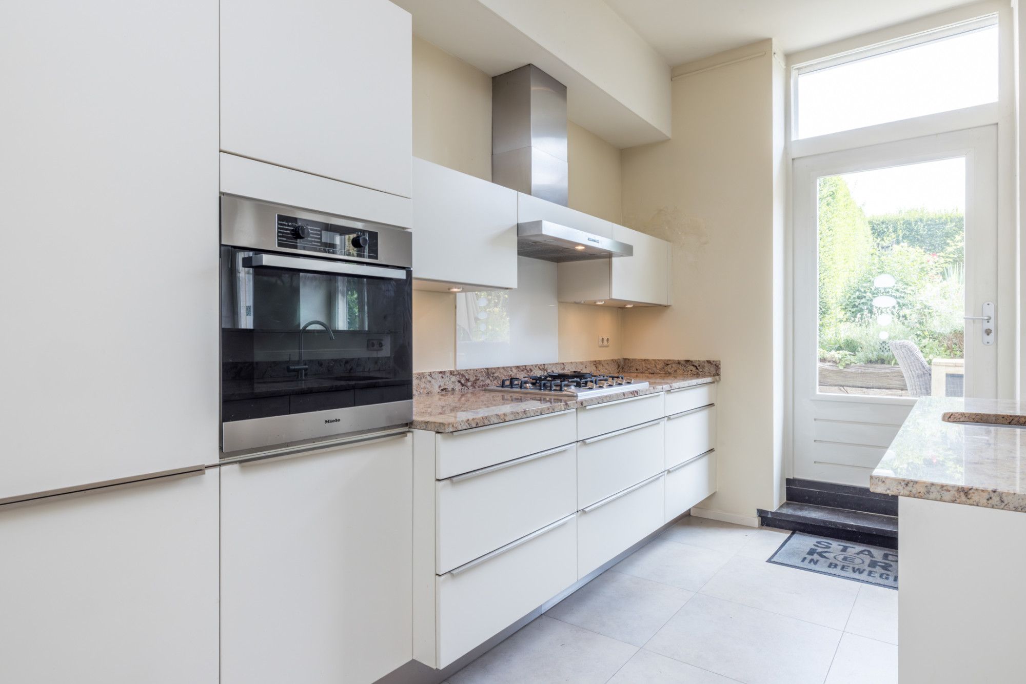 - open keuken met tegelvloer en moderne keukenopstelling voorzien van vaatwasser, koel- en vriescombinatie, 5 pits gascomfort met wokbrander, afzuigkap, oven, magnetron, warmhoudlade en granieten aanrechtblad en tevens muurkast met witgoedaansluitingen en toegang tot het souterrain en de stadstuin