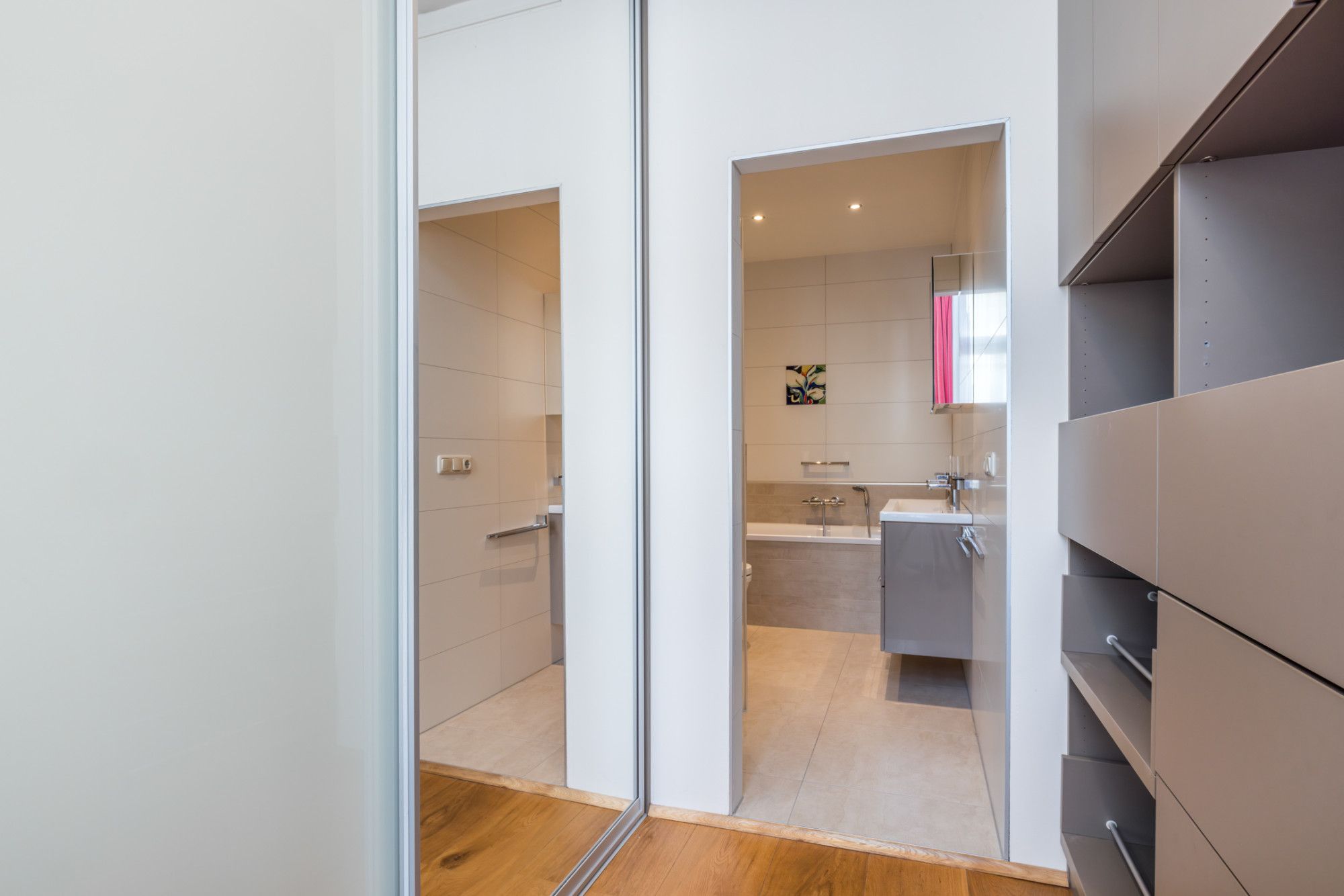 - slaapkamer met moderne walk-in closet, parketvloer en badkamer en suite