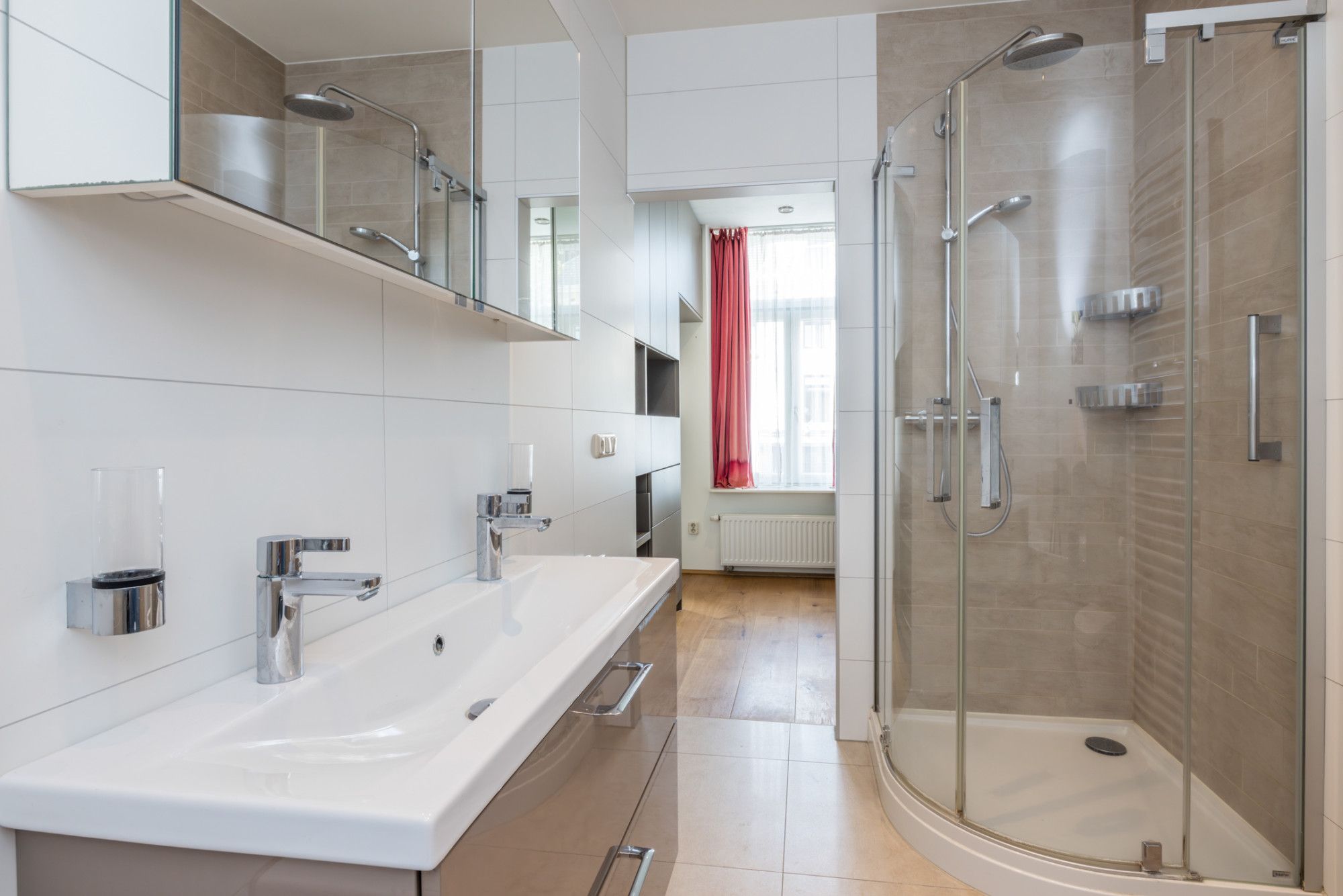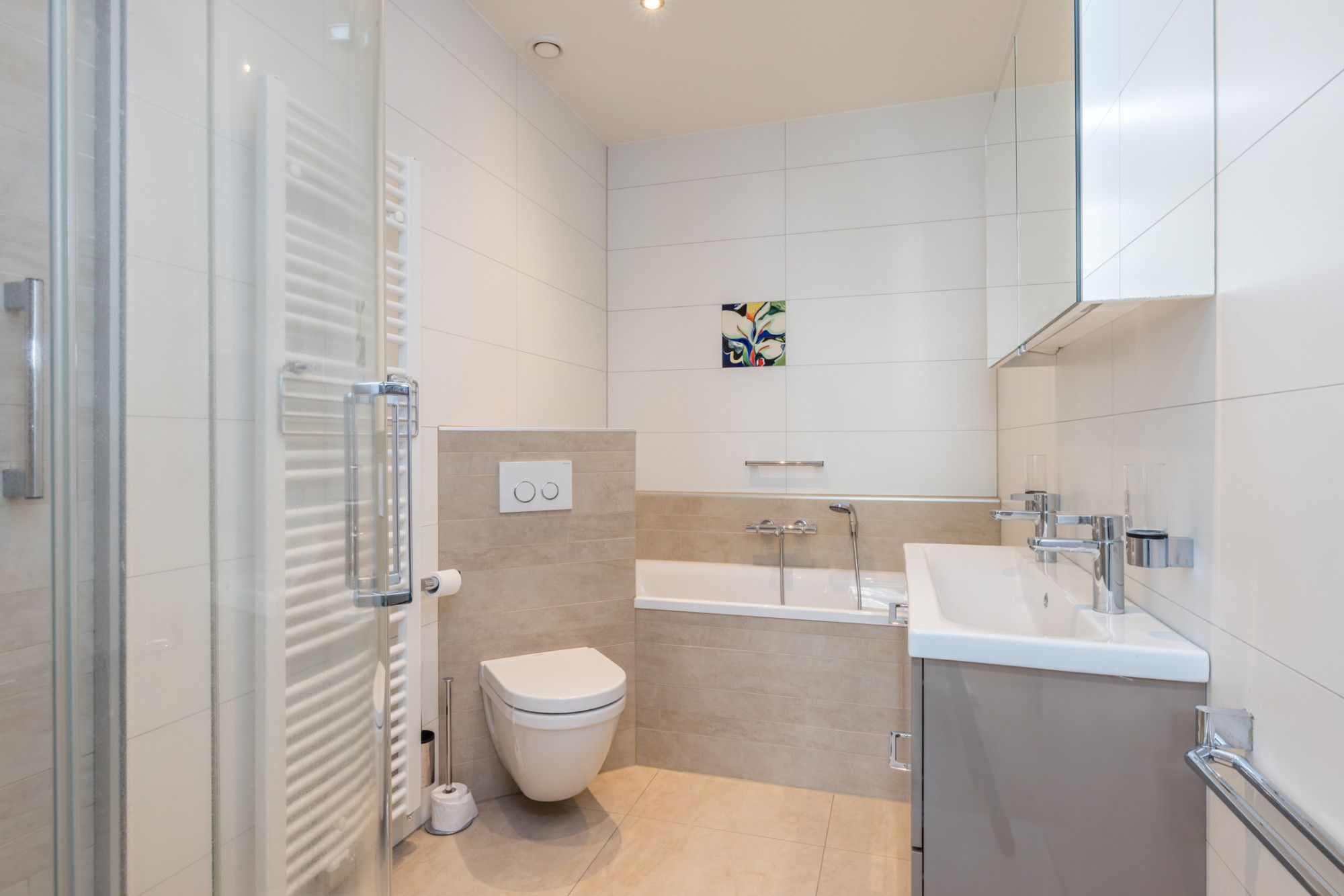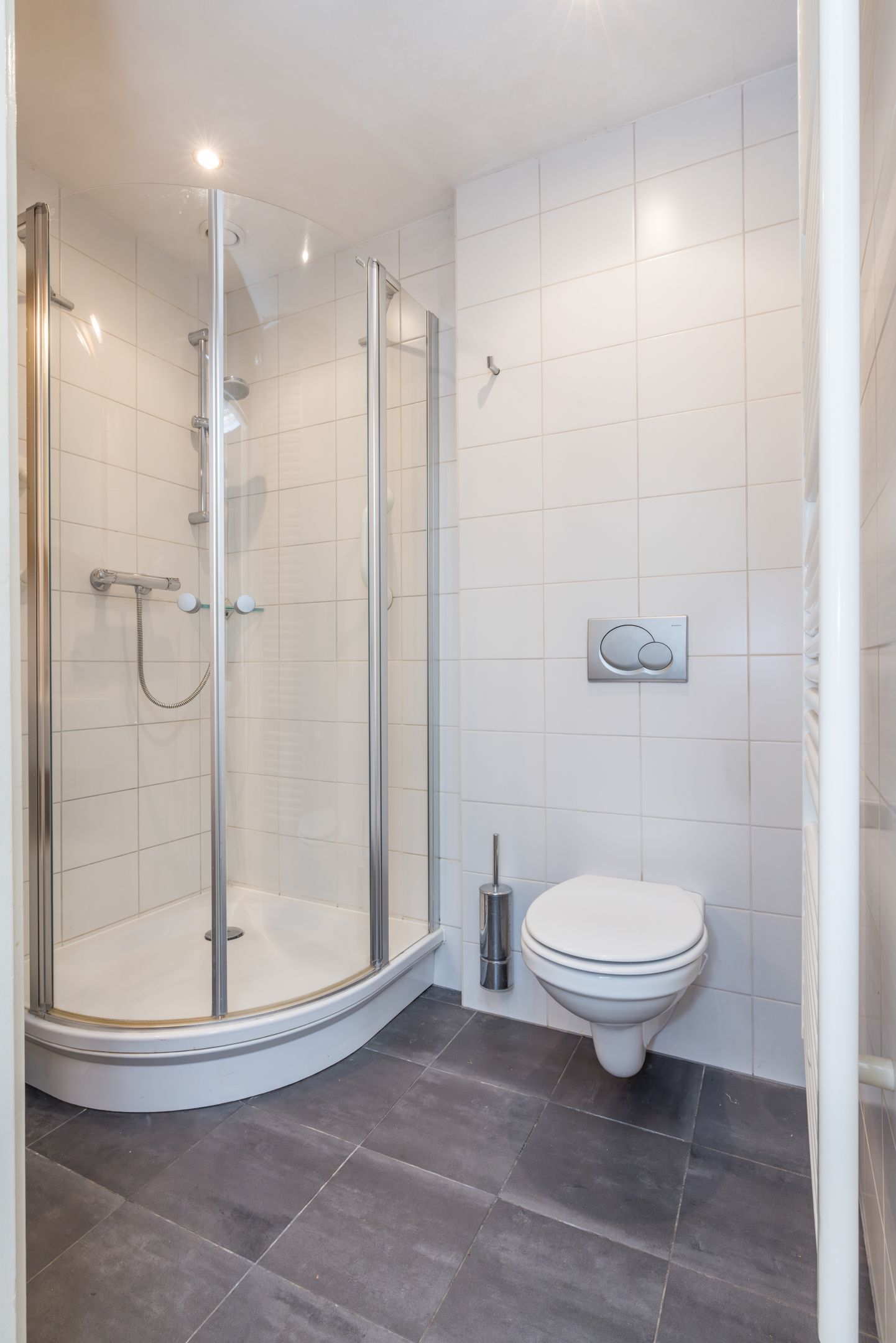 - badkamer met douchecabine, hangend closet en wasbak