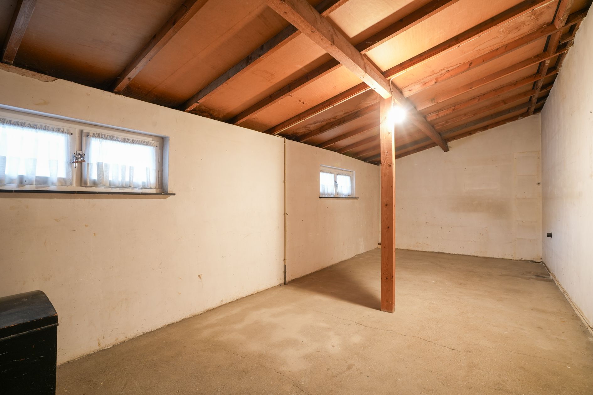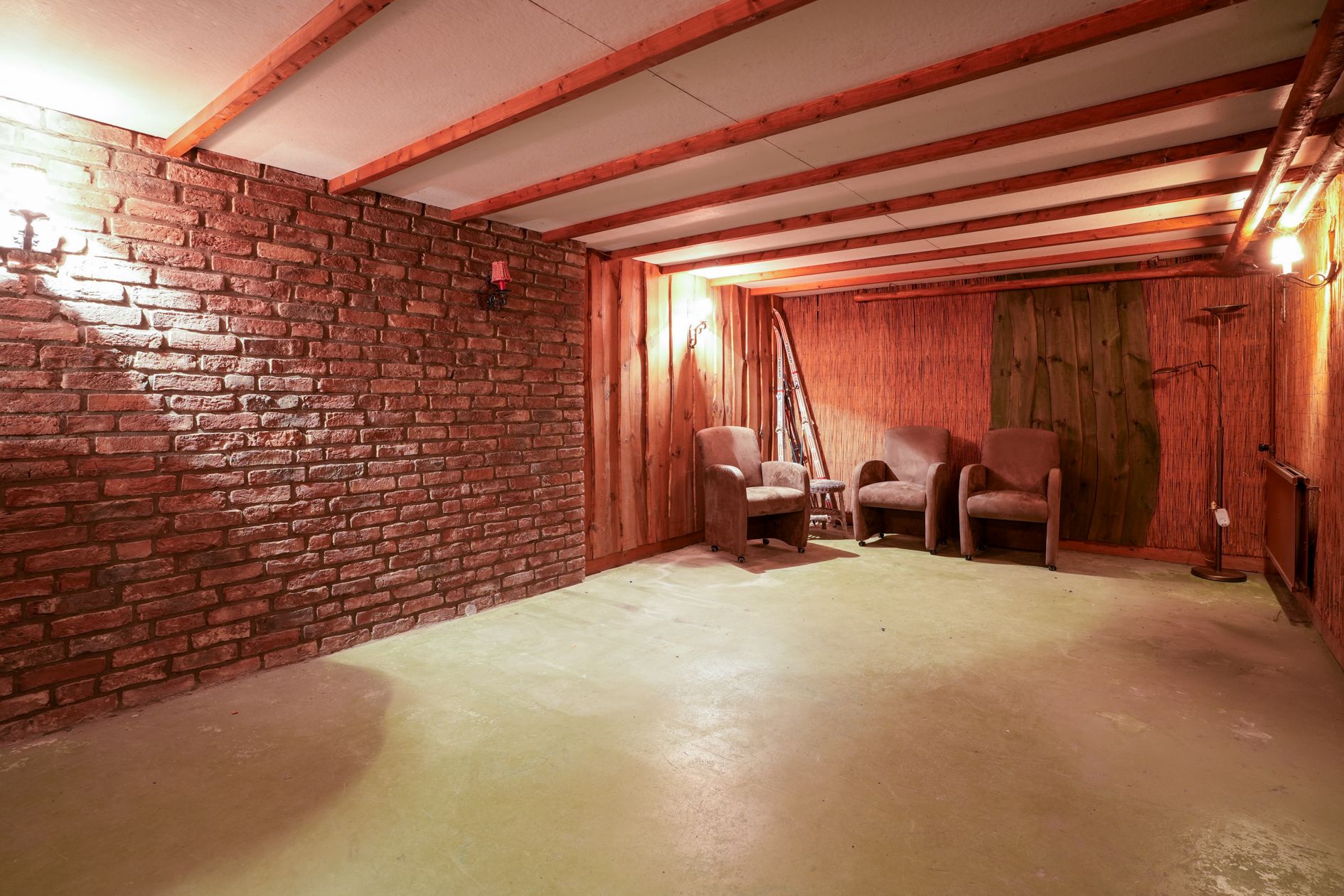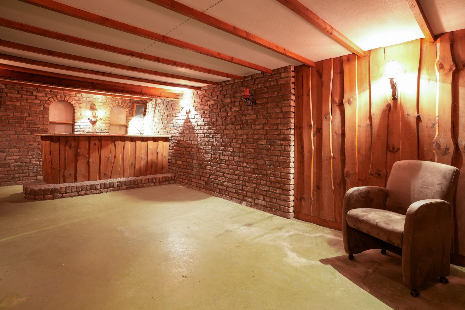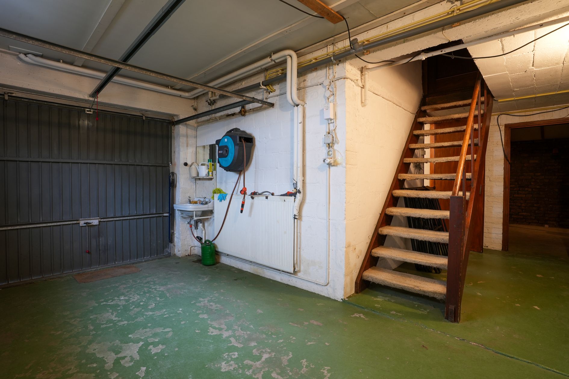 De open houten trap naar de kelder verschaft toegang tot twee garages (beide zijn voorzien van stalen kantelpoorten), een kelderbar en meerdere opslagruimtes en berging met CV ketel (Remeha Quinta, 2006, eigendom).