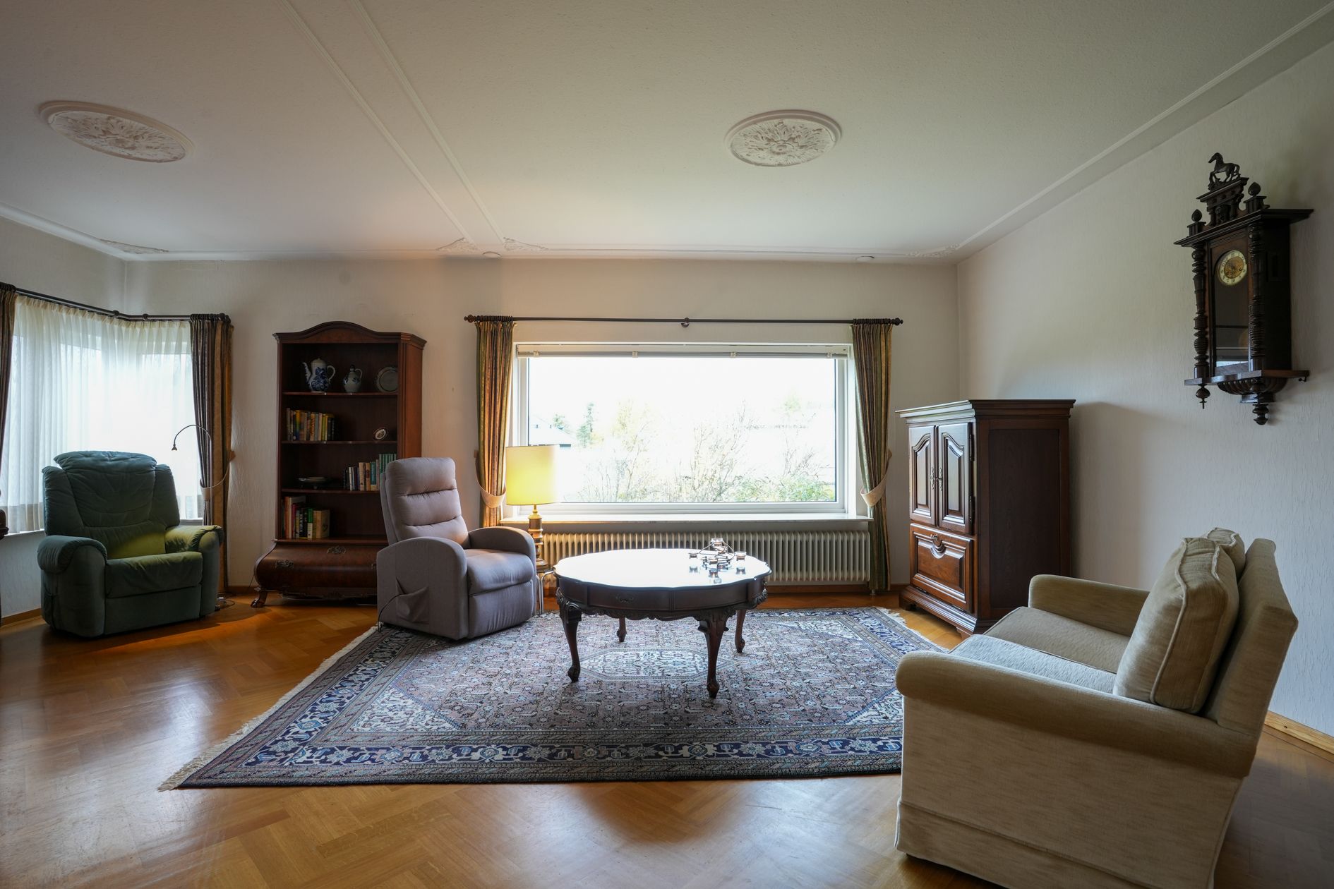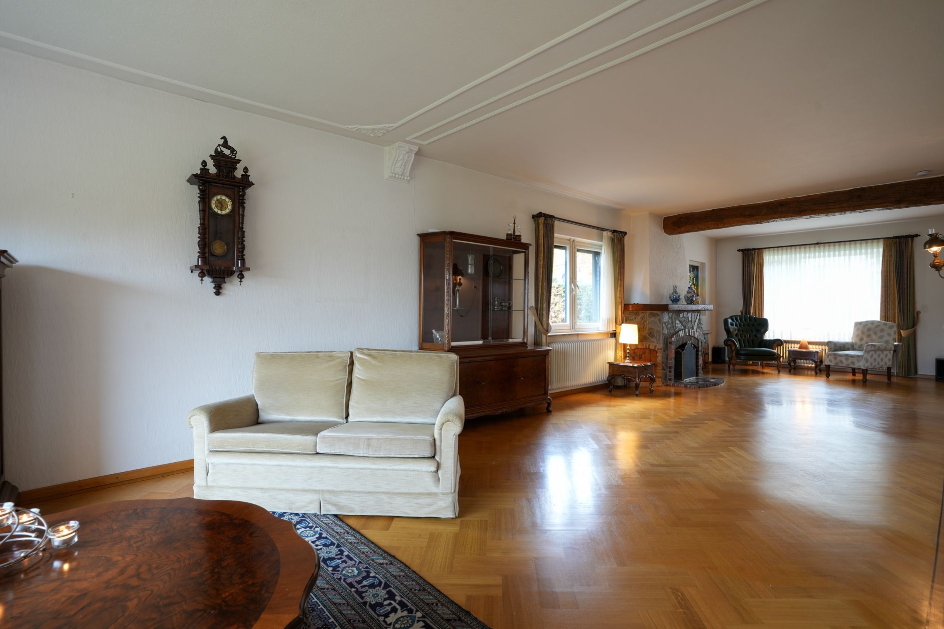 De zeer ruim opgezette woonkamer biedt de mogelijkheid tot het realiseren van een open keuken / kookeiland. De woonkamer verschaft een fraai uitzicht op de uitstekend onderhouden tuin (met tuinberging) aan de achterzijde. Vanuit de tuin wordt middels de garages toegang verleend tot de diverse kelderruimtes.