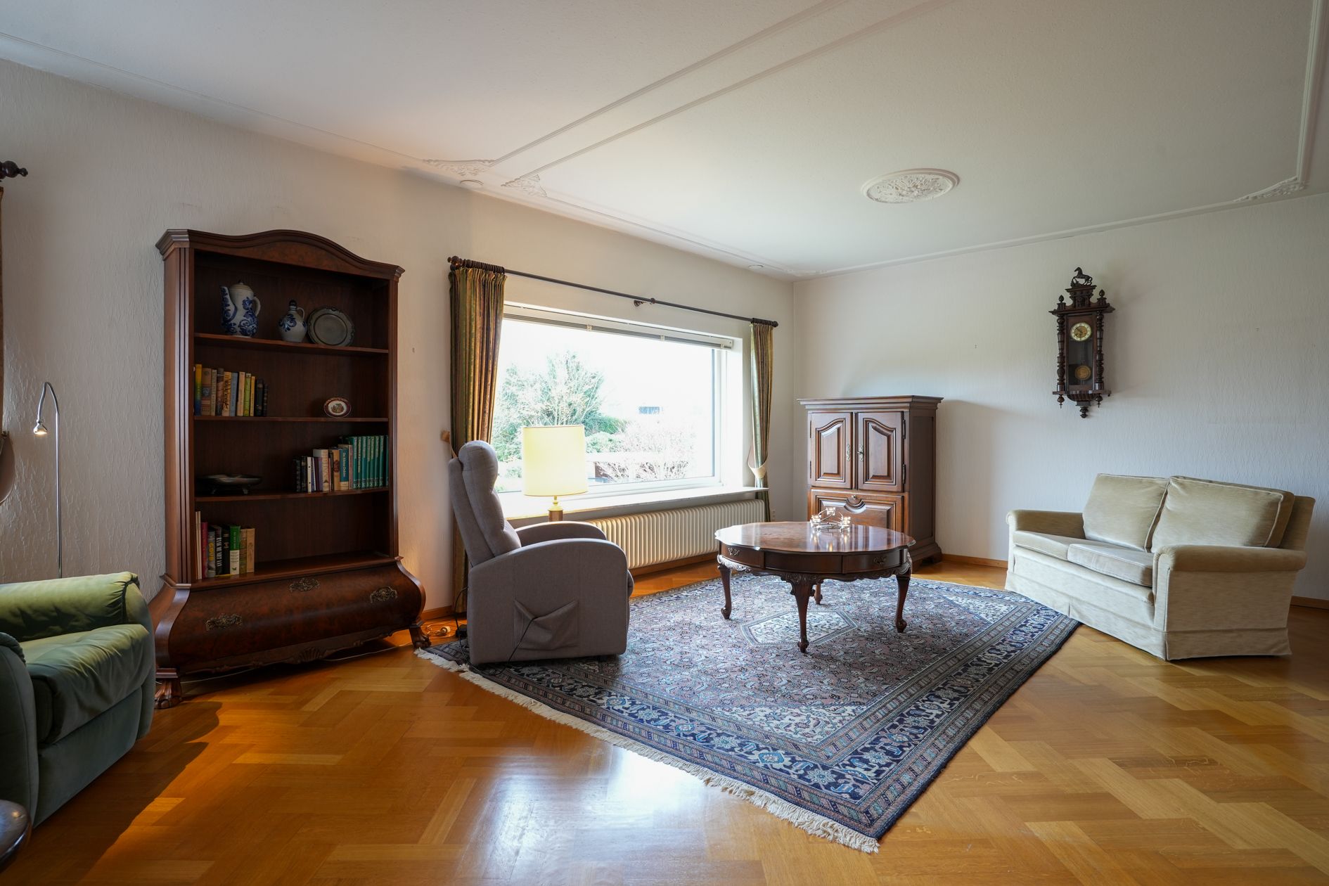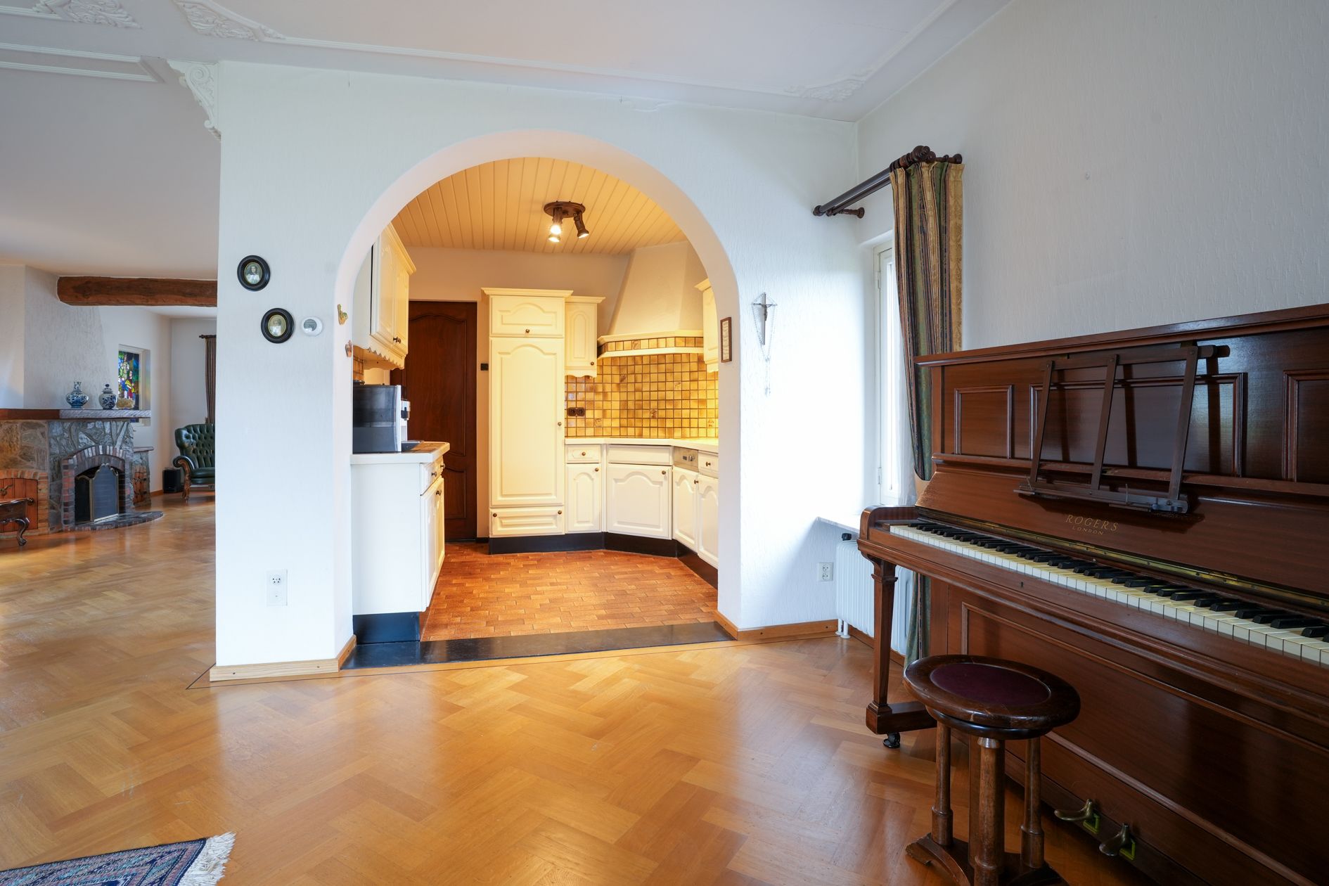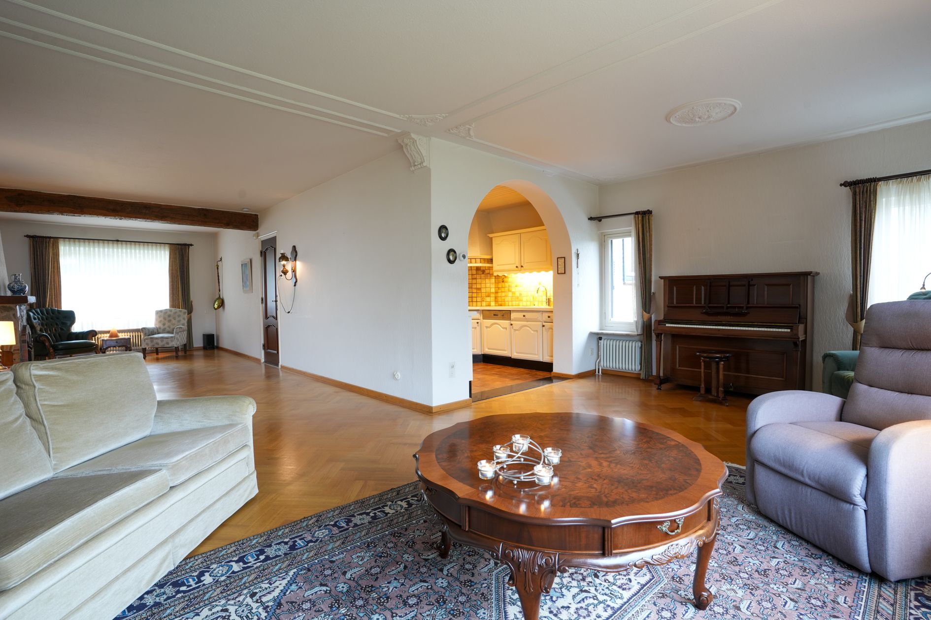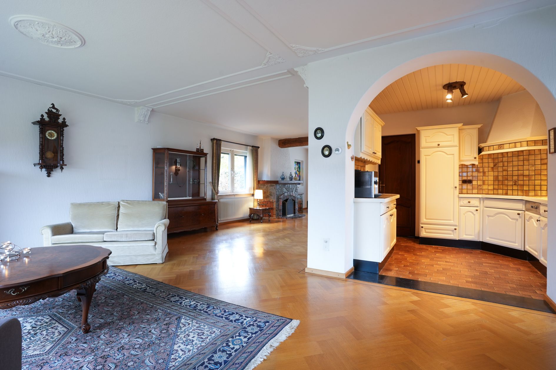 De achterzijde van de woonkamer biedt uitzicht op de ruime achtertuin. Halfopen keuken met inbouwapparatuur.