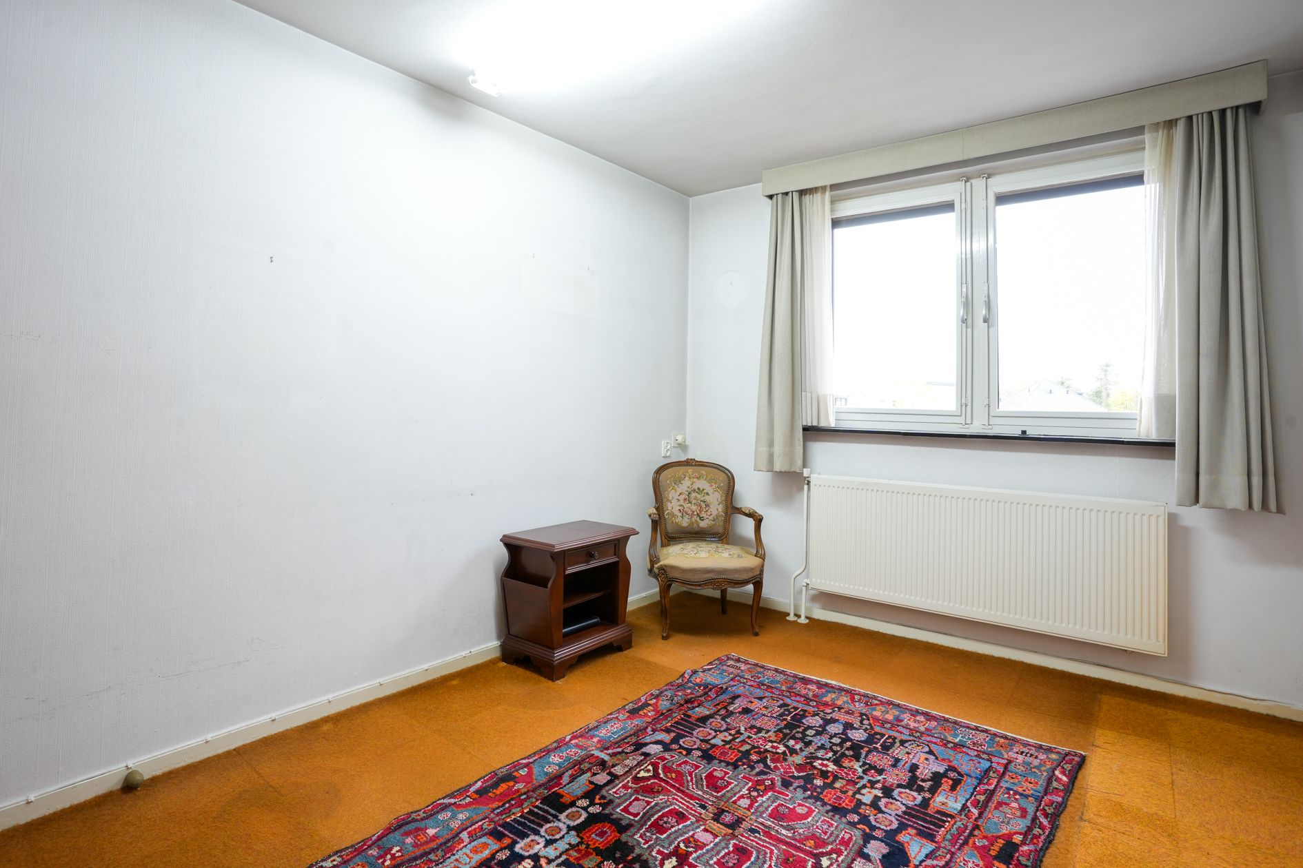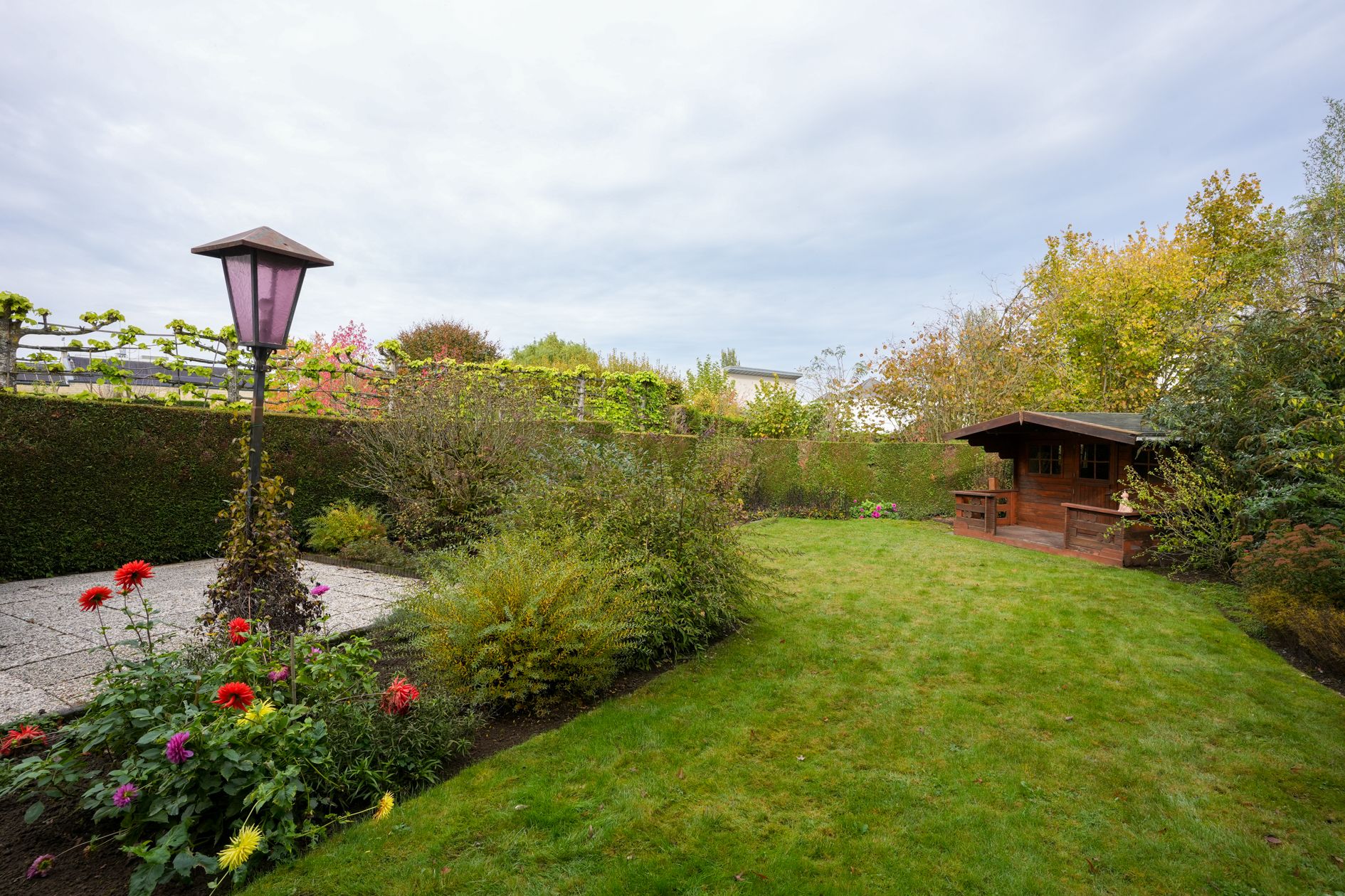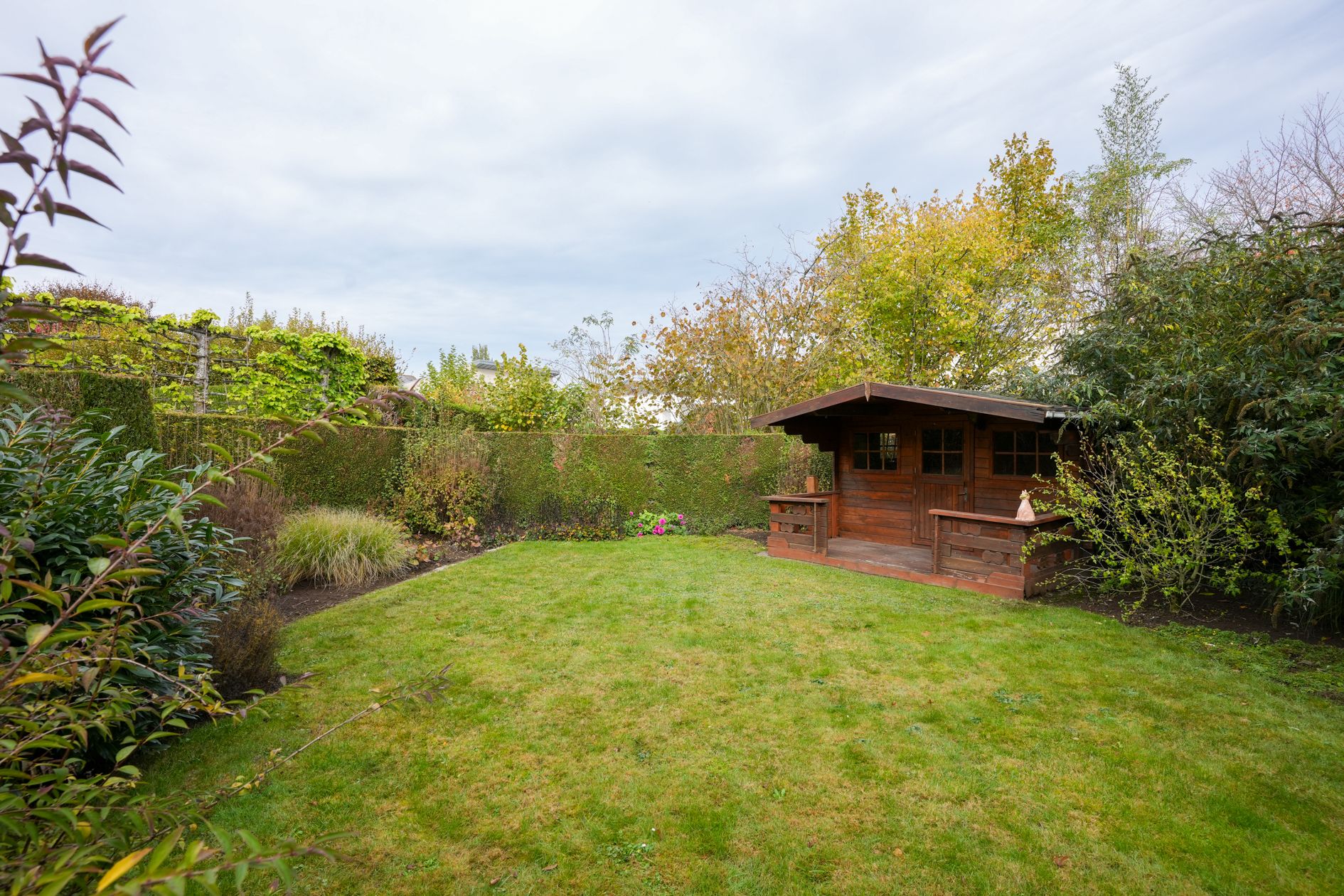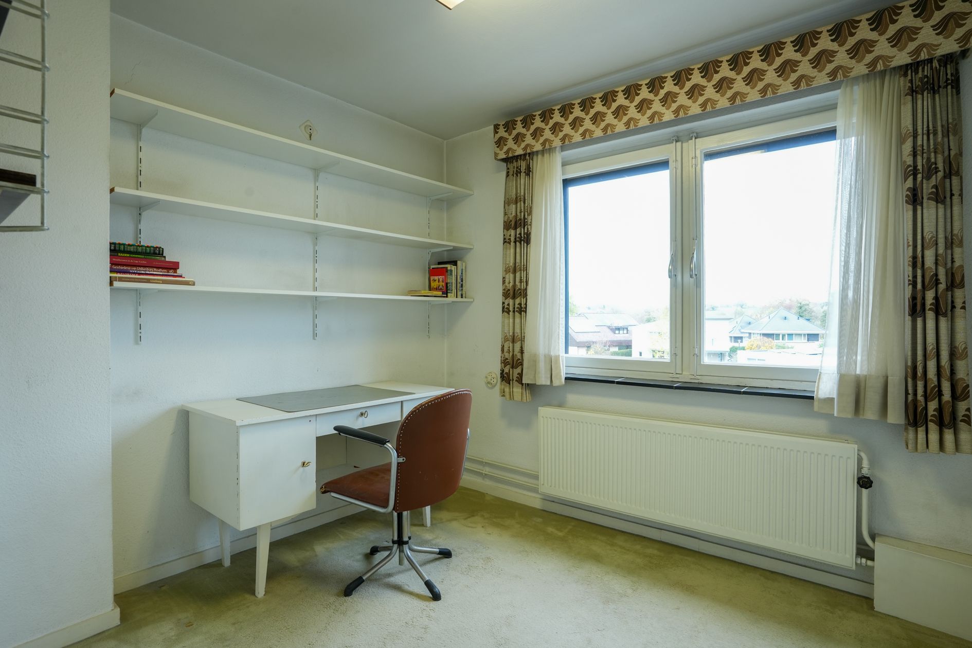 De achterzijde van de woonkamer biedt uitzicht op de ruime achtertuin. Halfopen keuken met inbouwapparatuur.