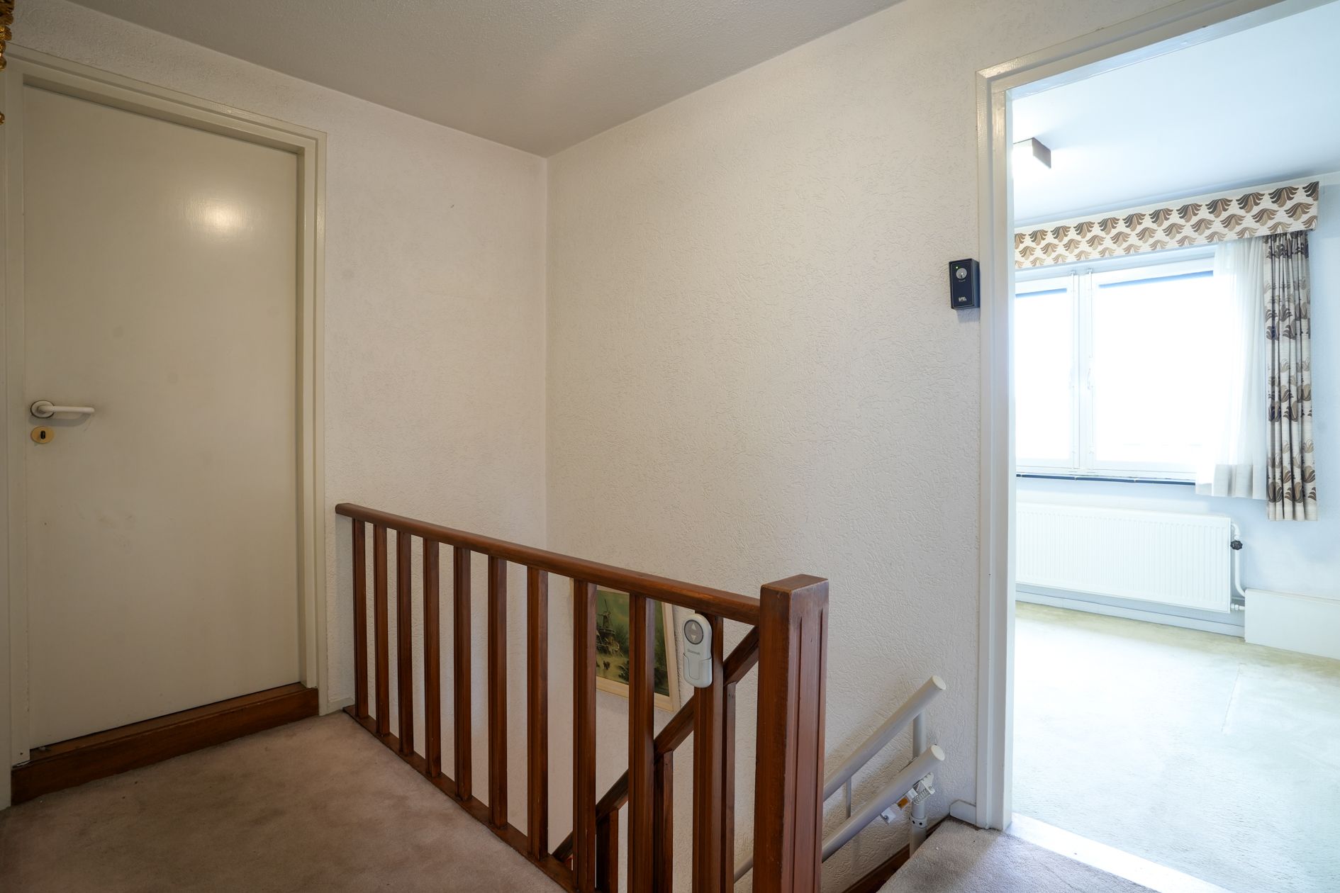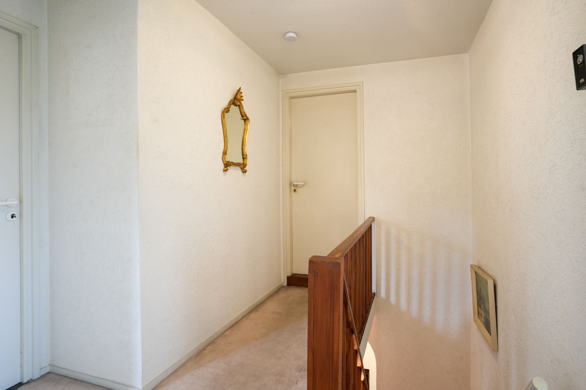 Houten trap naar de verdieping met drie slaapkamers, een bergzolder die omgevormd kan worden tot slaapkamer, badkamer en overloop.