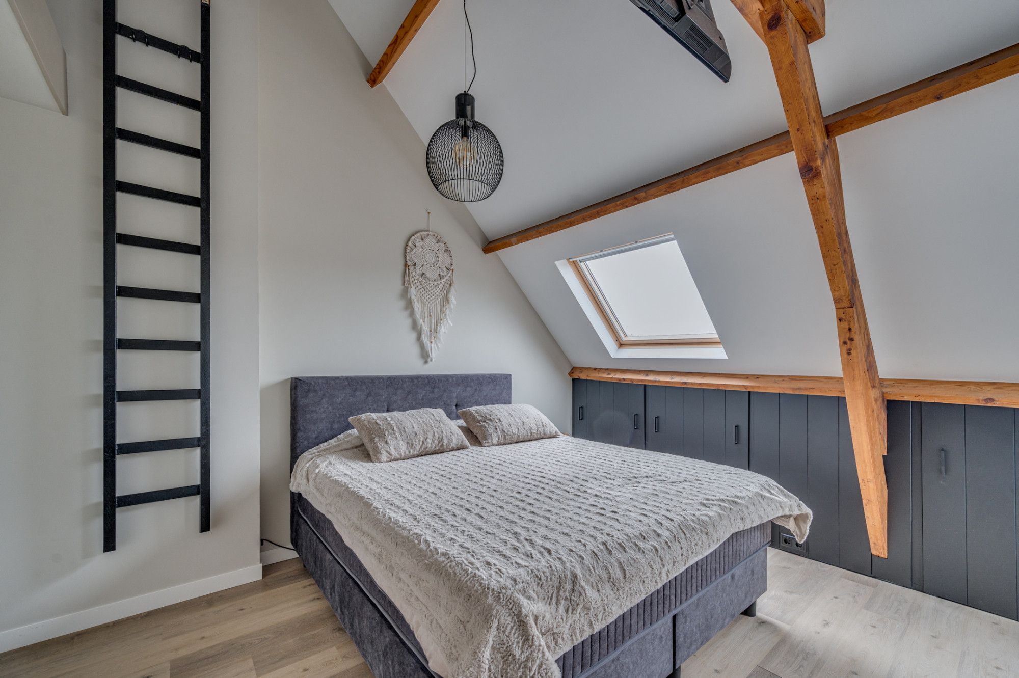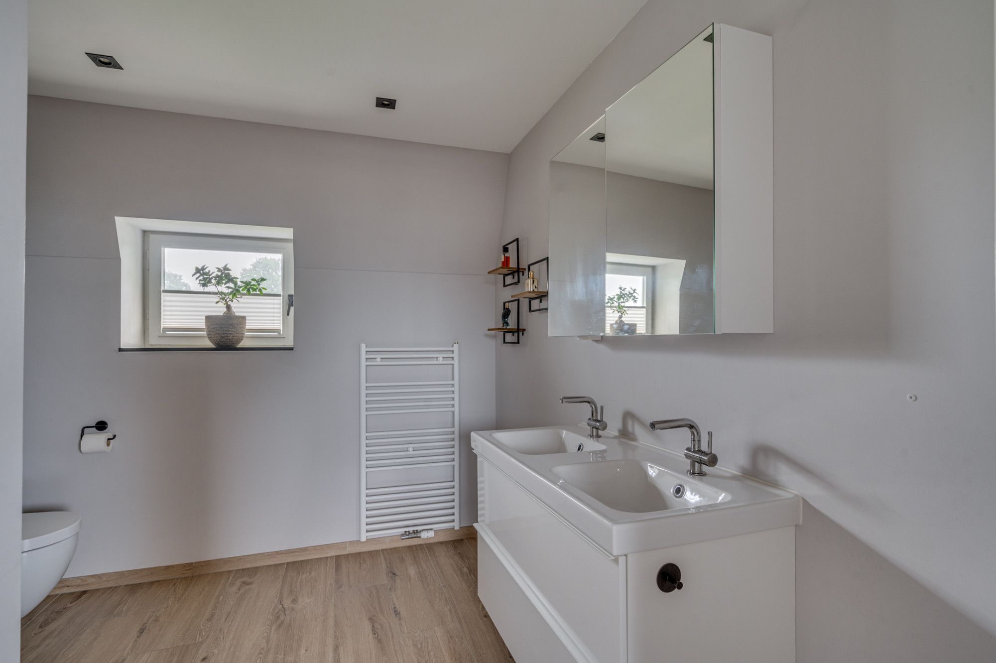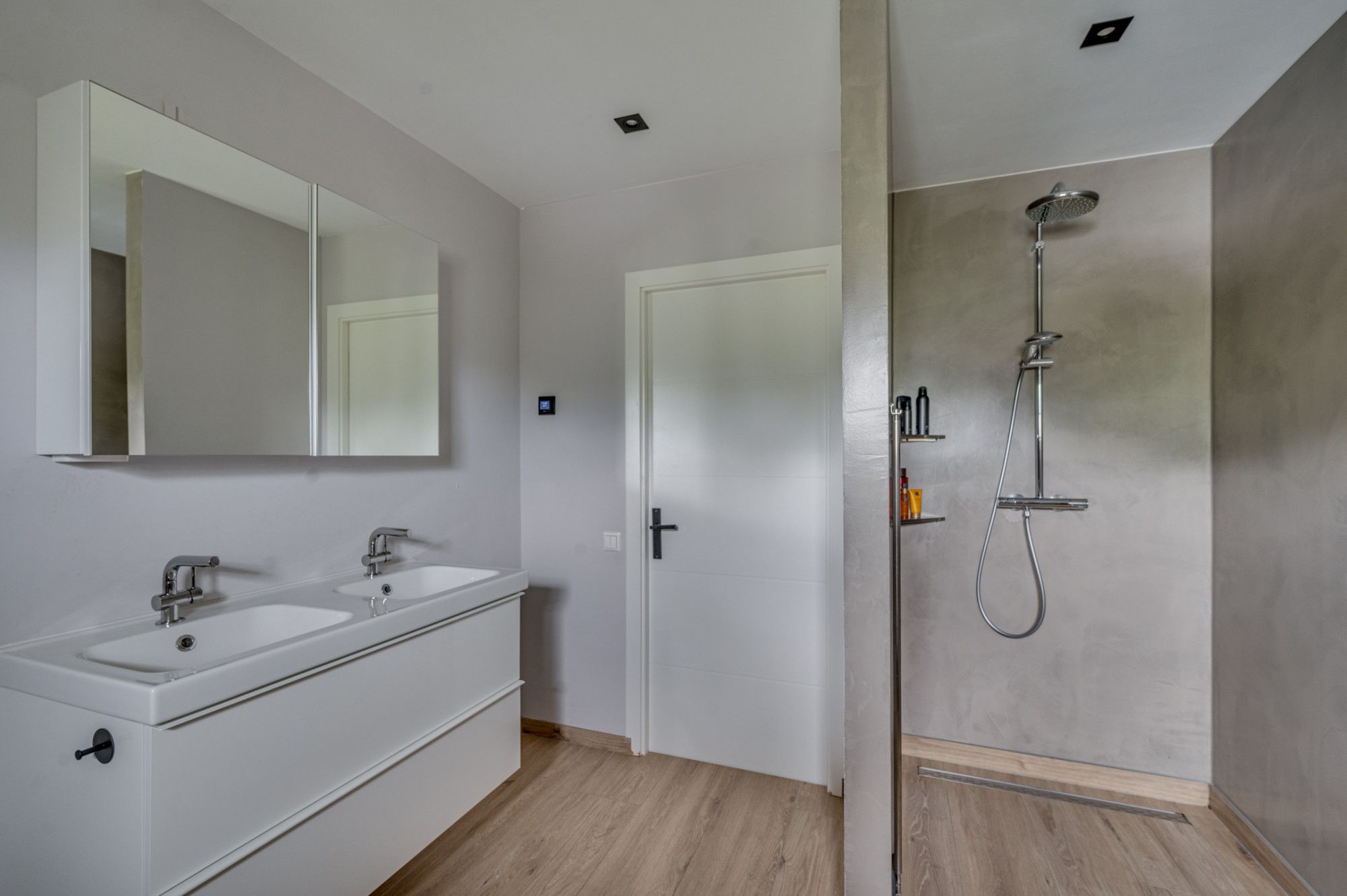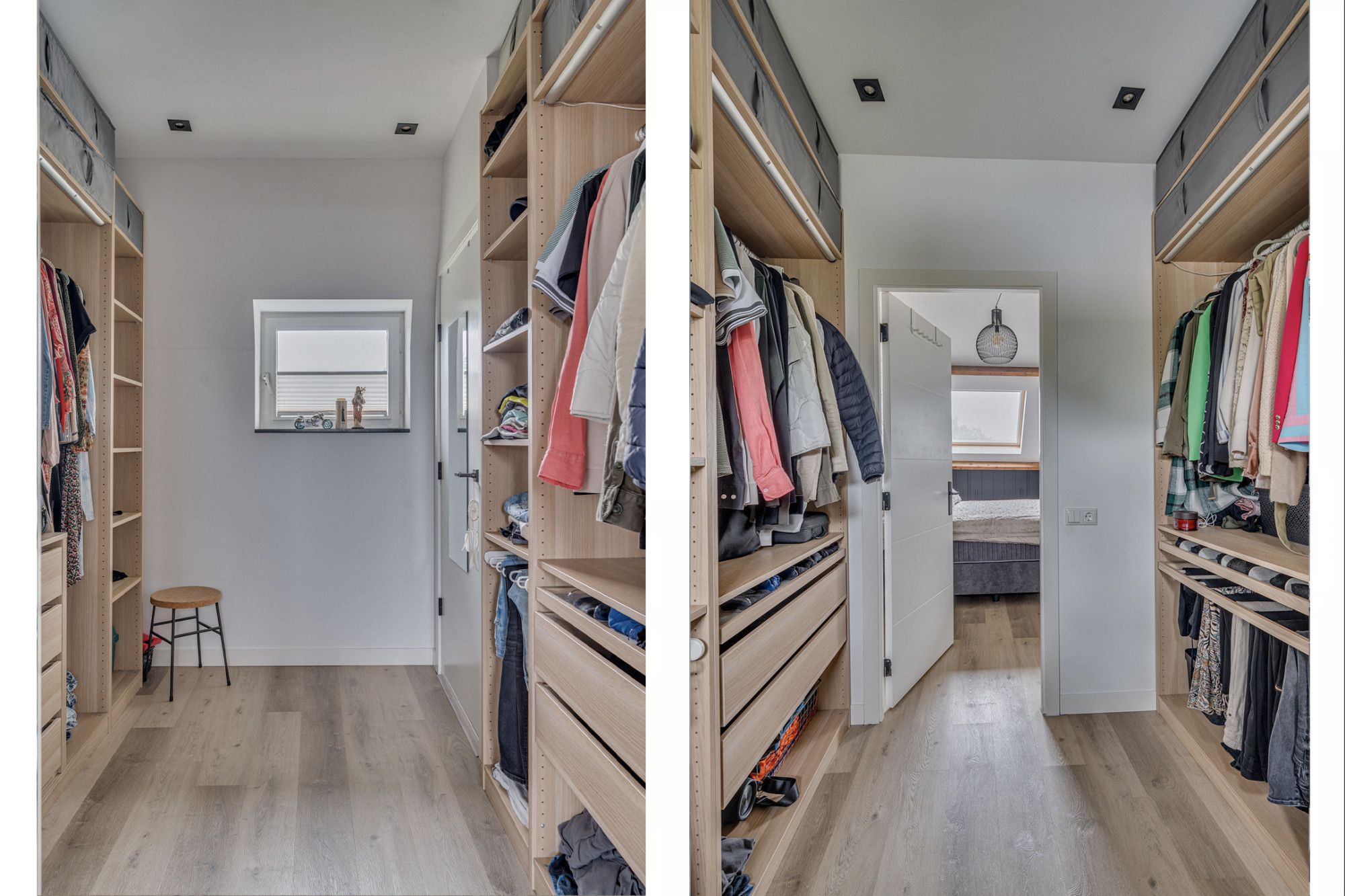 De overloop geeft toegang tot de 3e slaapkamer (ca. 18, m2). De slaapkamer is voorzien van een laminaatvloer, airco en 2 Velux dakramen. Met een losse trap toegang tot de ruime vliering. Tevens is op de 2e verdieping een luxe en geheel betegelde badkamer met vloerverwarming, inloop douche, dubbele wastafel met wastafelmeubel. Ook is er nog een ruime inloopkast (ca. 9m2) aanwezig.