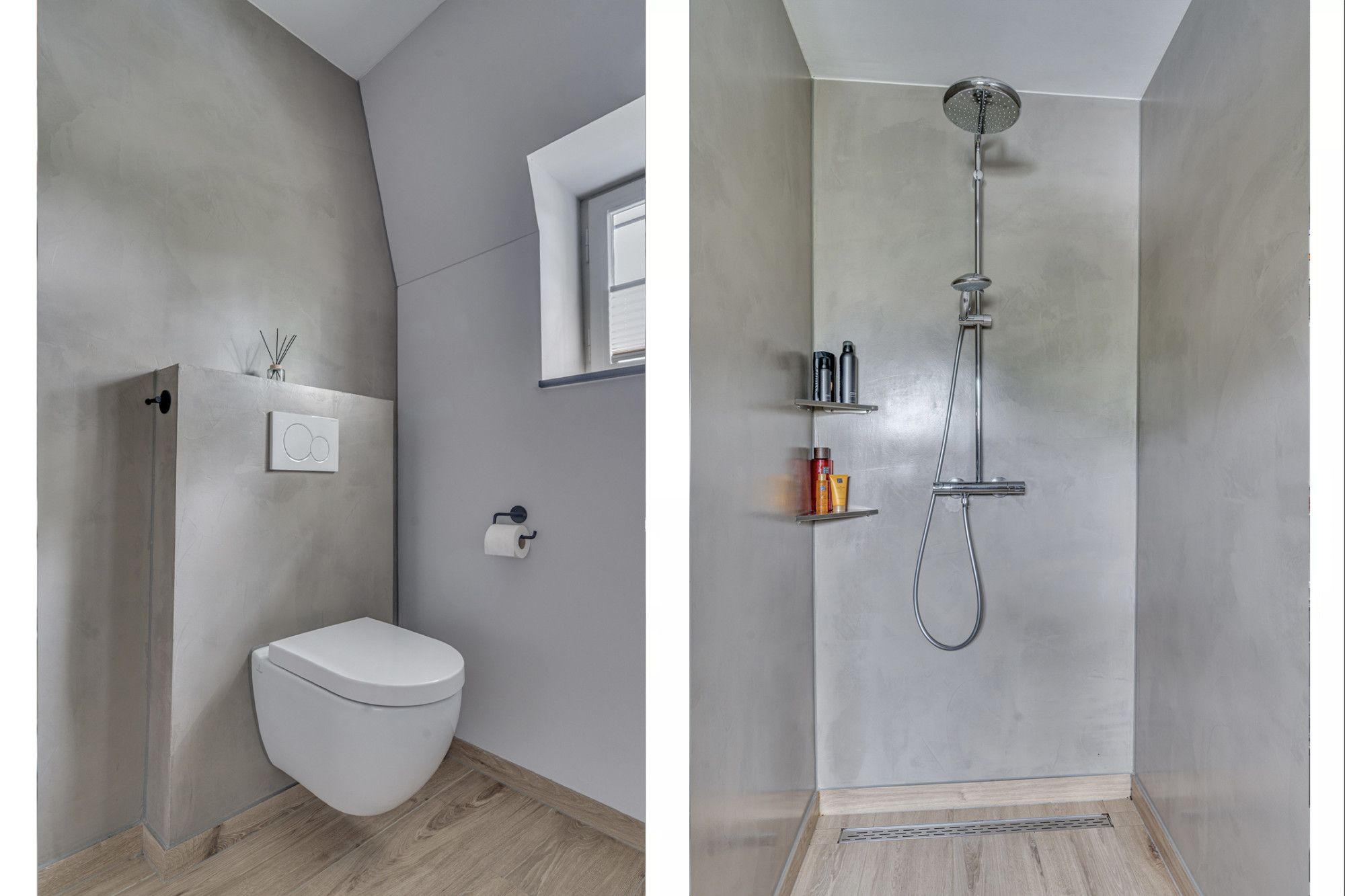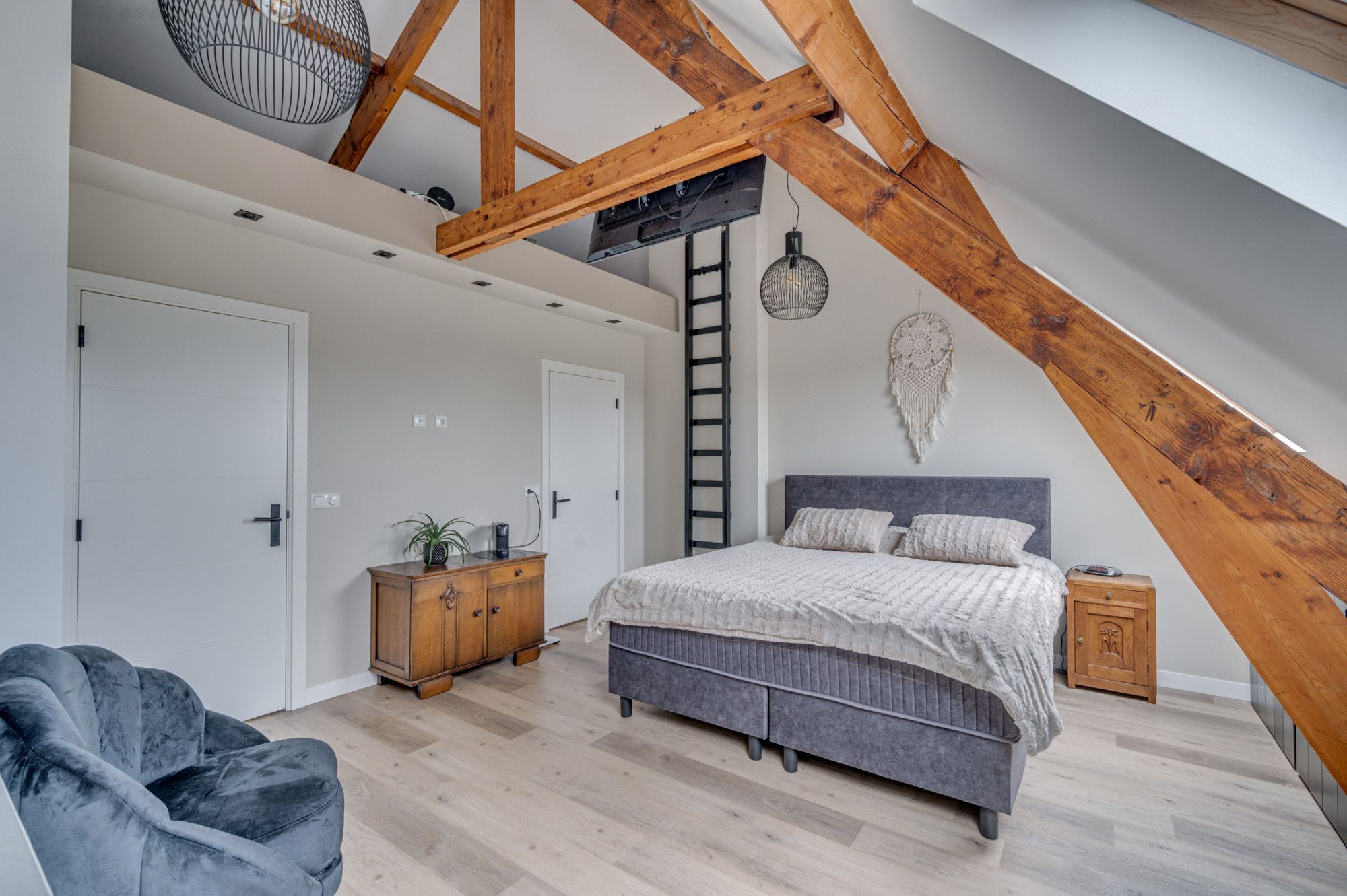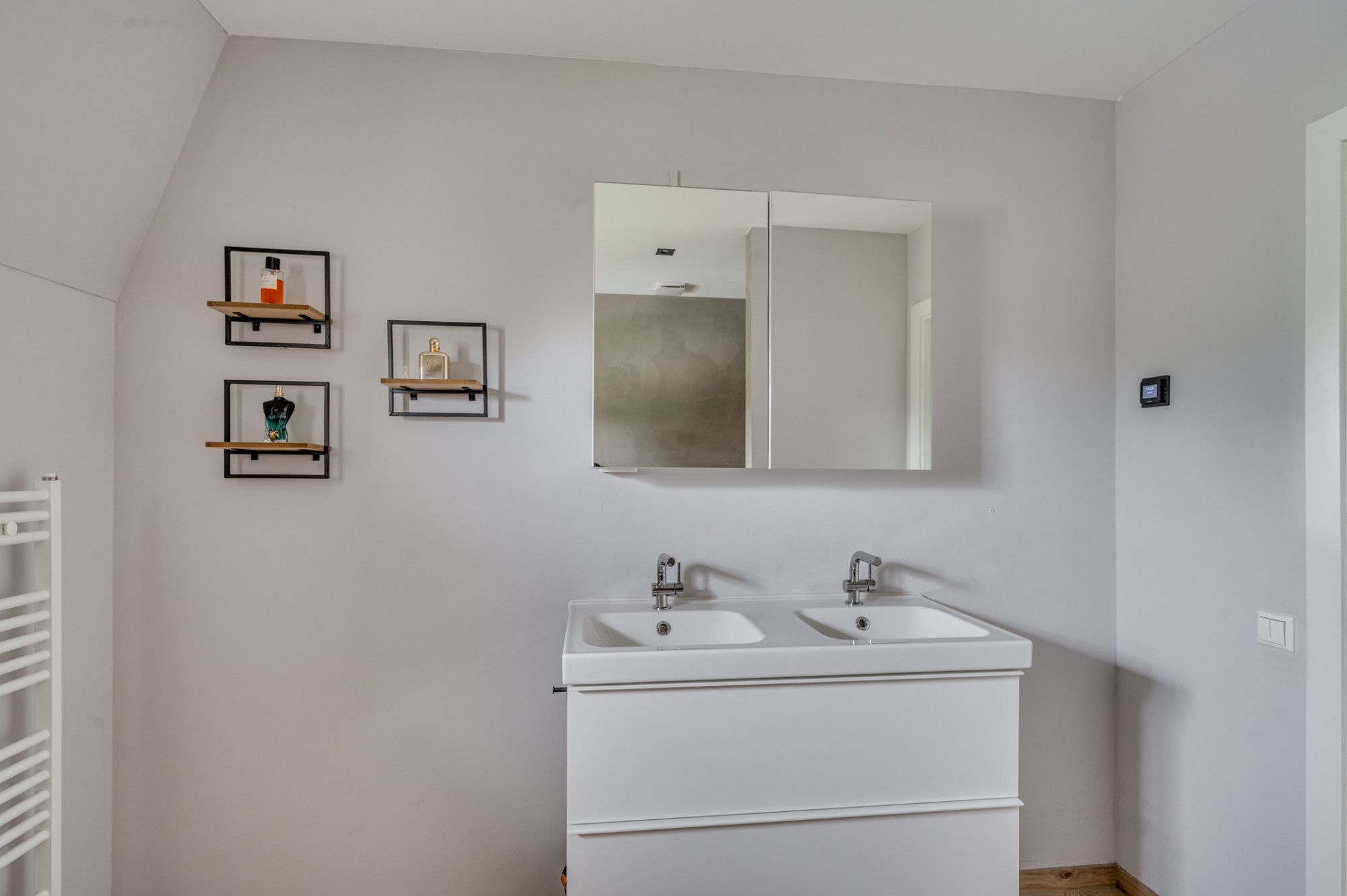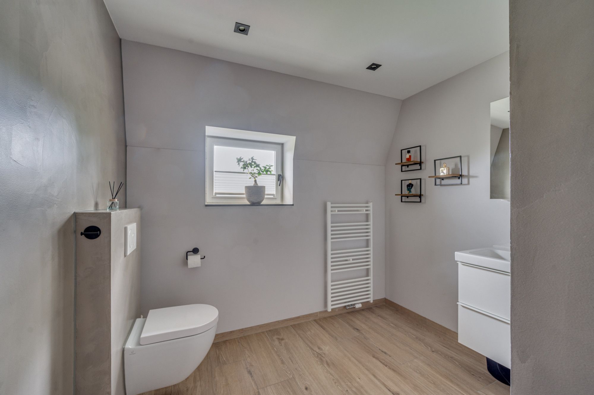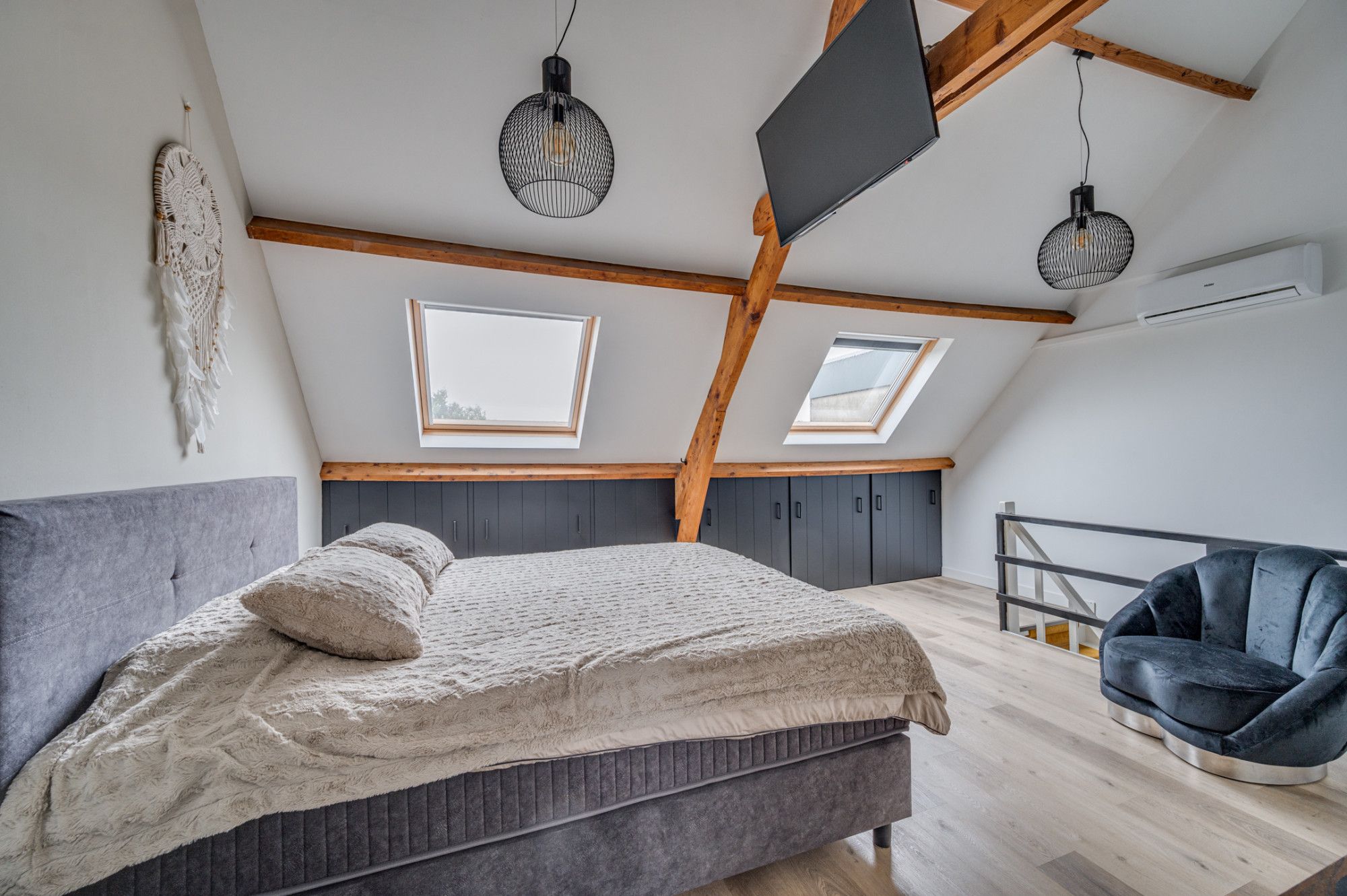 De overloop geeft toegang tot de 3e slaapkamer (ca. 18, m2). De slaapkamer is voorzien van een laminaatvloer, airco en 2 Velux dakramen. Met een losse trap toegang tot de ruime vliering. Tevens is op de 2e verdieping een luxe en geheel betegelde badkamer met vloerverwarming, inloop douche, dubbele wastafel met wastafelmeubel. Ook is er nog een ruime inloopkast (ca. 9m2) aanwezig.