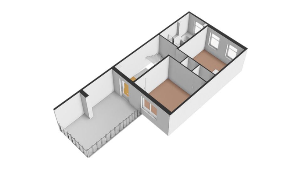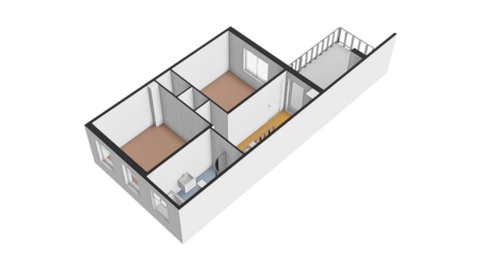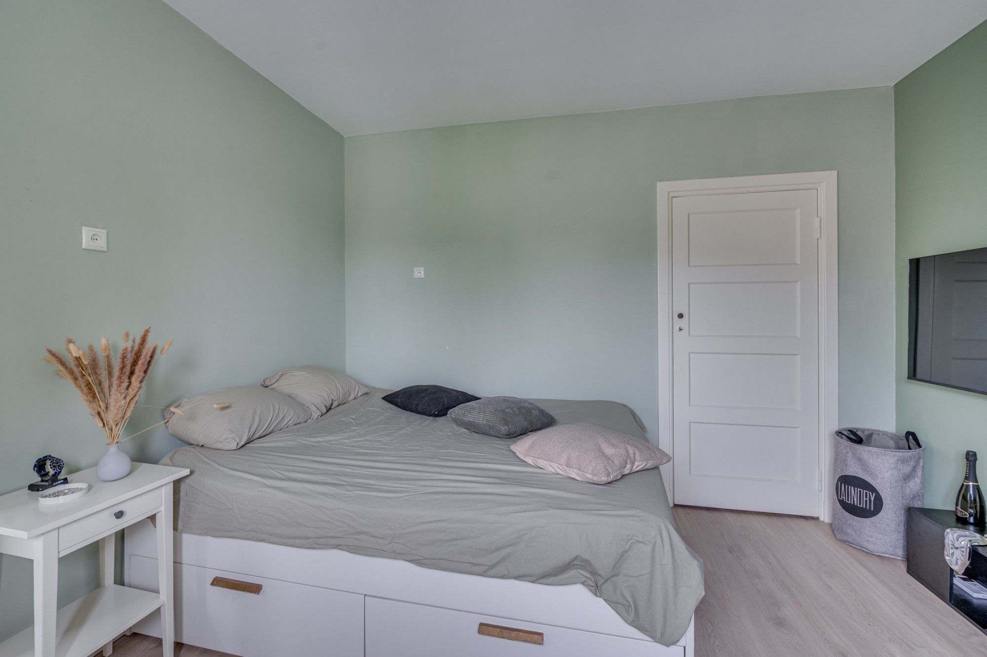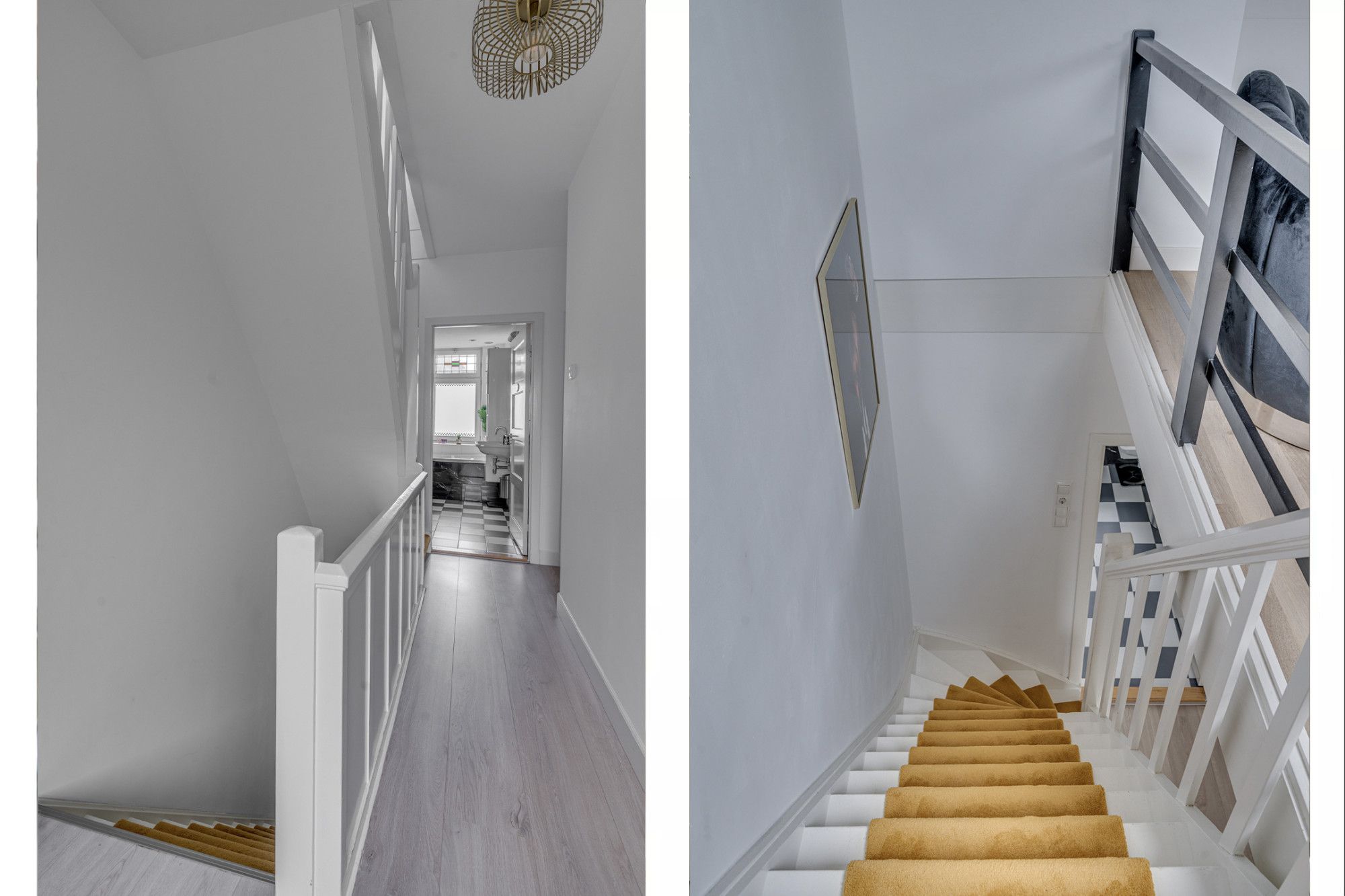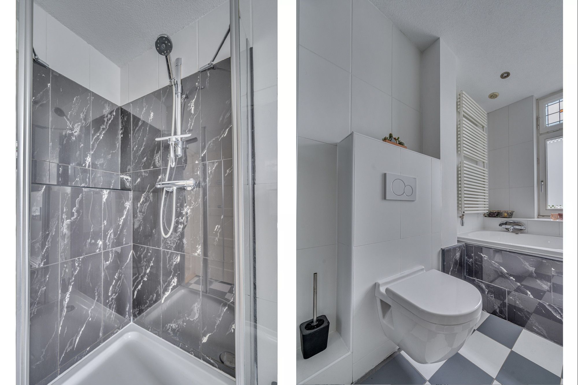 De overloop geeft toegang tot 2 slaapkamers met muurkasten, de badkamer, het dakterras en de trapopgang naar de 2e verdieping. De slaapkamers zijn (ca. 12m2 en 12,60m2) en beide voorzien van een laminaatvloer, gestuukte wanden en muurkasten. De geheel betegelde badkamer is ingericht met een ligbad, aparte douchecabine, vaste wastafel en een zwevend toilet. Het dakterras is ca.16m2 groot.