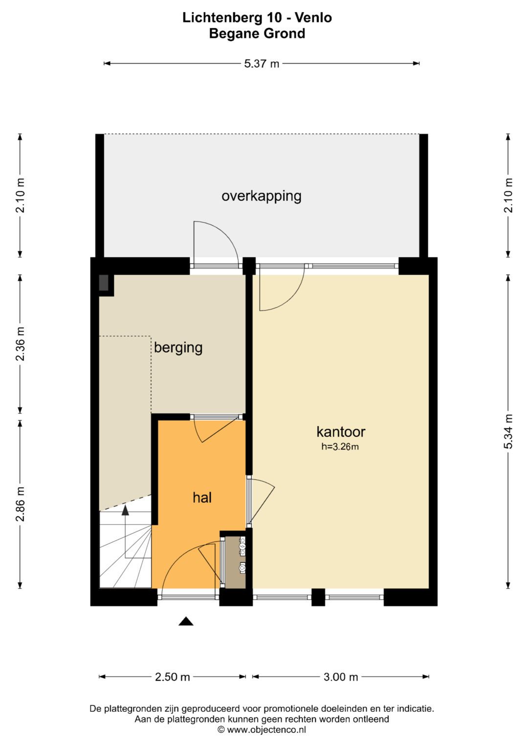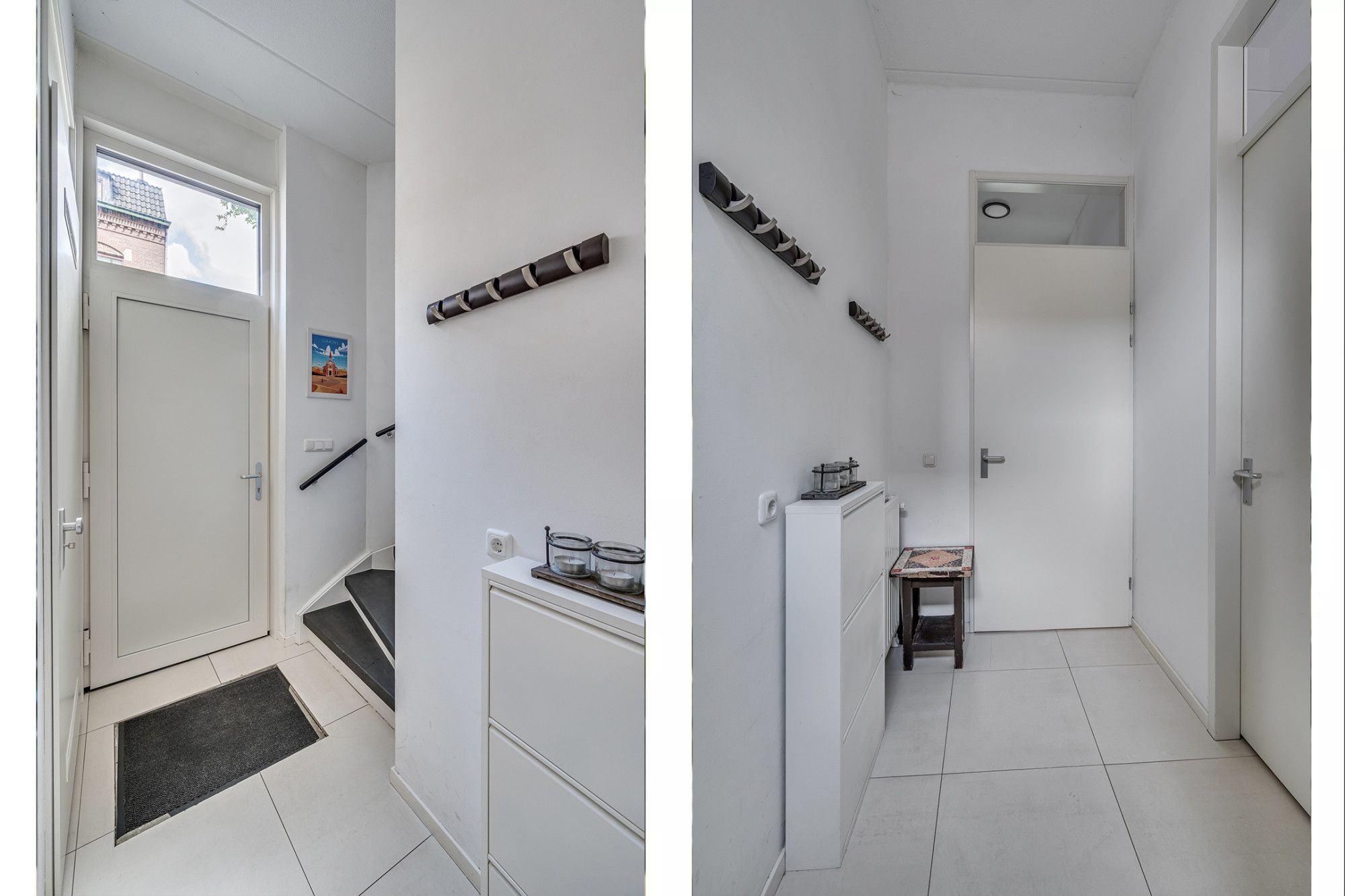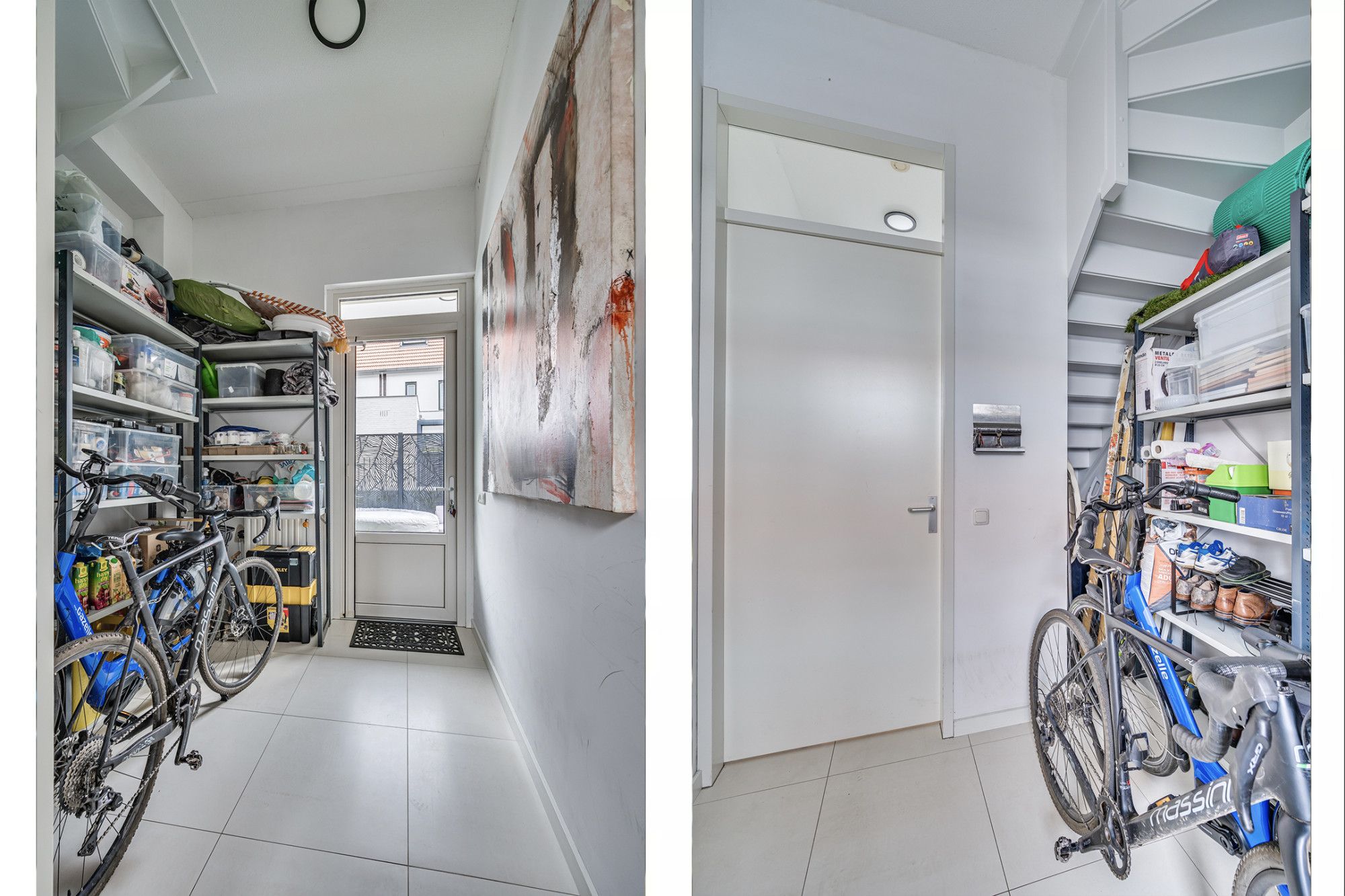 De entree/ hal is voorzien van een tegelvloer. De kamer aan de rechterzijde van de woning is nu in gebruik als kantoorruimte, maar kan ook dienen als extra slaapkamer, atelier enz. De inpandige berging is ruim van opzet en geeft de mogelijkheid tot fietsenberging en extra opslagruimte. Hier is een loopdeur naar de tuin.