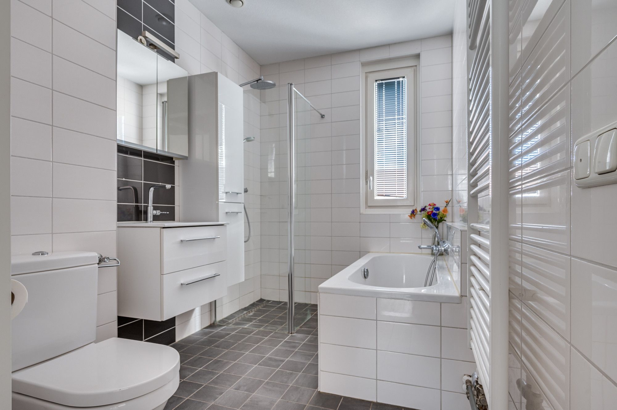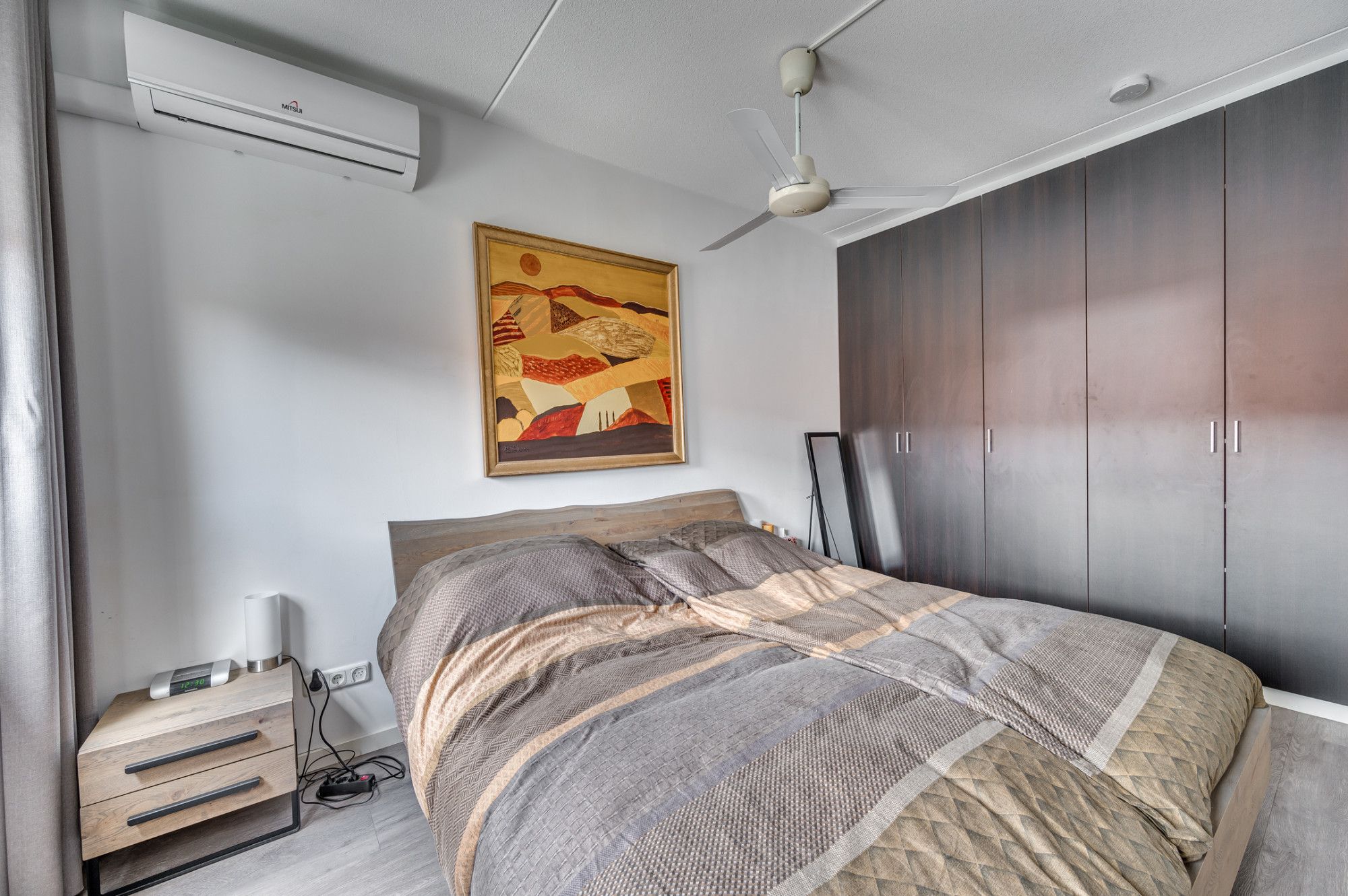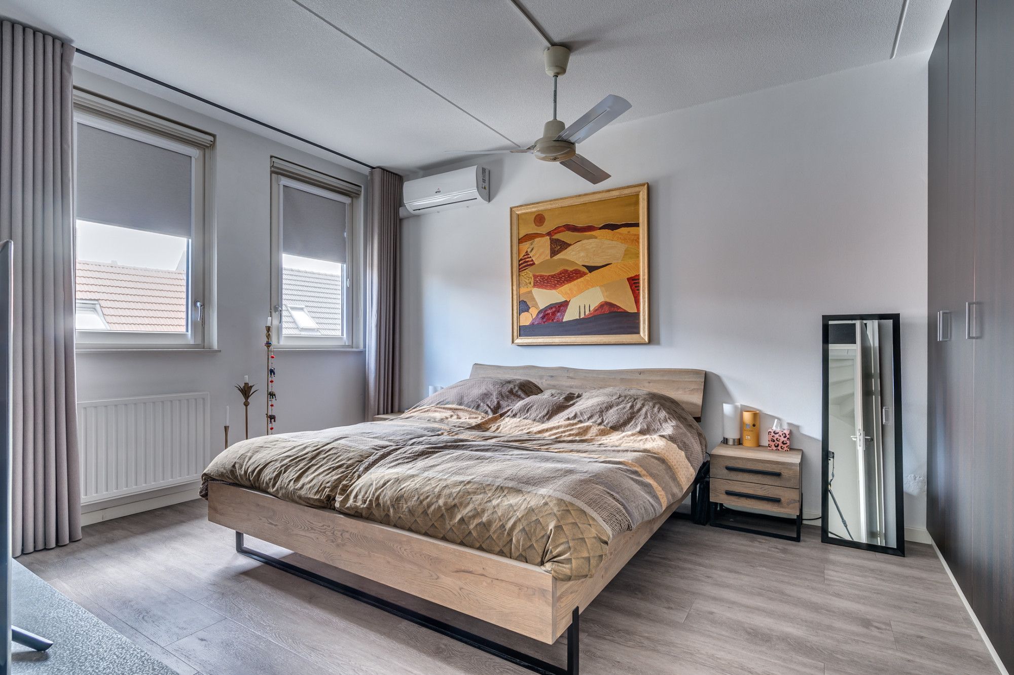 De overloop geeft toegang tot de 2 ruime slaapkamers en badkamer. De overloop en slaapkamers zijn voorzien van een pvc vloer. De slaapkamers zijn ca. 14m² en 9m². De slaapkamer aan de achterzijde is voorzien van een airco. De ruime geheel betegelde badkamer is voorzien van een ligbad met douchefaciliteit, inloopdouche, toilet, designradiator, wastafel met meubel en mechanische ventilatie.