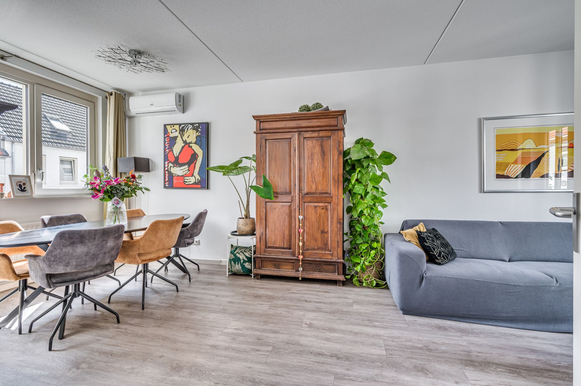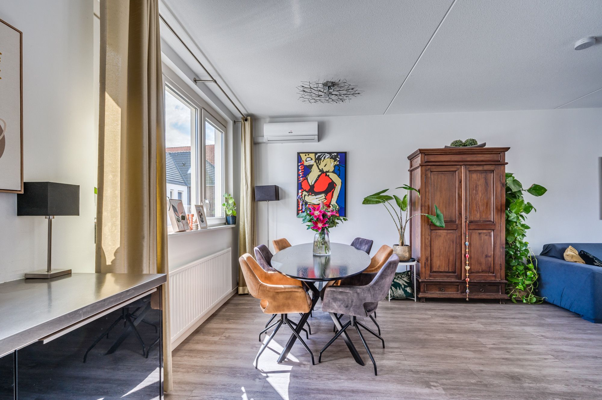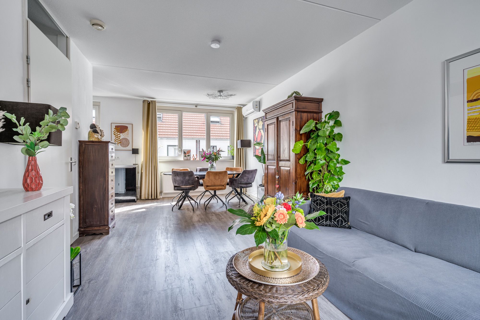 De overloop geeft toegang tot de separate toiletruimte en woonkamer met open keuken. De overloop en woonkamer zijn voorzien van een pvc vloer. De lichte doorzonwoonkamer (ca. 26m²) heeft veel lichtinval door de grote raampartijen aan de voor en achterzijde. Aan de voorzijde is de tv met bank gepositioneerd en aan de achterzijde nabij de keuken is de eethoek te vinden waar tevens de airco gepositioneerd is. De keuken is voorzien van een 4-pits gasfornuis, elektrische grillplaat, vaatwasser, afzuigkap, Quooker, koelkast en muurkast met elektriciteit en licht. De half betegelde toiletruimte is voorzien van een staand toilet, fontein en mechanische ventilatie.