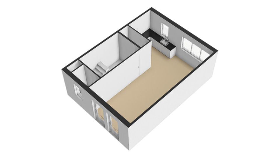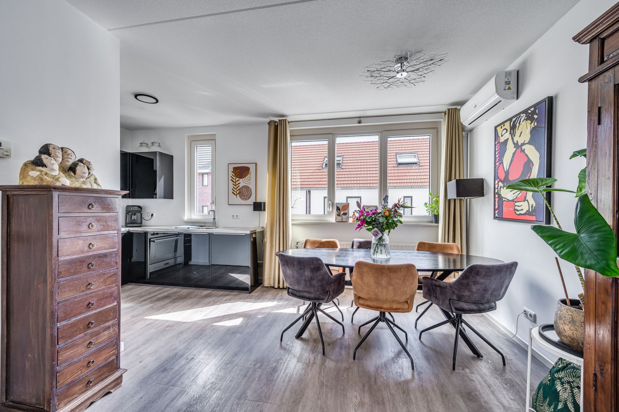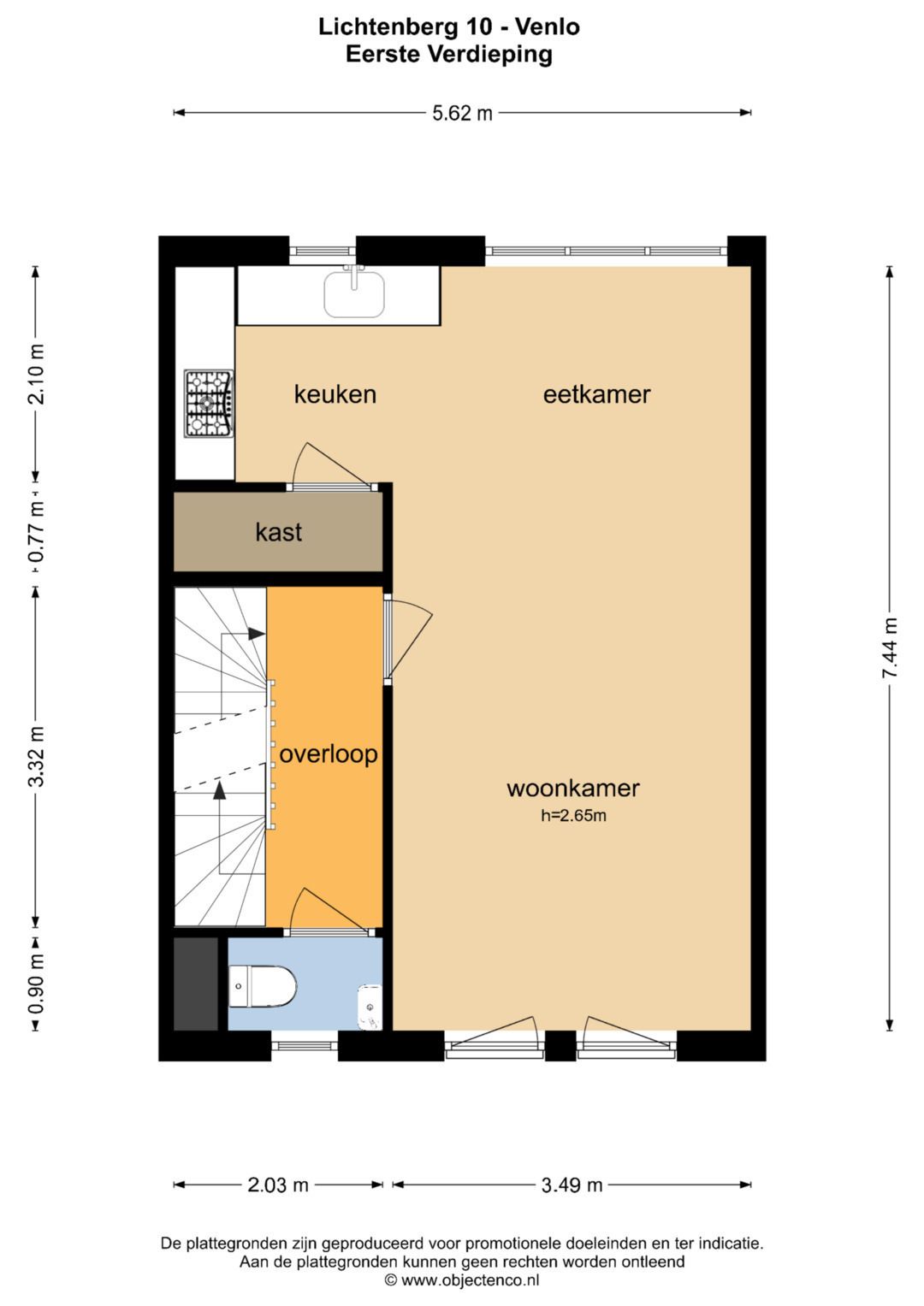 De overloop geeft toegang tot de separate toiletruimte en woonkamer met open keuken. De overloop en woonkamer zijn voorzien van een pvc vloer. De lichte doorzonwoonkamer (ca. 26m²) heeft veel lichtinval door de grote raampartijen aan de voor en achterzijde. Aan de voorzijde is de tv met bank gepositioneerd en aan de achterzijde nabij de keuken is de eethoek te vinden waar tevens de airco gepositioneerd is. De keuken is voorzien van een 4-pits gasfornuis, elektrische grillplaat, vaatwasser, afzuigkap, Quooker, koelkast en muurkast met elektriciteit en licht. De half betegelde toiletruimte is voorzien van een staand toilet, fontein en mechanische ventilatie.