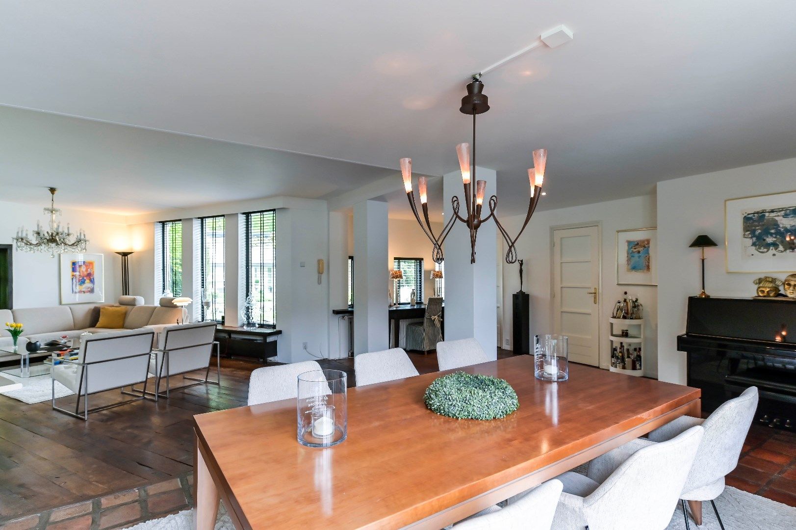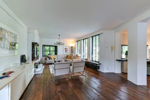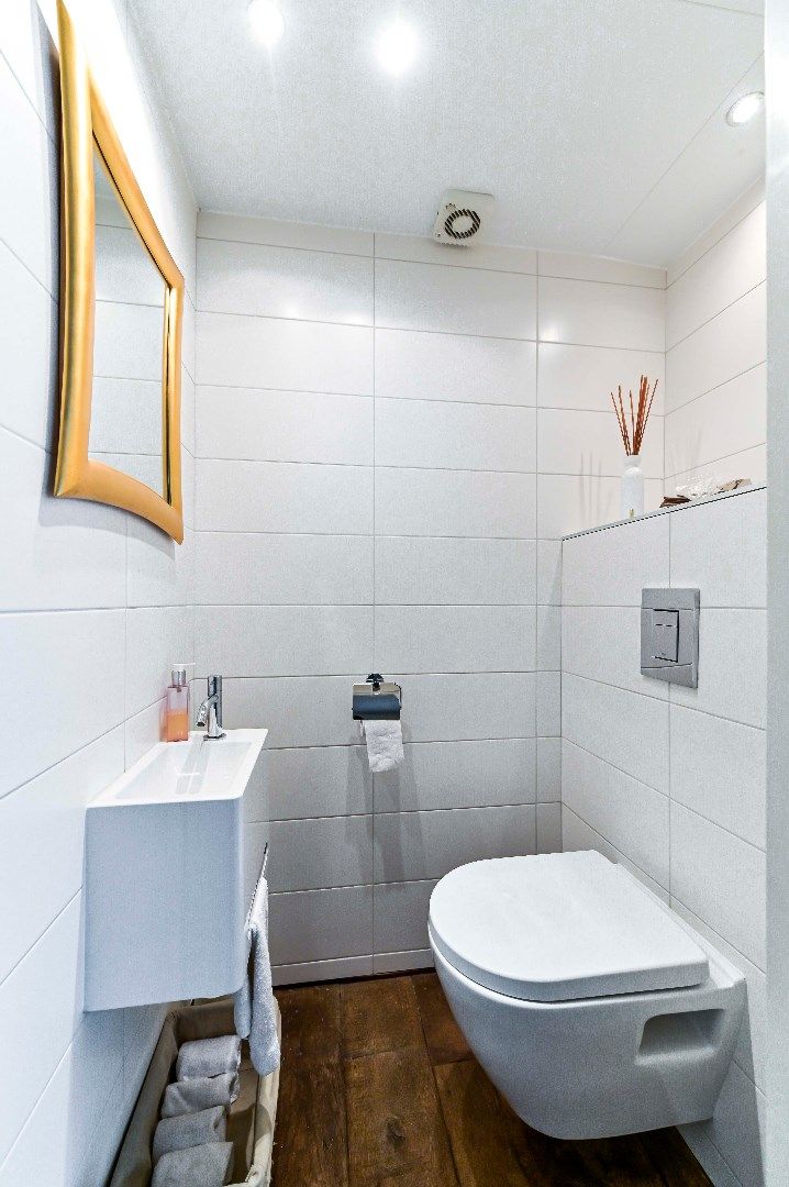 Begane grond: Entree met tegelvloer en garderobe. Zwevend toilet met fonteintje. De ruime woonkamer (ca. 60 m²) met openhaard (gas/ digitaal) is deels voorzien van een authentieke massieve eiken vloer en deels van een tegelvloer. Via een schuifpui is er directe toegang tot de tuin. De airco (2022) in de woonkamer kan zowel verkoelen als verwarmen.