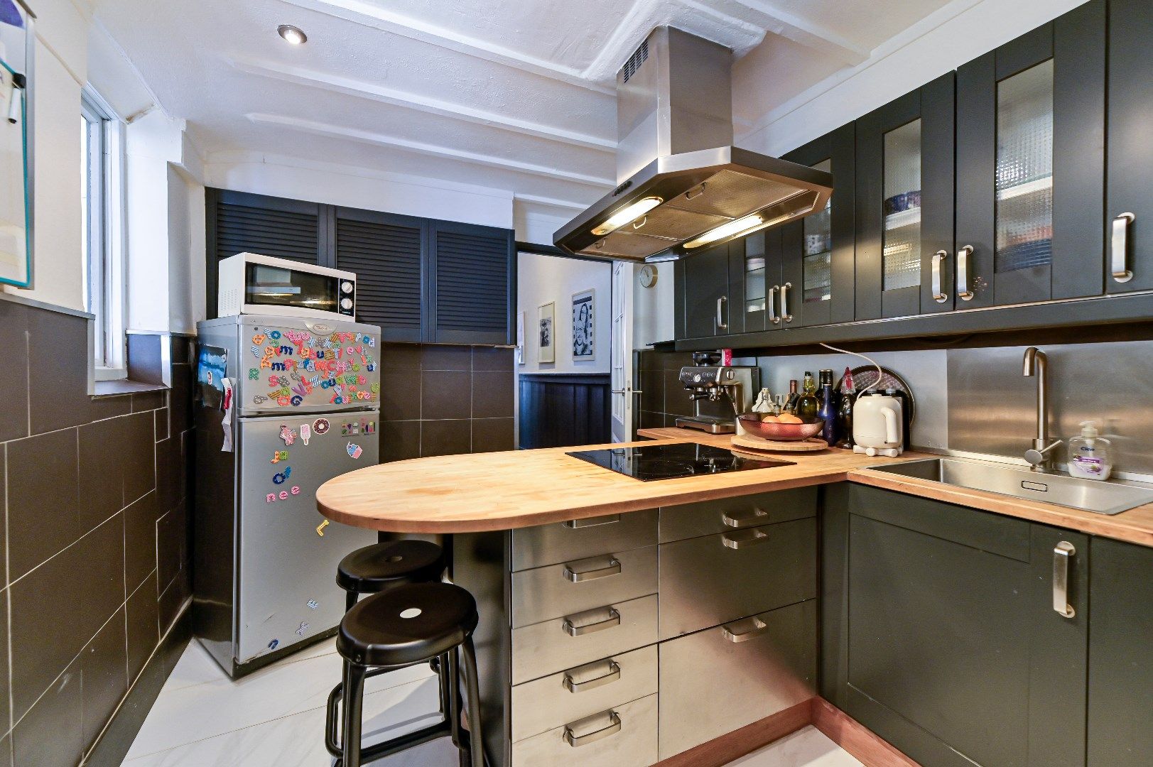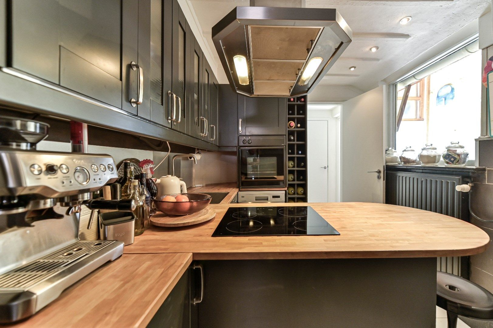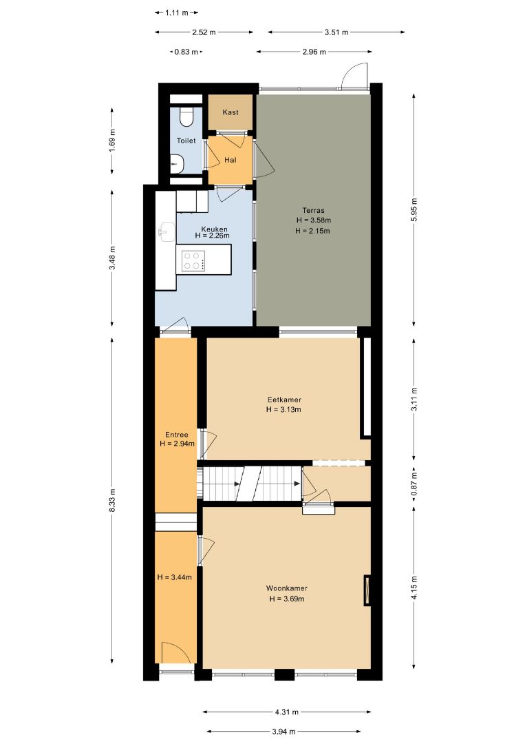 Entree met tegelvloer. Hangend toilet met fonteintje . Zitkamer met laminaatvloer en middels enkele treden te bereiken eetkamer met eveneens laminaatvloer. De aparte keuken is voorzien van houten aanrechtblad, spoelbak, en inbouwapparatuur zoals: 4-pits inductie kookplaat en afzuigkap. In de bijkeuken bevindt zich de aansluiting voor de wasmachine.