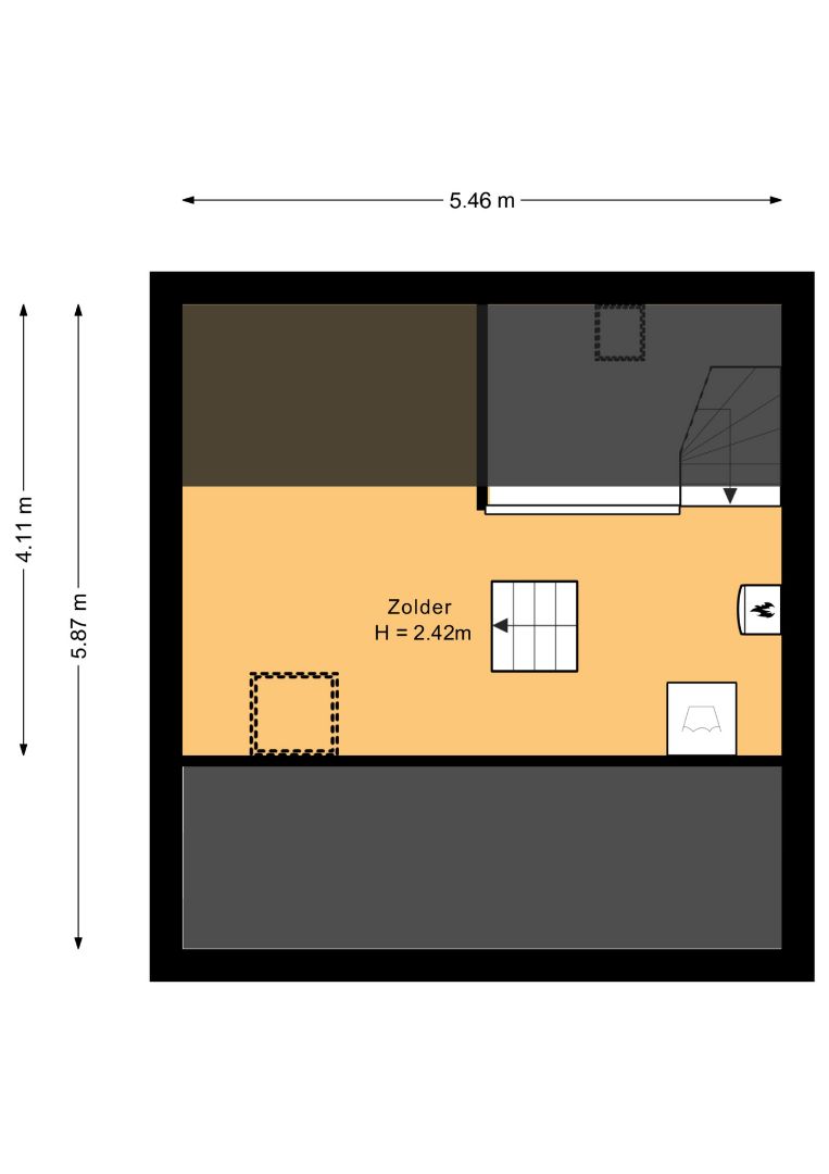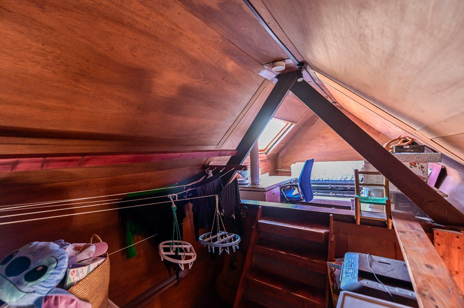 Middels vaste trap te bereiken zolderruimte met CV-opstelling (gehuurde HR Intergas met een huurprijs van €38,57 per maand).