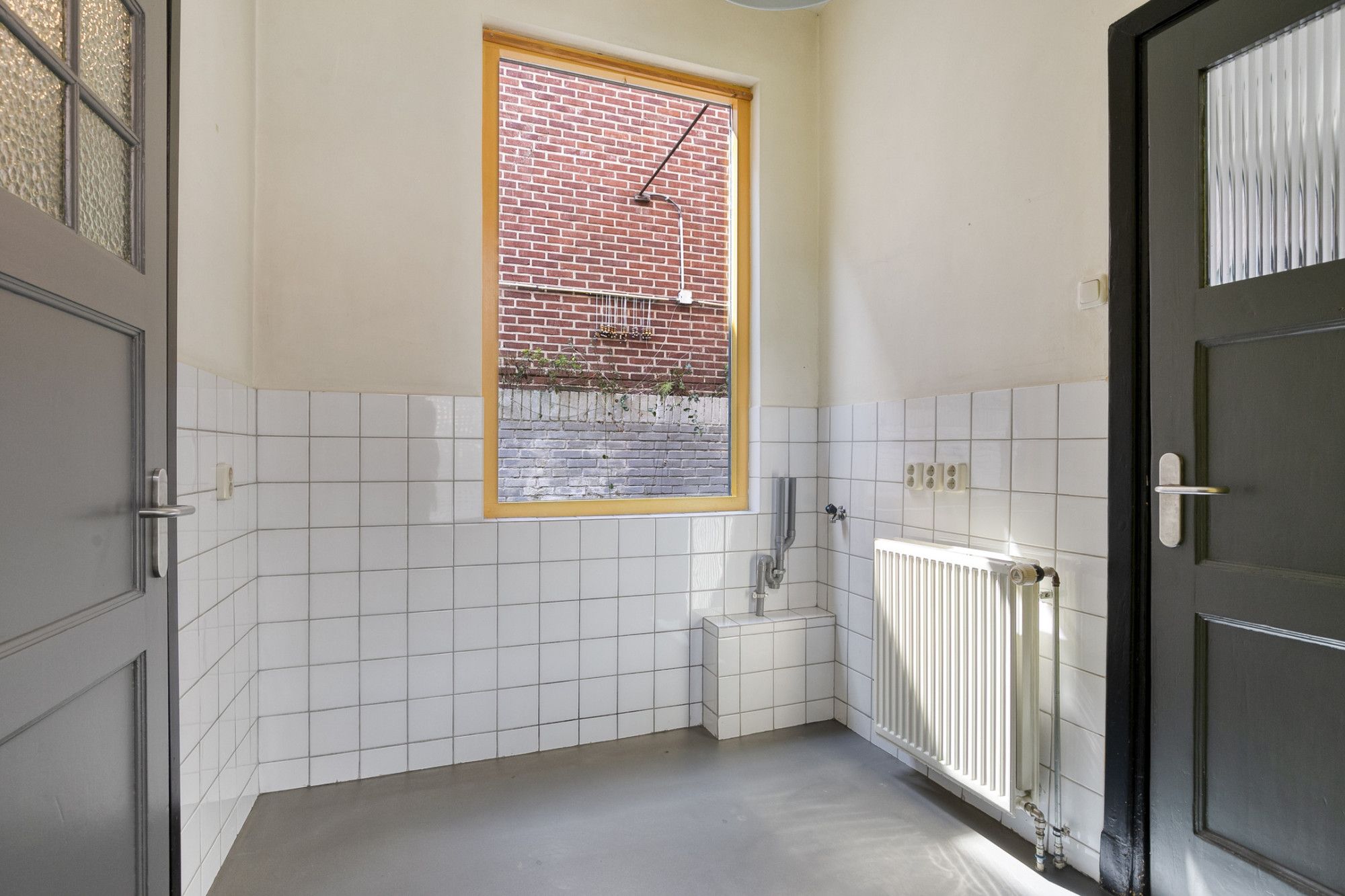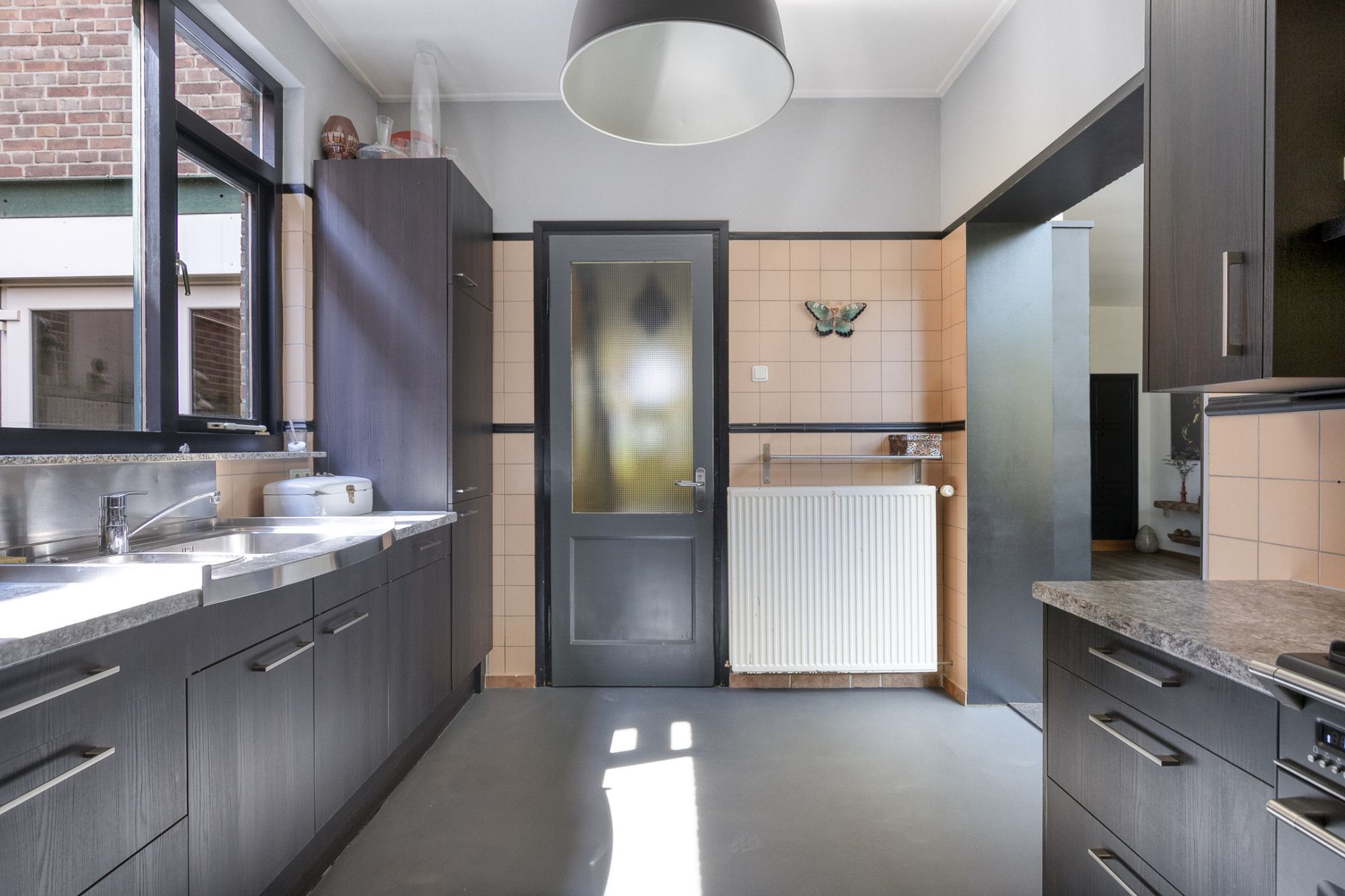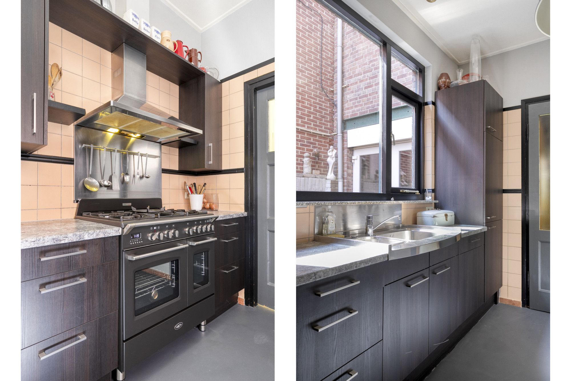 De keuken is voorzien van diverse inbouwapparatuur, waaronder een 8-pits gasfornuis, combi-oven, vaatwasser, koelkast en spoelbak. Vanuit de keuken is er toegang tot een tussenportaal met doorgang naar de tuin, een kast met cv-opstelling, een halfhoog betegeld toilet en de badkamer.