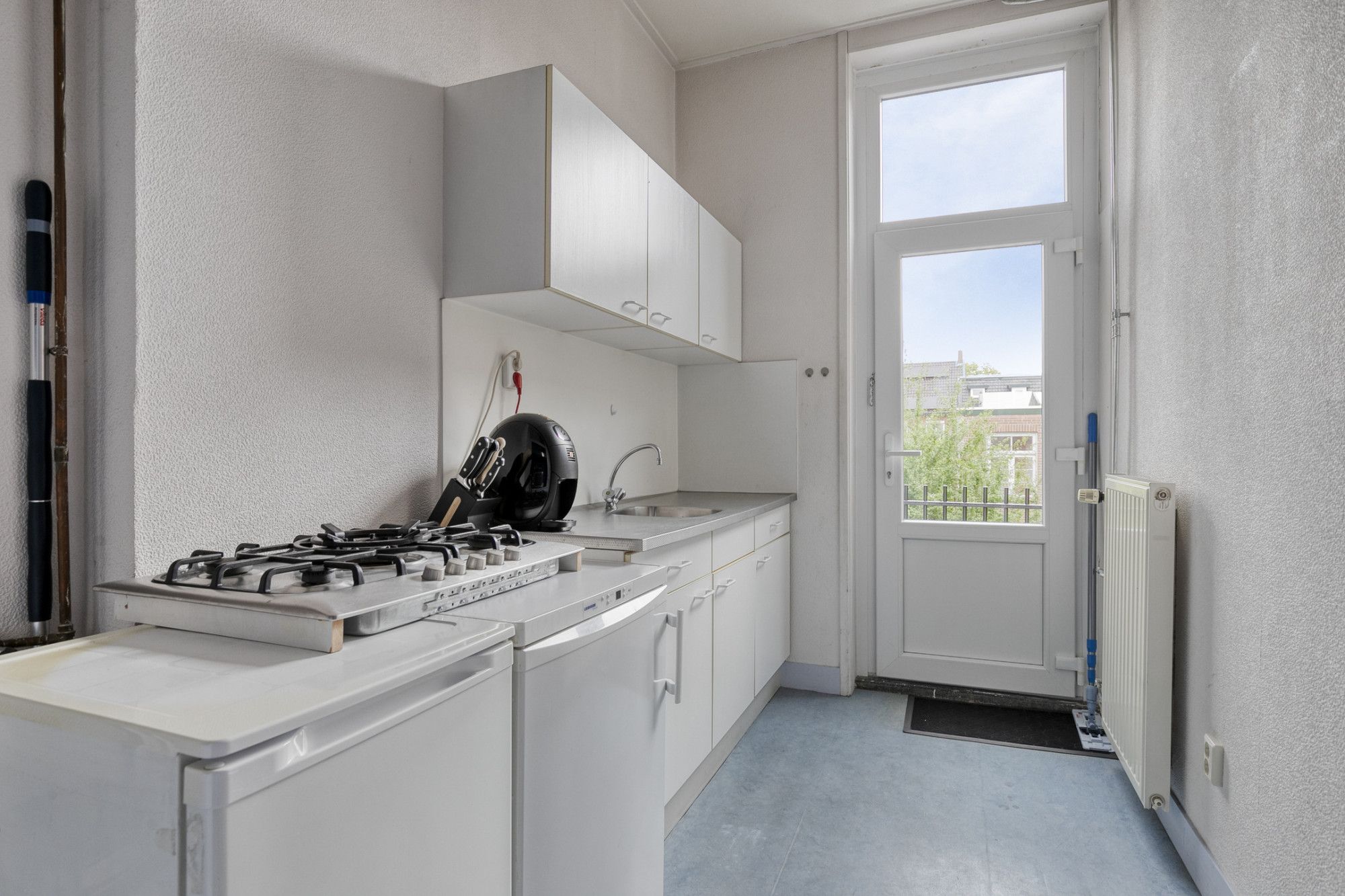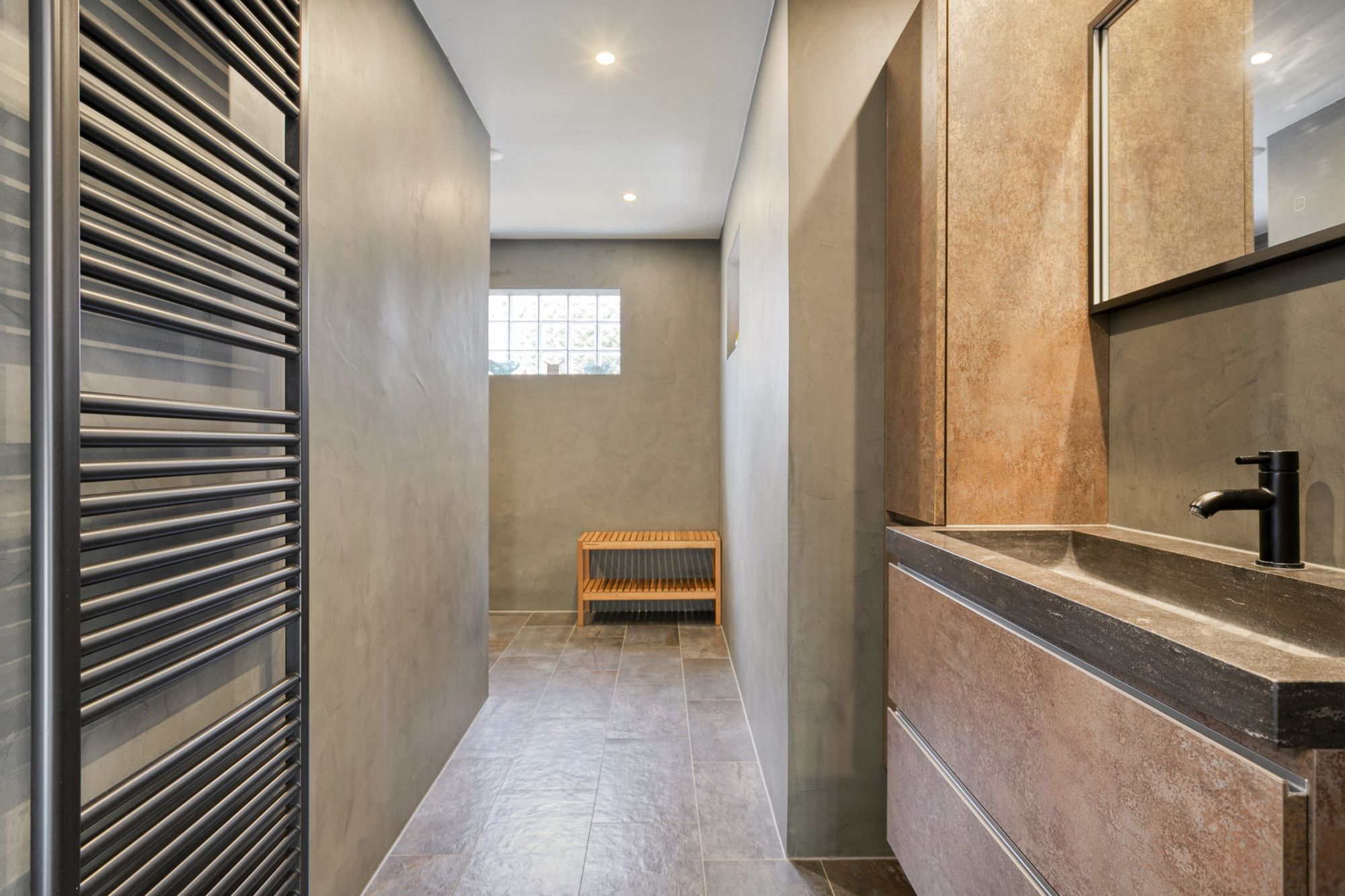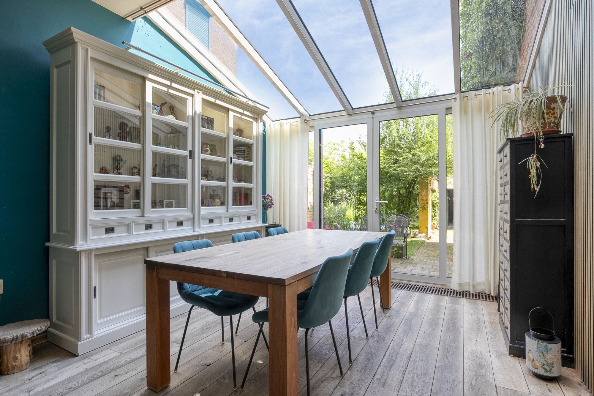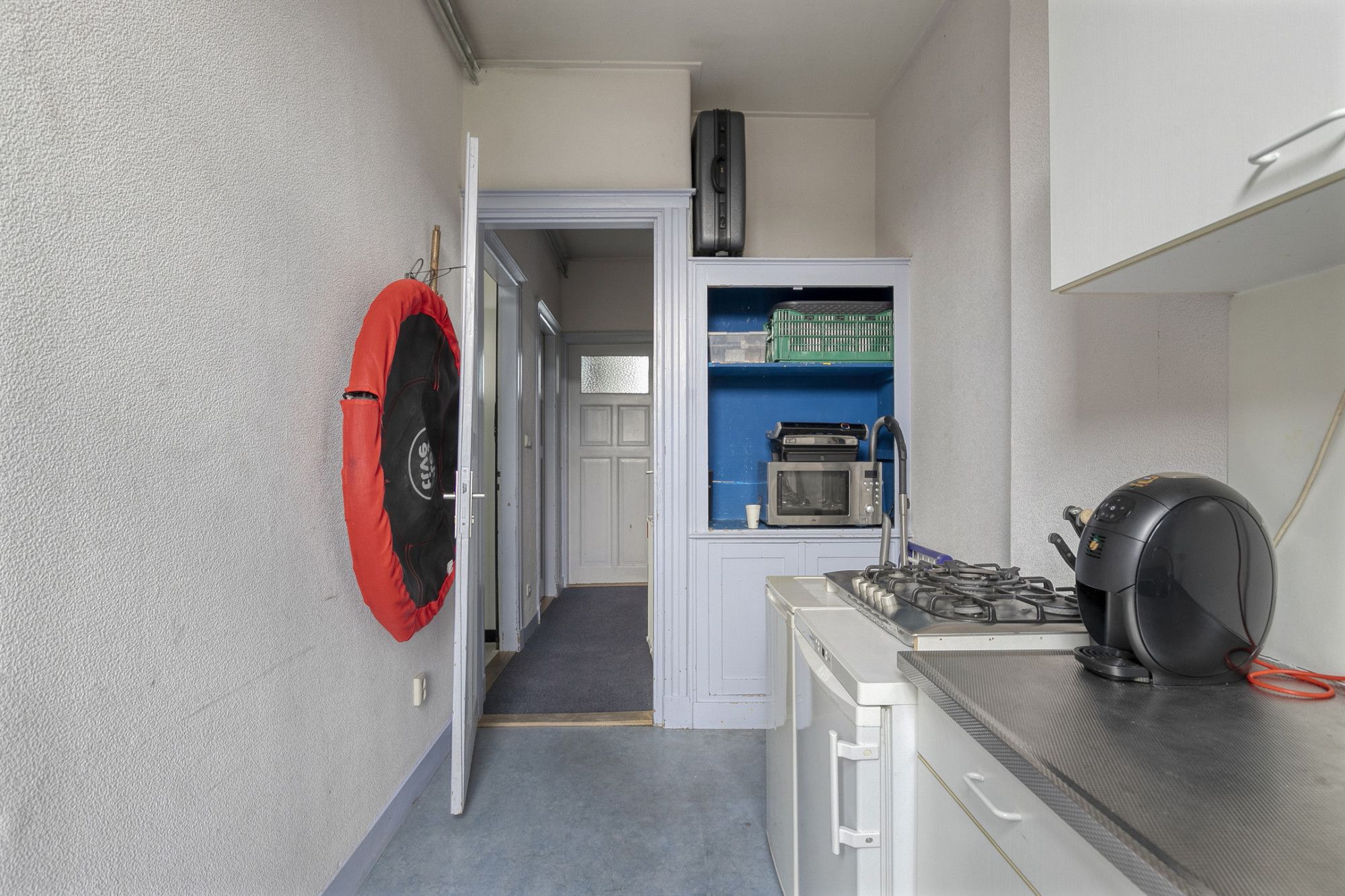 De keuken is voorzien van diverse inbouwapparatuur, waaronder een 8-pits gasfornuis, combi-oven, vaatwasser, koelkast en spoelbak. Vanuit de keuken is er toegang tot een tussenportaal met doorgang naar de tuin, een kast met cv-opstelling, een halfhoog betegeld toilet en de badkamer.